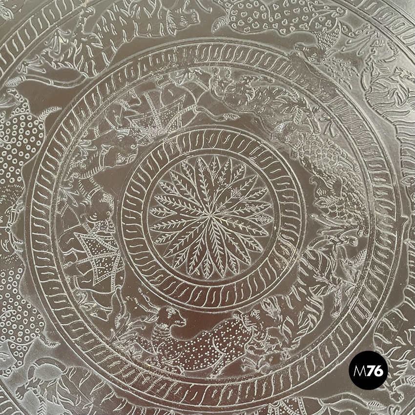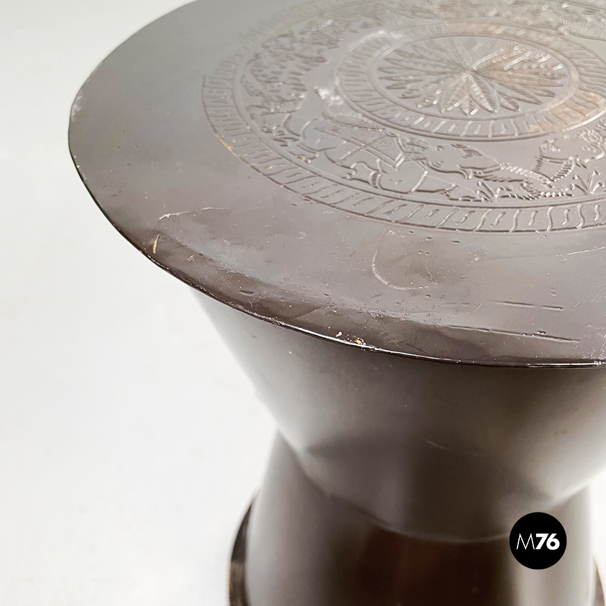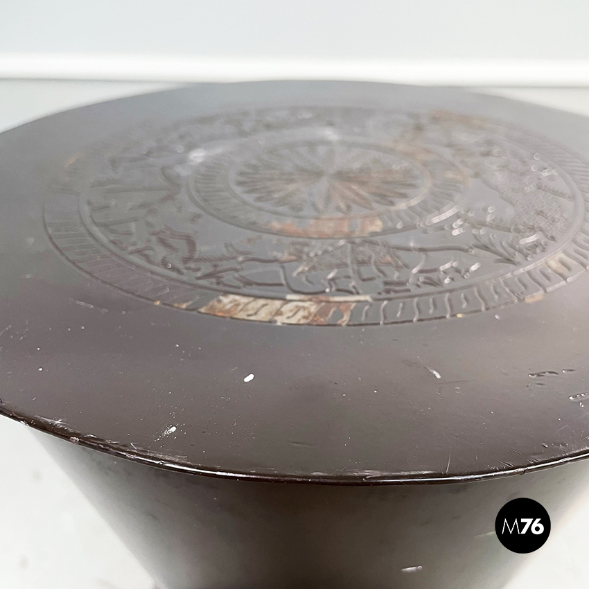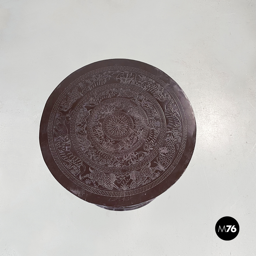 Set composto da un tavolo da caffè e due sgabelli da tavolo tondi in metallo verniciato marrone. Il tavolo e gli sgabelli presentano una forma a clessidra. Sul piano del tavolo e sulle sedute sono preseti dei disegni disposti su cerchi concentrici di animali e piante, di origine indiana. Adatto ad uso esterno come in giardino.