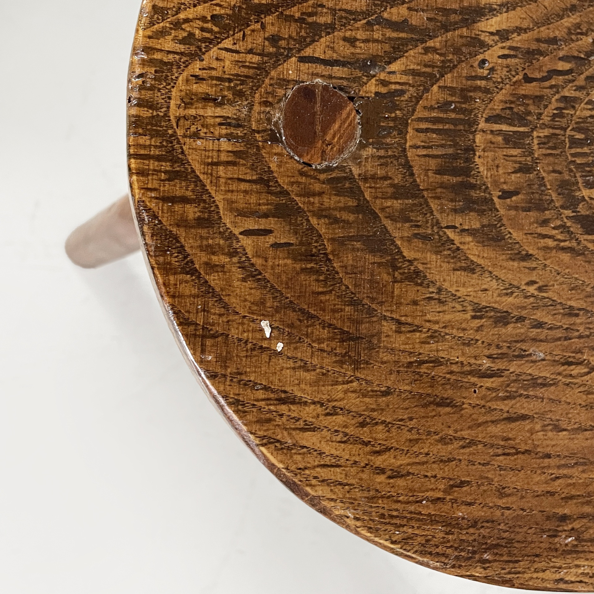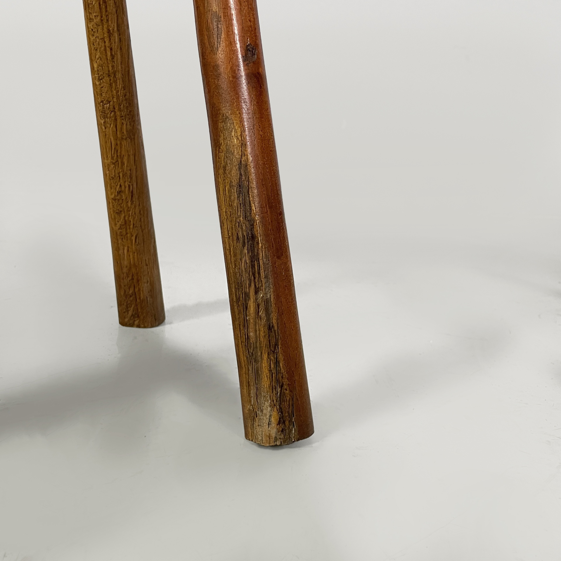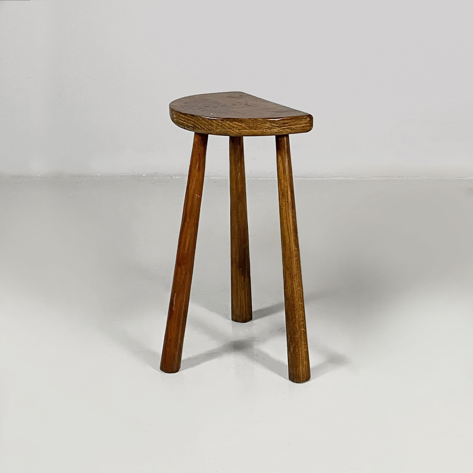 Sgabello da tavolo interamente in legno. La seduta è semicerchio. Le tre zampe sono a sezione circolare.