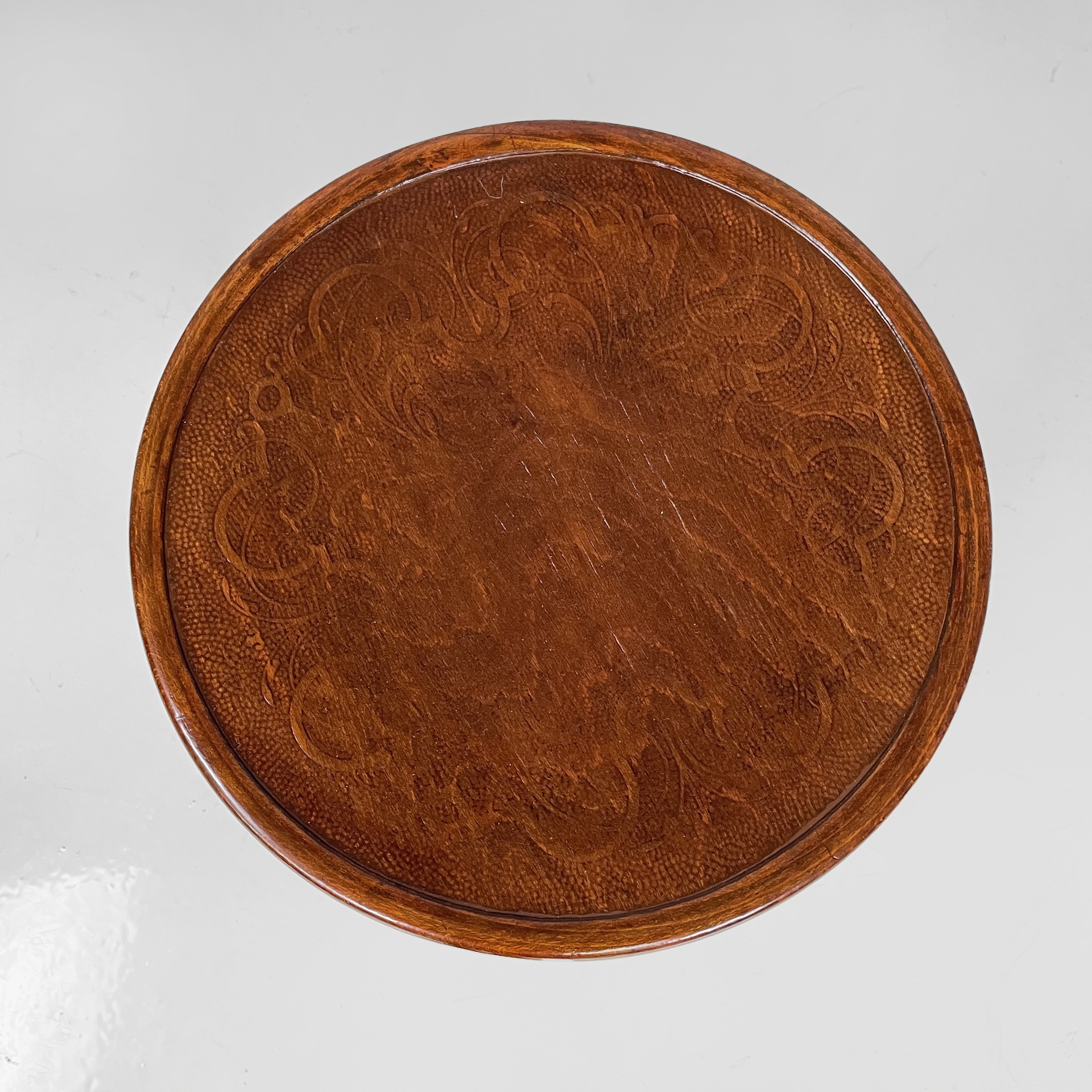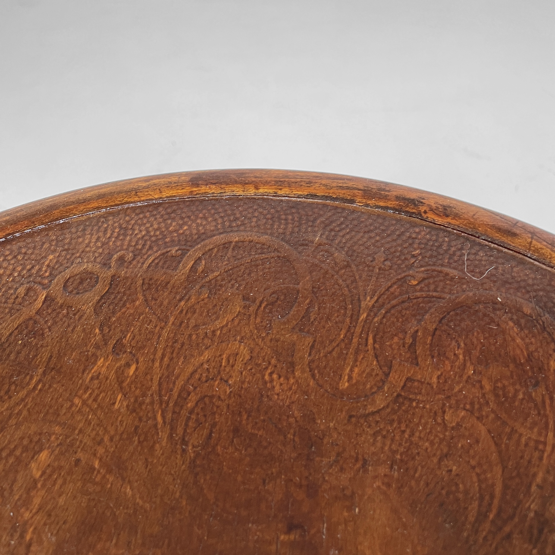 Sgabello da tavolo con seduta tonda con decori in leggero rilievo, interamente in legno. Le zampe a sezione tonda.