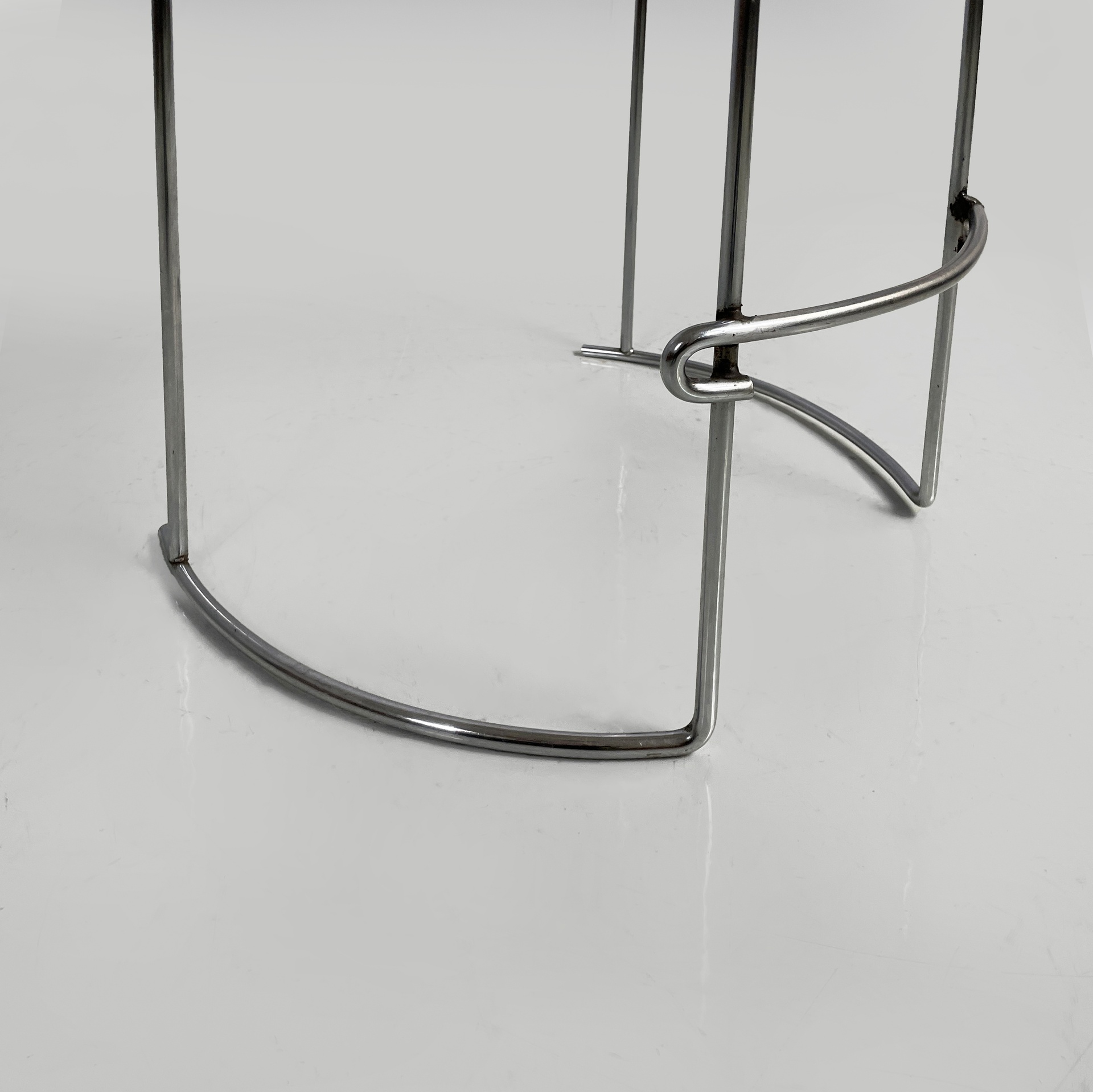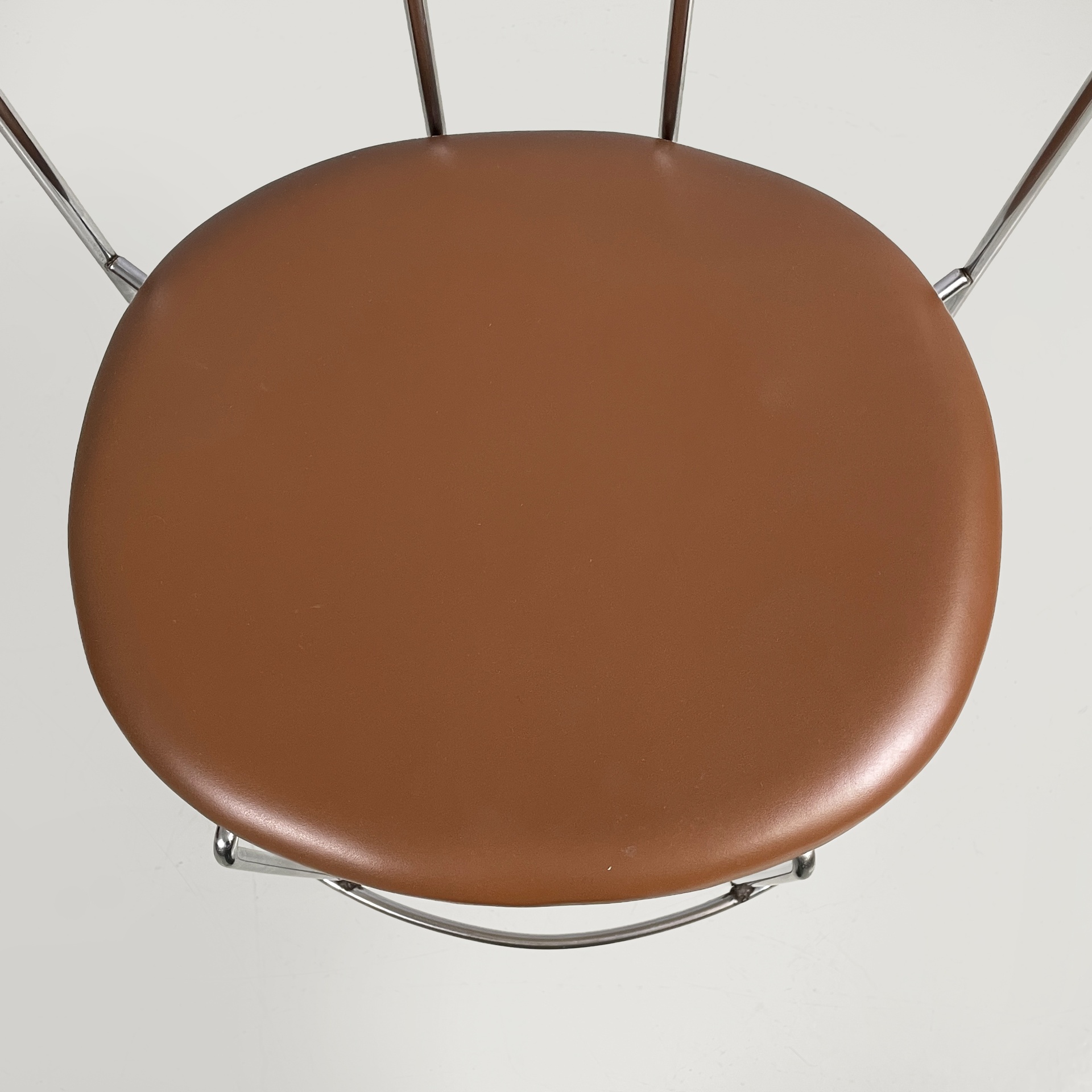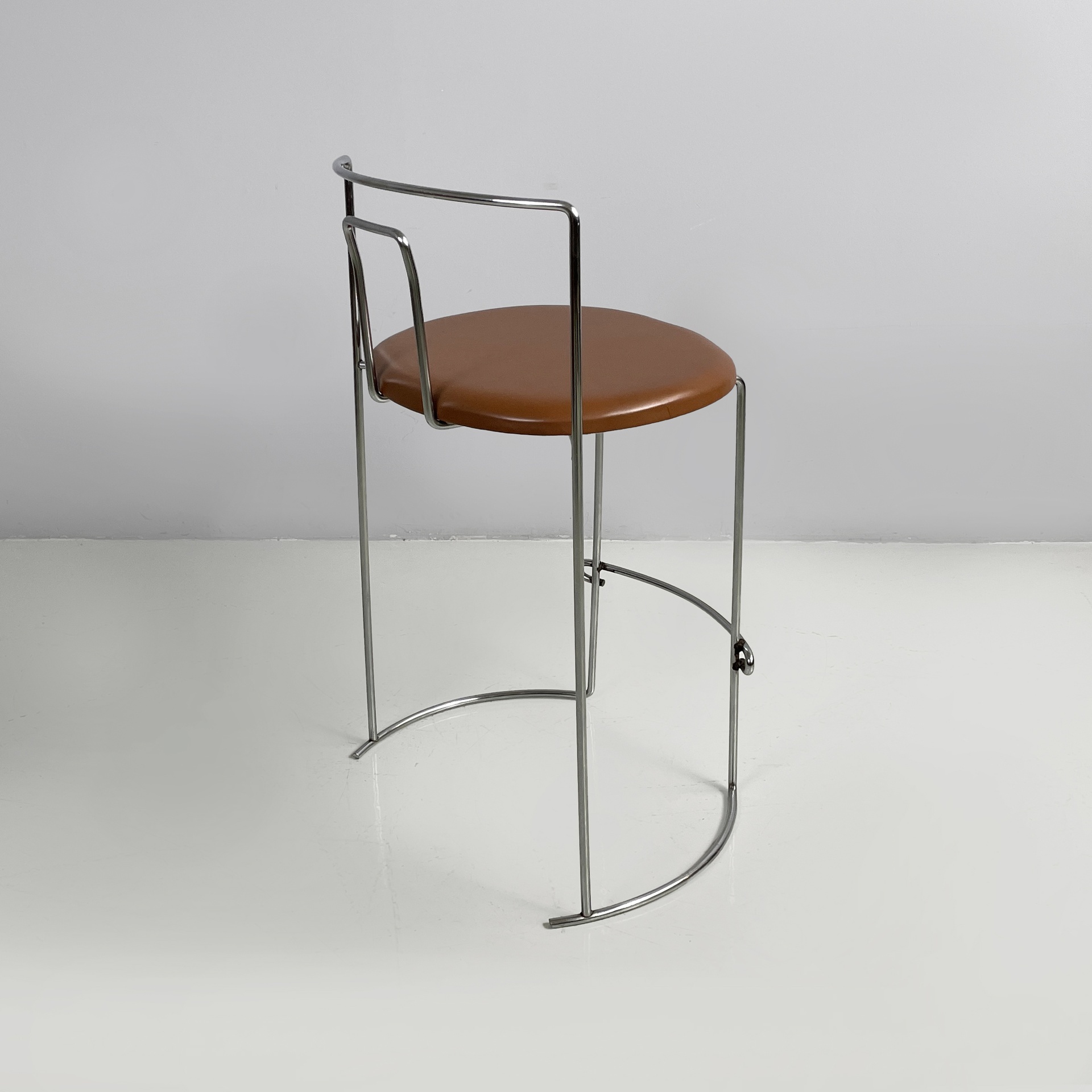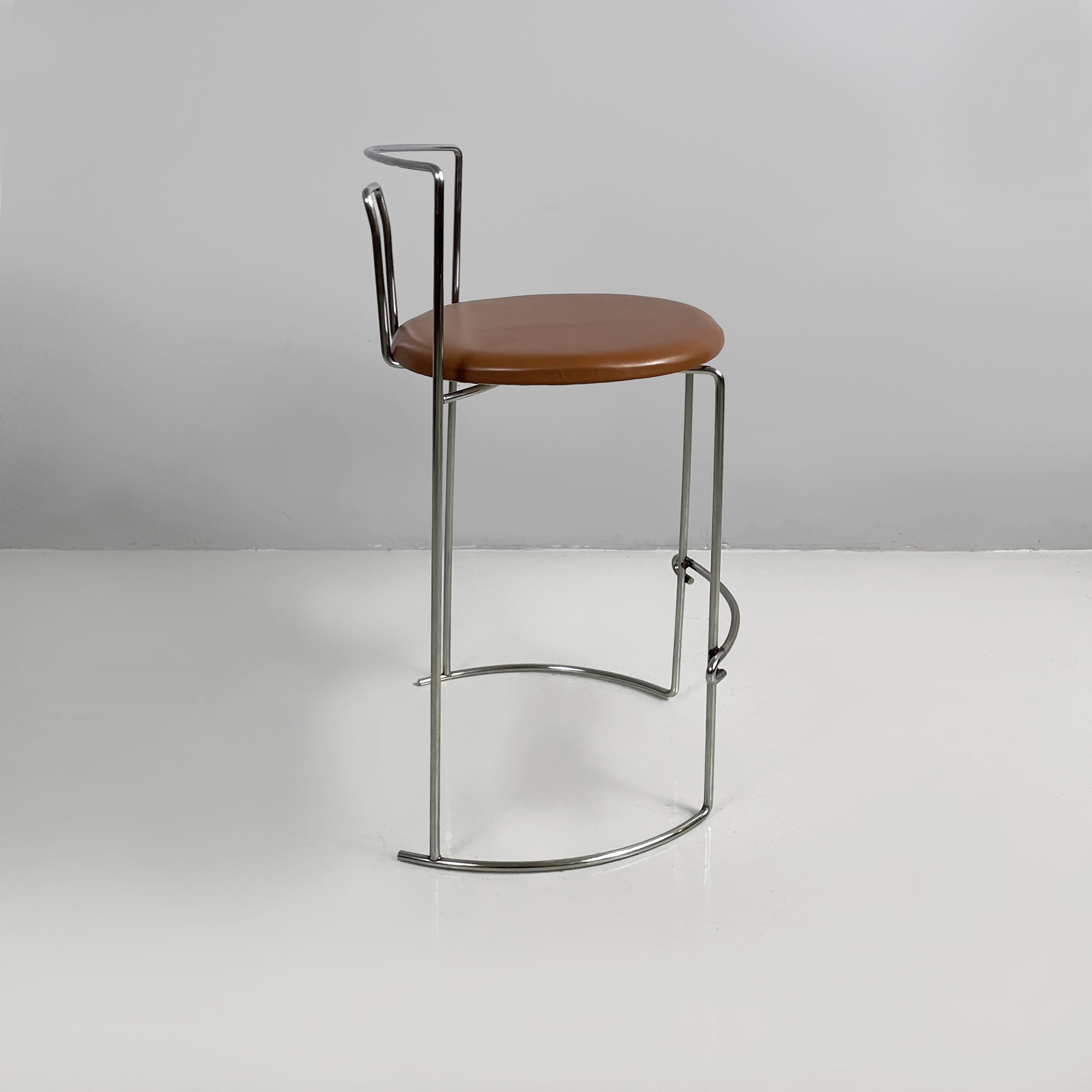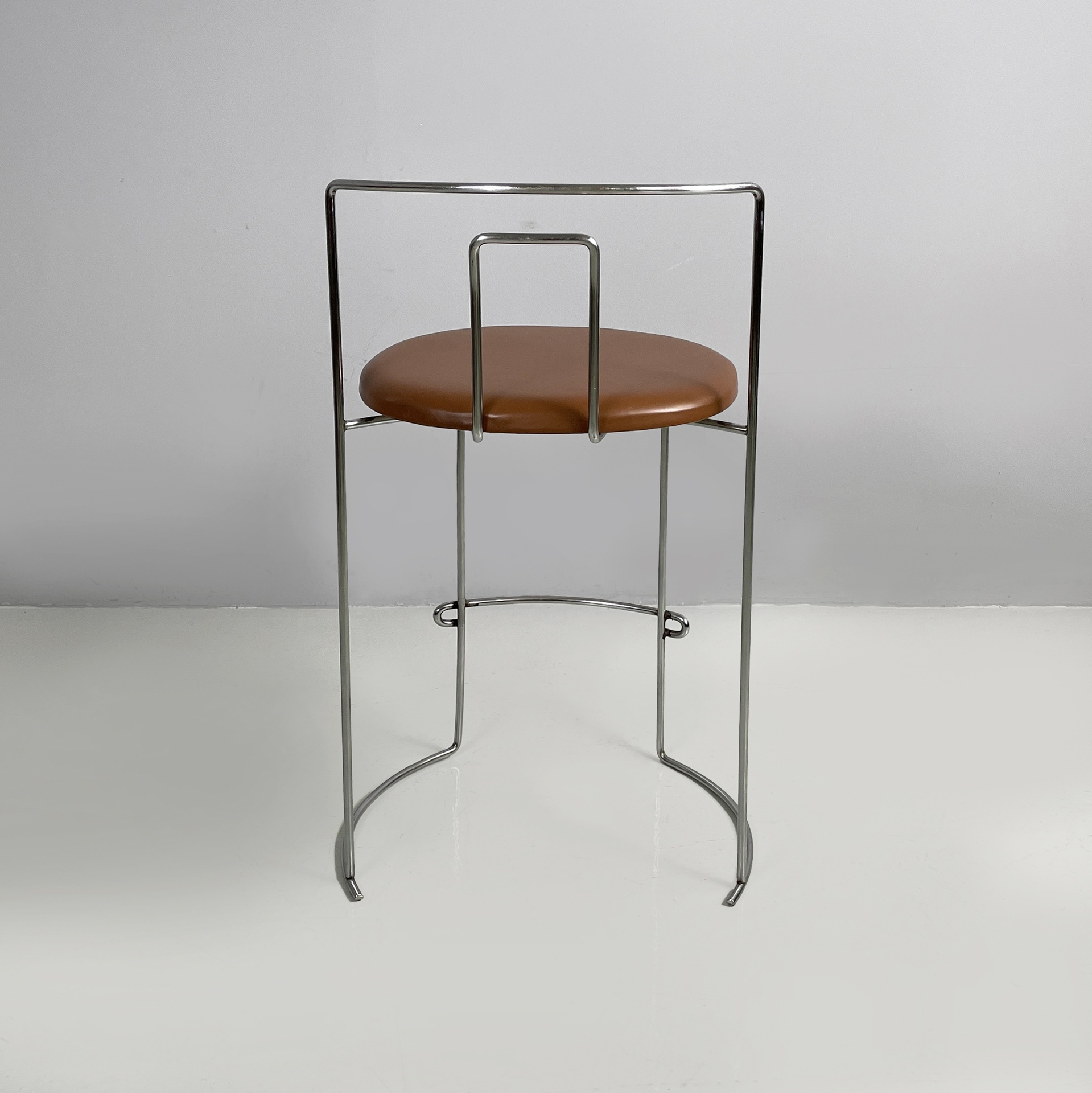 Sgabello da bar modello Gaja con seduta tonda in similpelle marrone. Lo schienale, le zampe e il poggiapiedi in tondino di acciaio curvato.