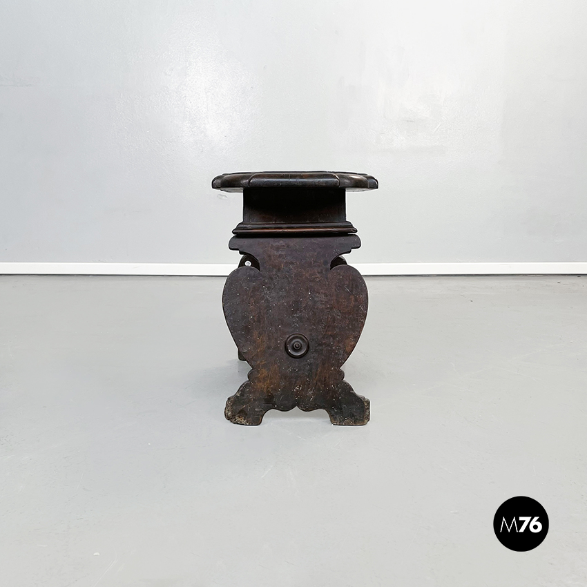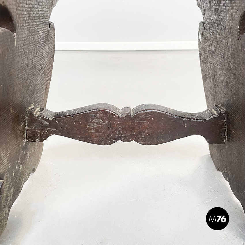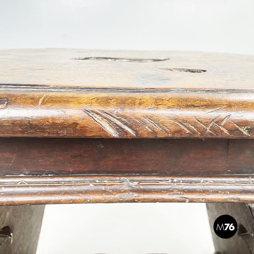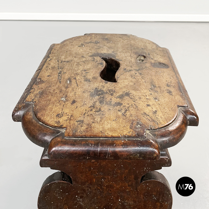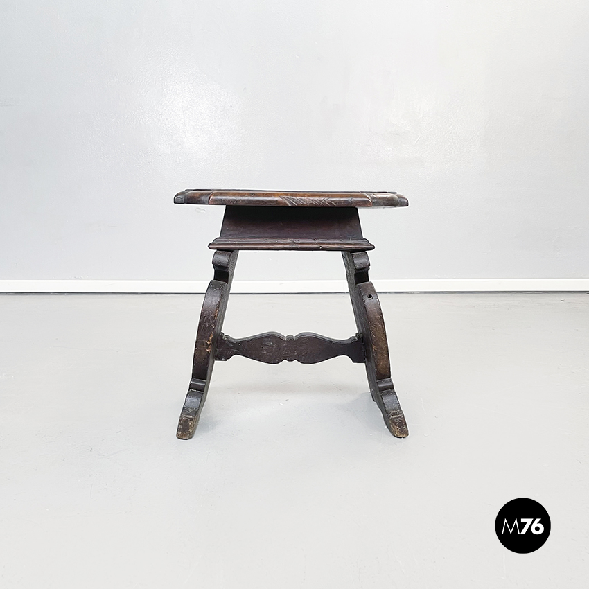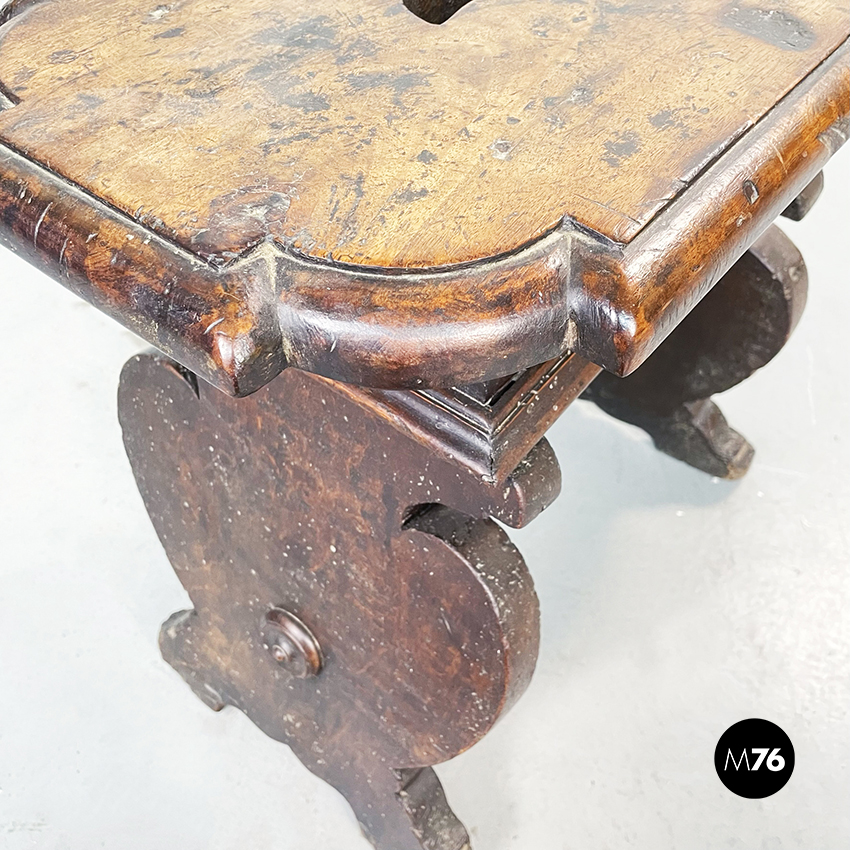 Sgabello da tavolo d’antiquariato in legno di noce, finemente lavorato. La seduta presenta un foro nel centro. Le due gambe tendono ad allargarsi verso il basso.