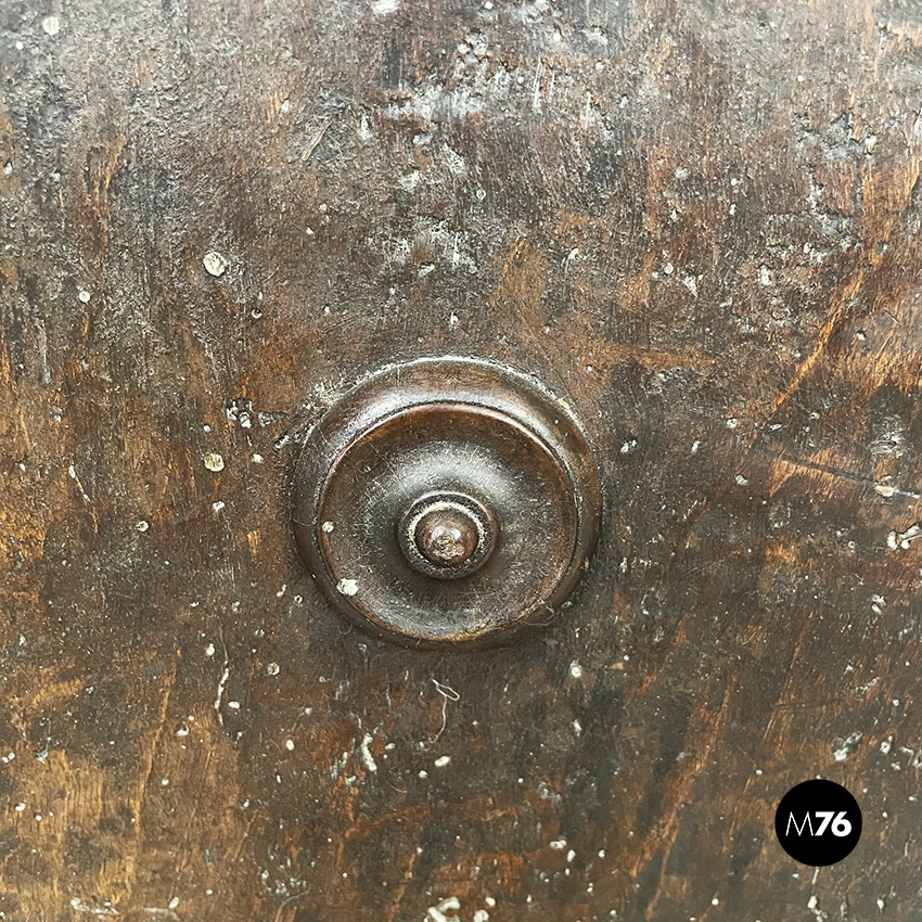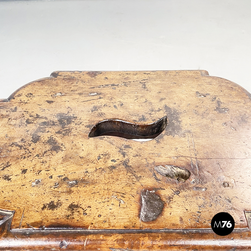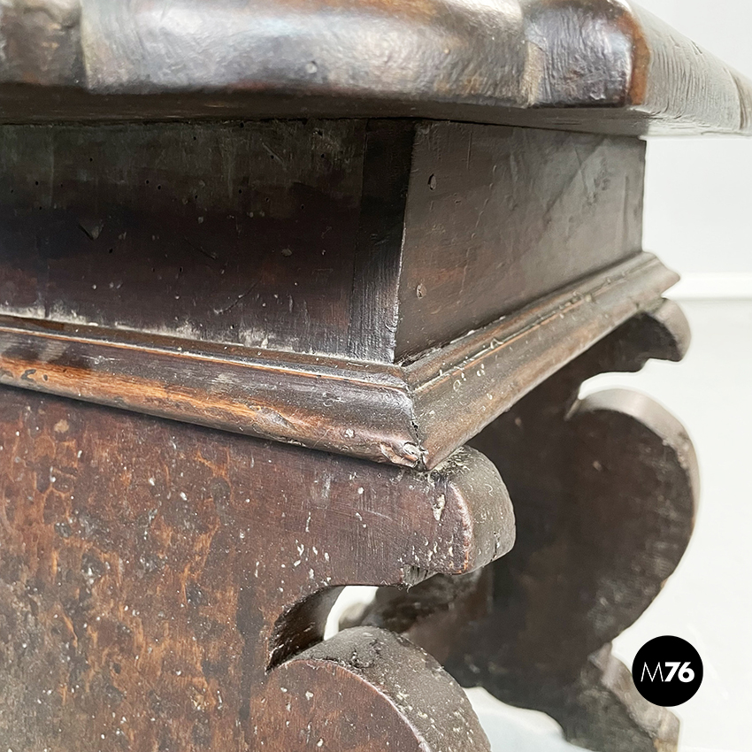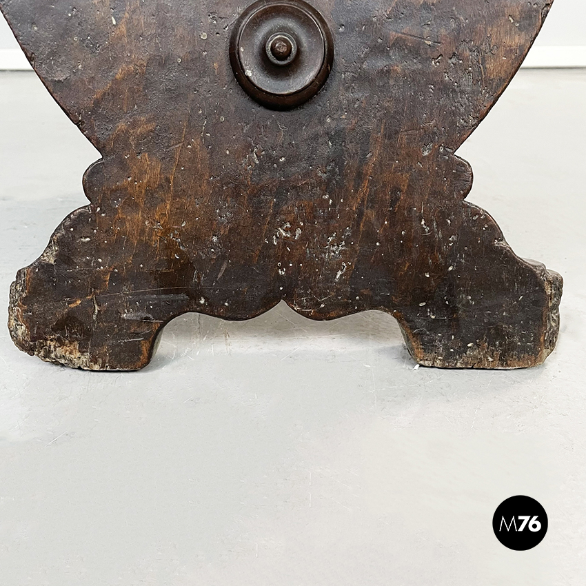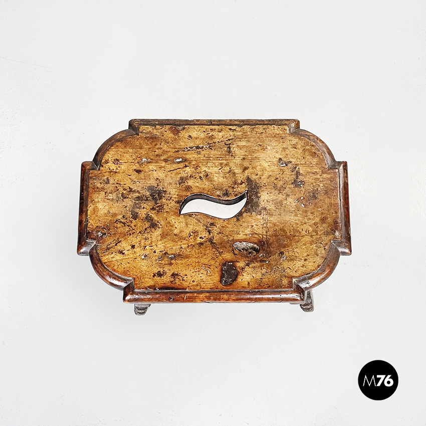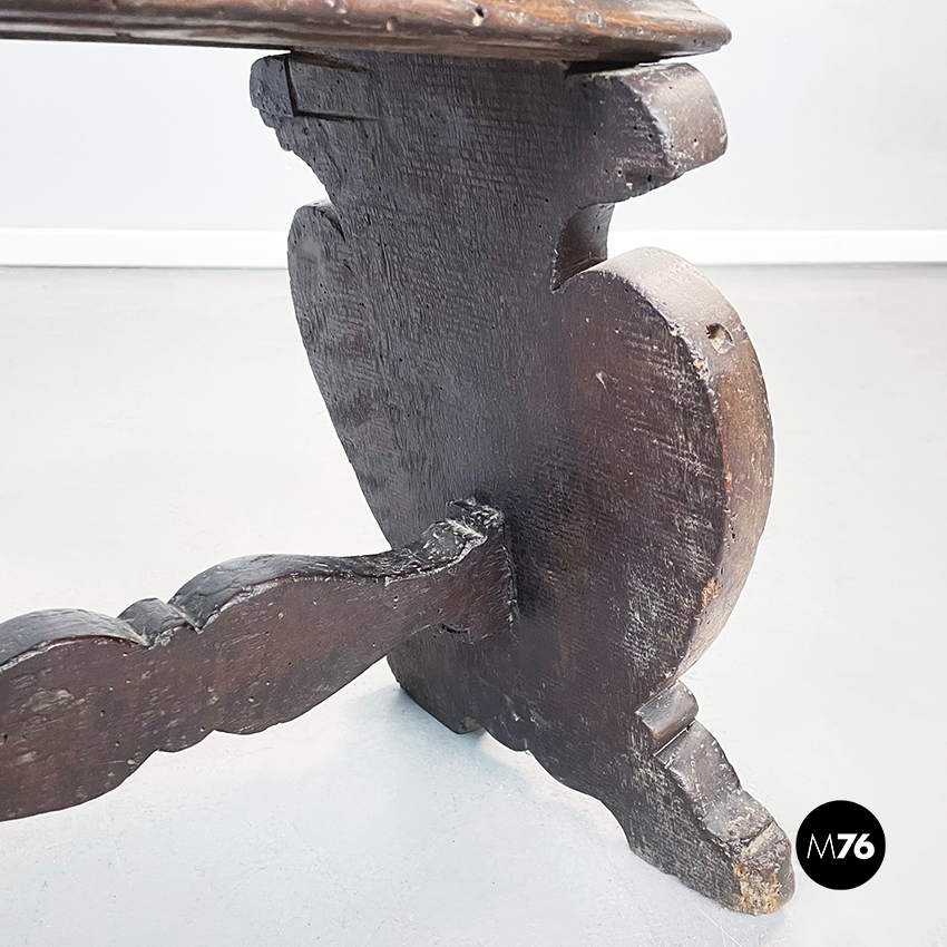 Sgabello da tavolo d’antiquariato in legno di noce, finemente lavorato. La seduta presenta un foro nel centro. Le due gambe tendono ad allargarsi verso il basso.