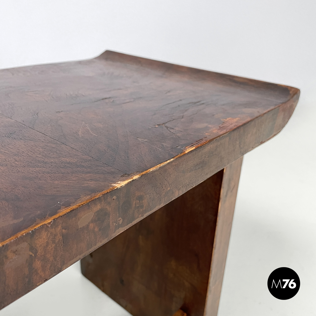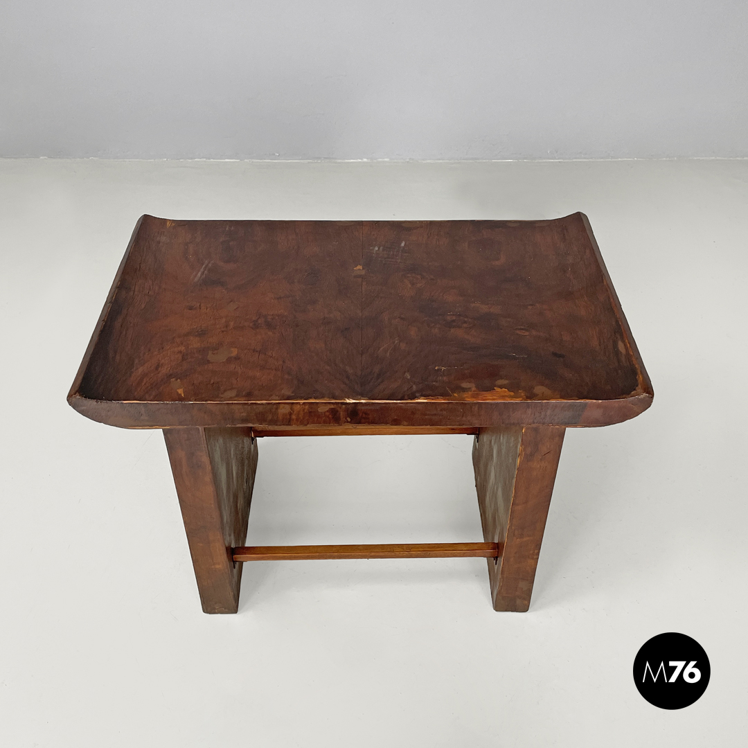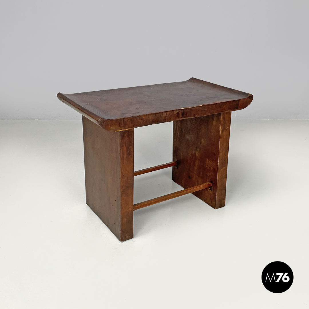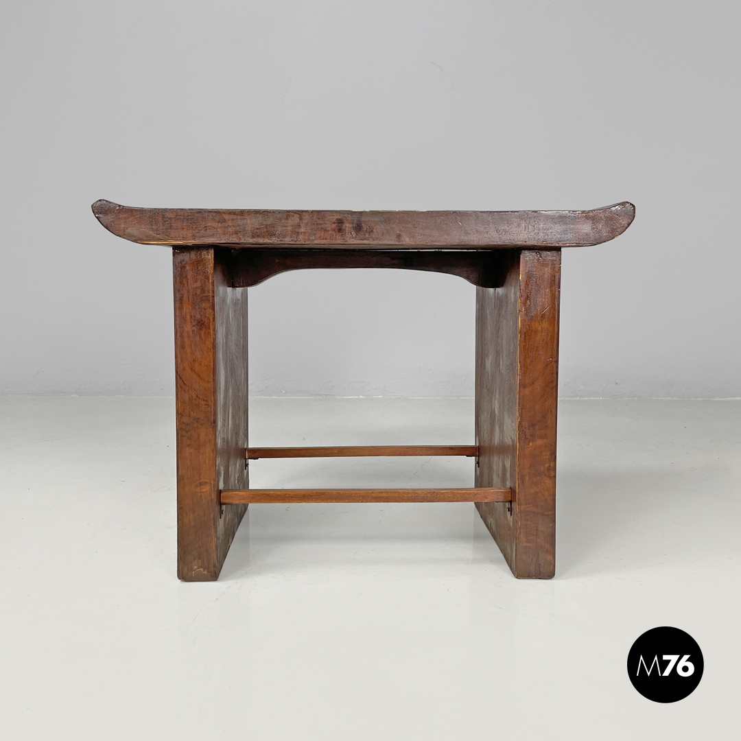 Sgabello da tavolo o tavolo da caffè in legno rettangolare. I lati del piano sono curvati verso l’alto. Con due listelli a sezione quadrata nella parte bassa fissati con componenti in metallo.