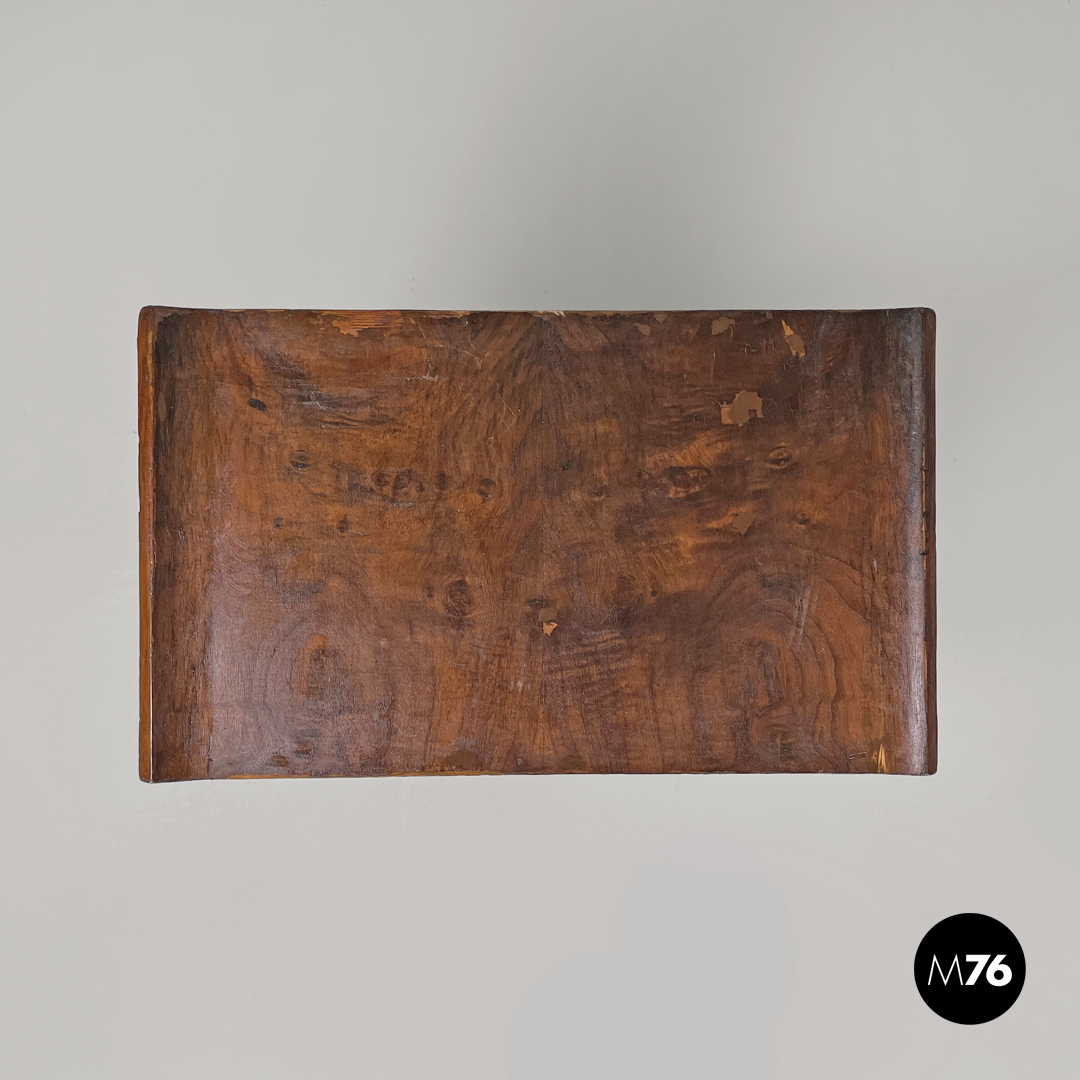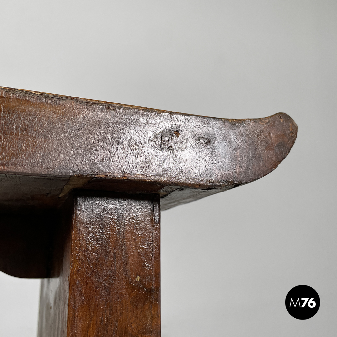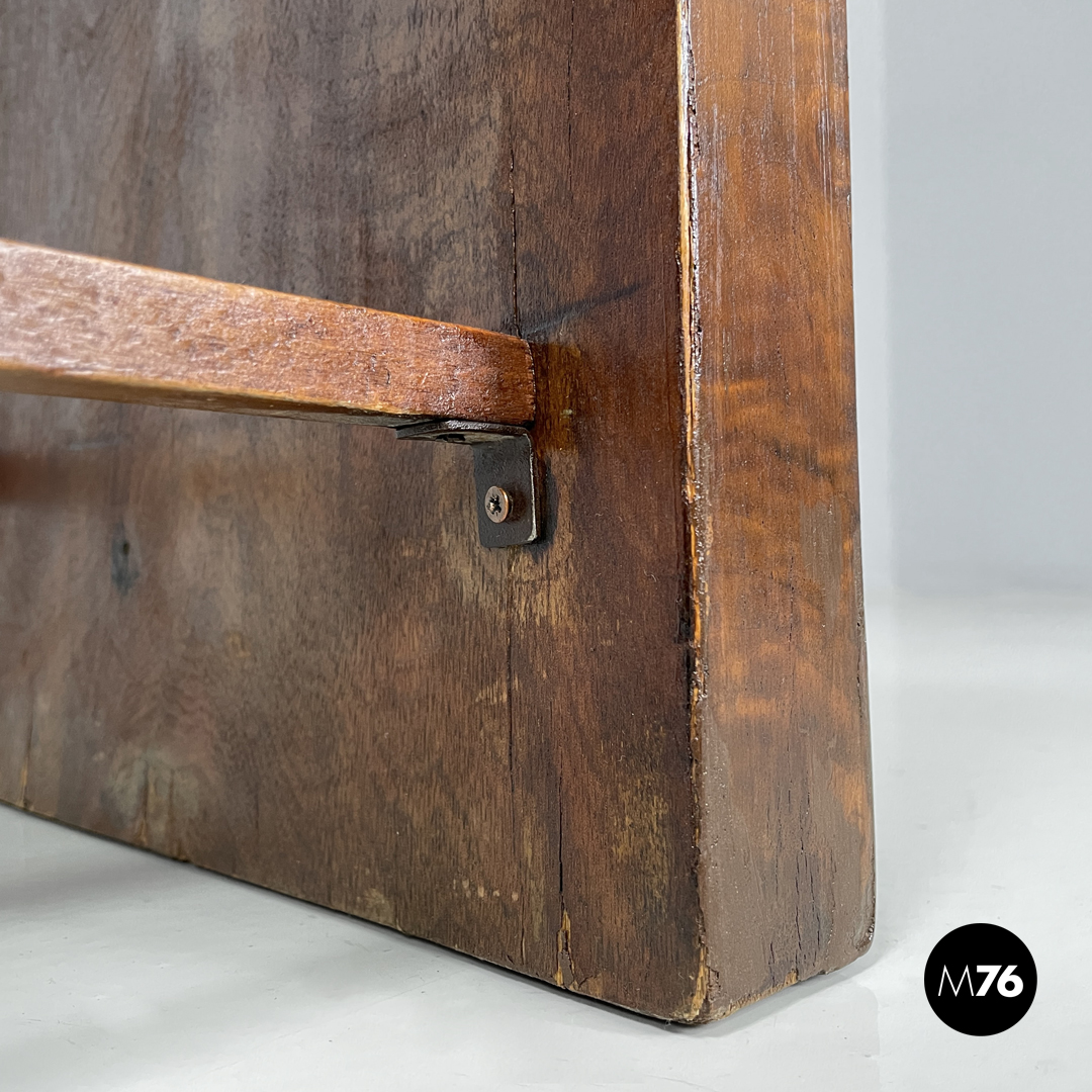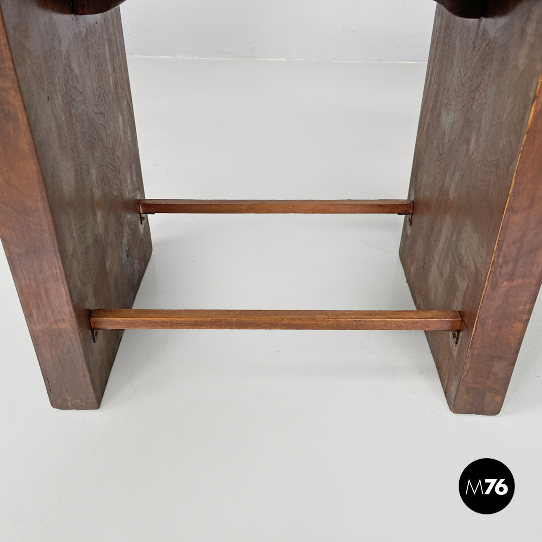 Sgabello da tavolo o tavolo da caffè in legno rettangolare. I lati del piano sono curvati verso l’alto. Con due listelli a sezione quadrata nella parte bassa fissati con componenti in metallo.