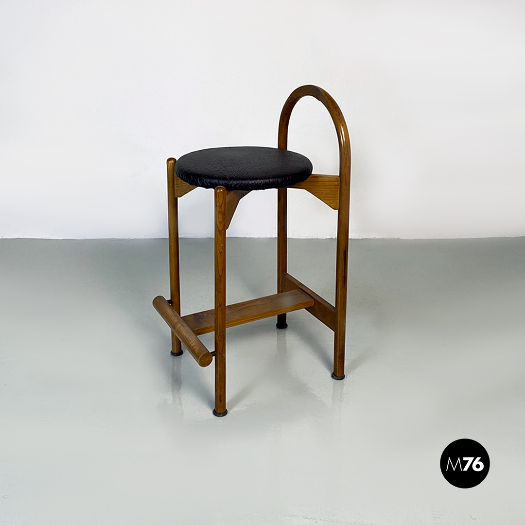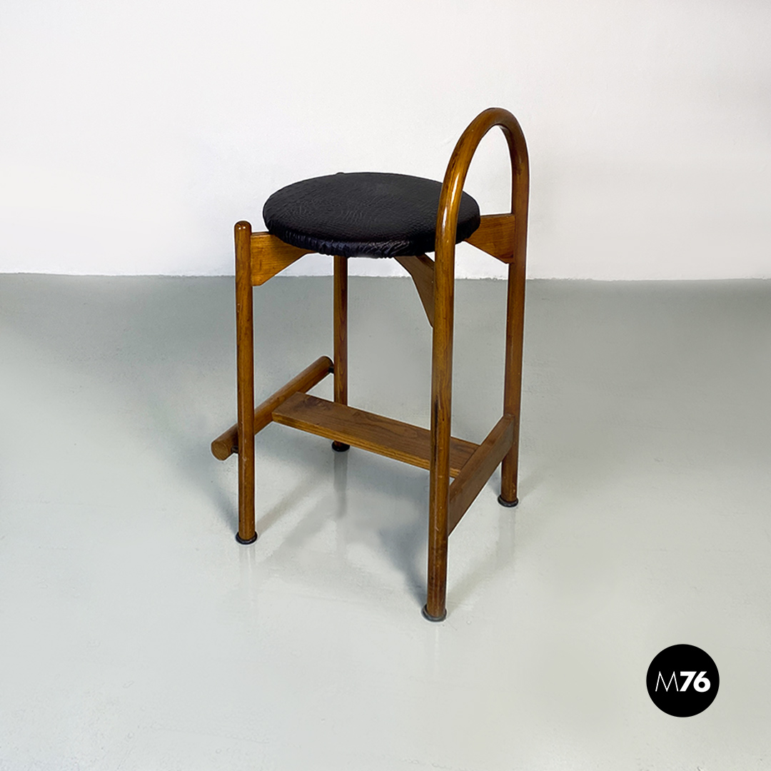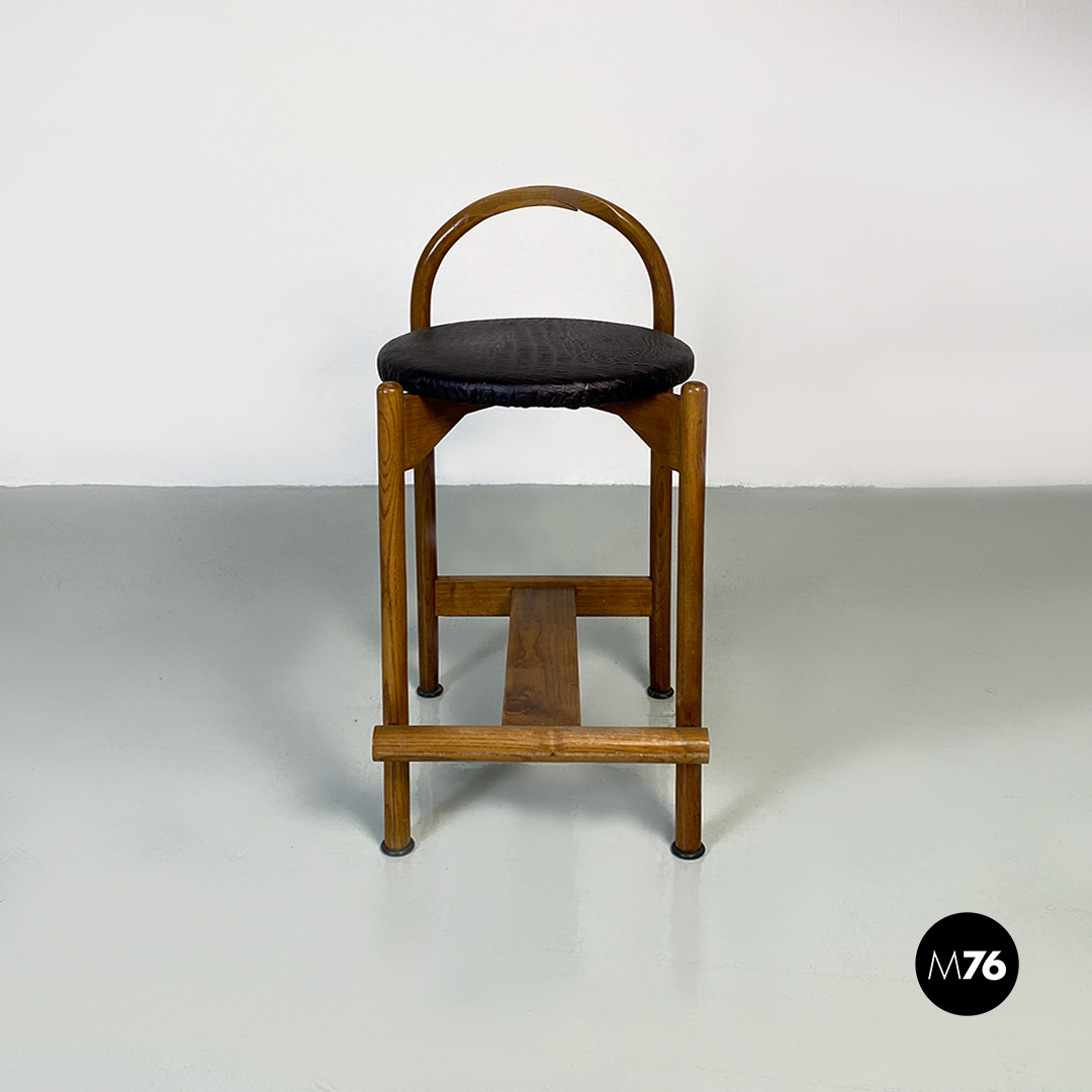 Sgabello da bar con struttura in legno con zampe a sezione tonda e poggiapiedi, seduta di forma tonda rivestita in finta pelle marrone scuro e schienale curvato.