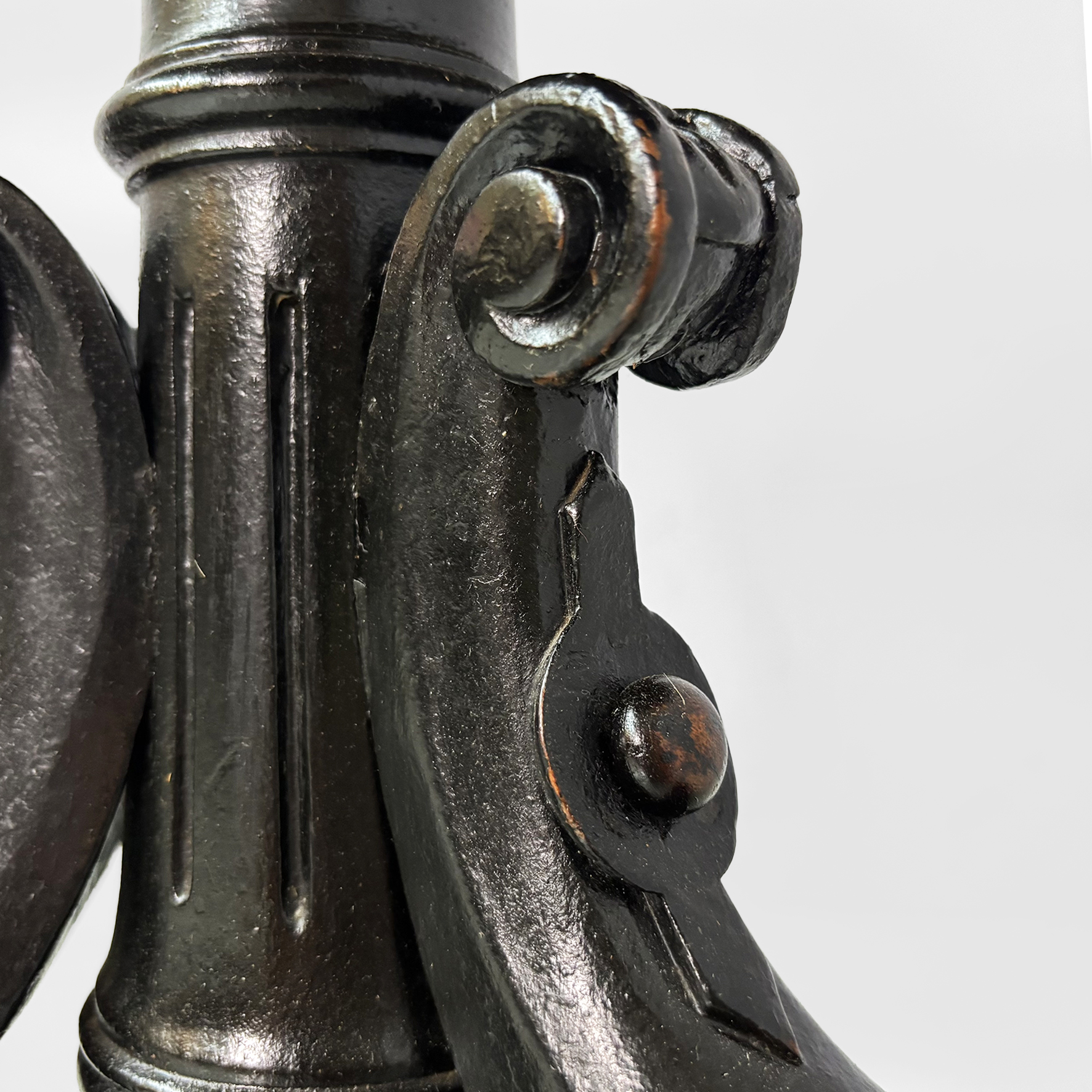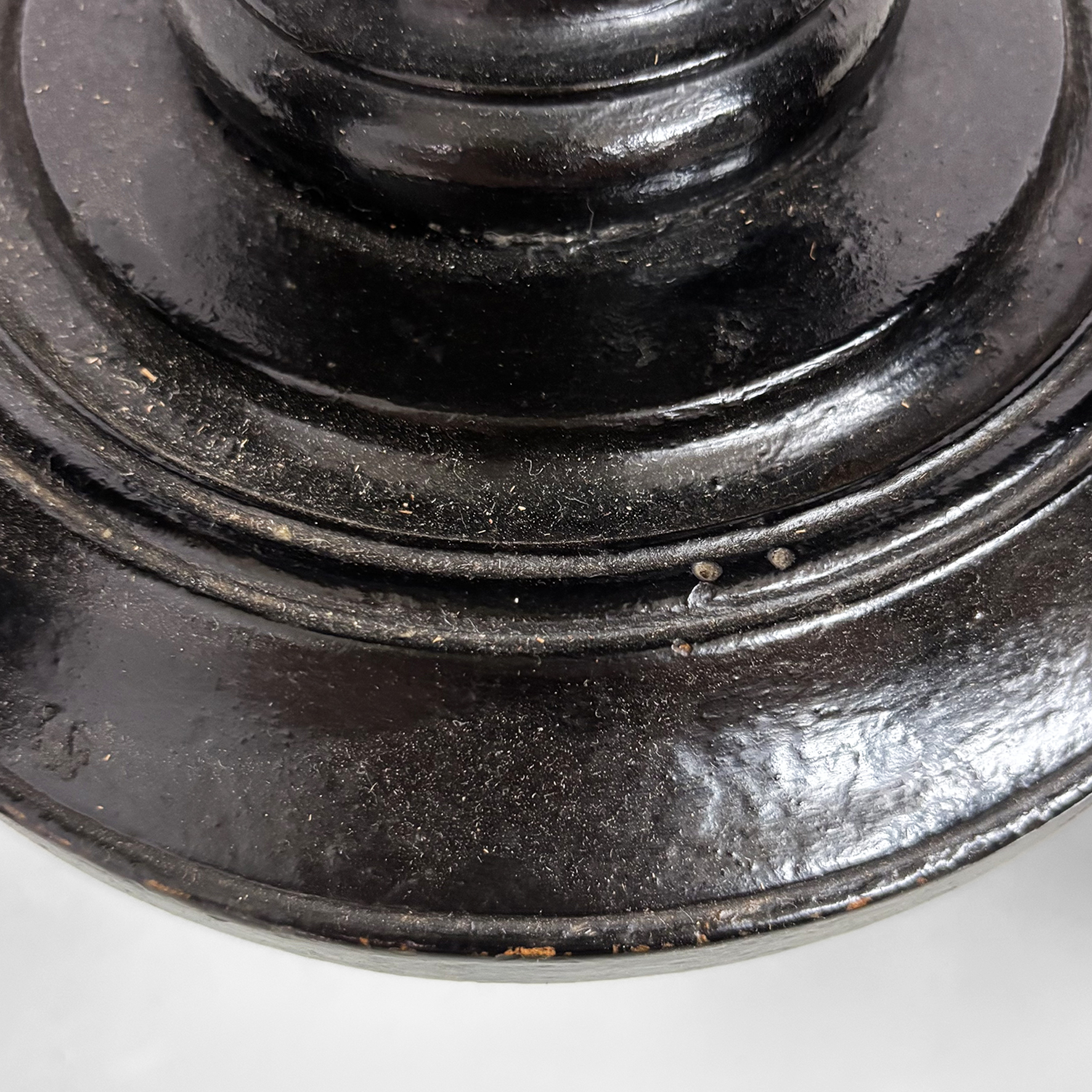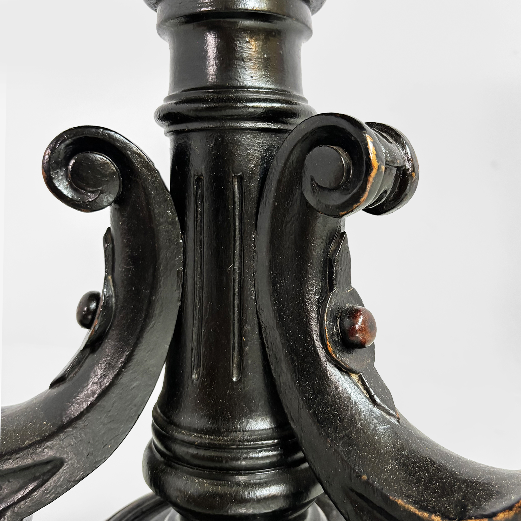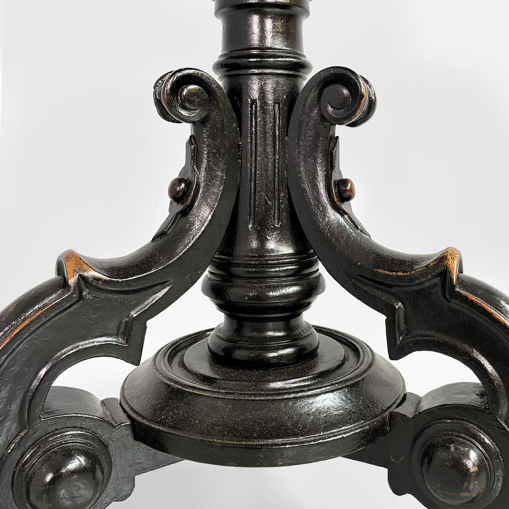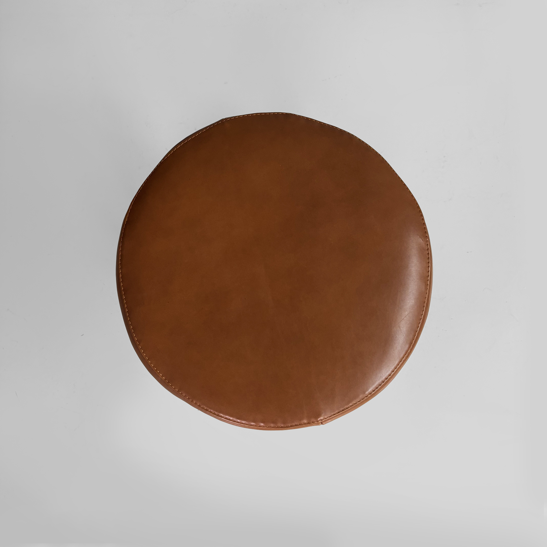 Sgabello da tavolo con seduta tonda, imbottita e rivestita in pelle marrone con borchie tonde lungo il profilo. La base è composta da tre zampe in legno scuro finemente lavorato. Seduta regolabile in altezza. In stile 1800.