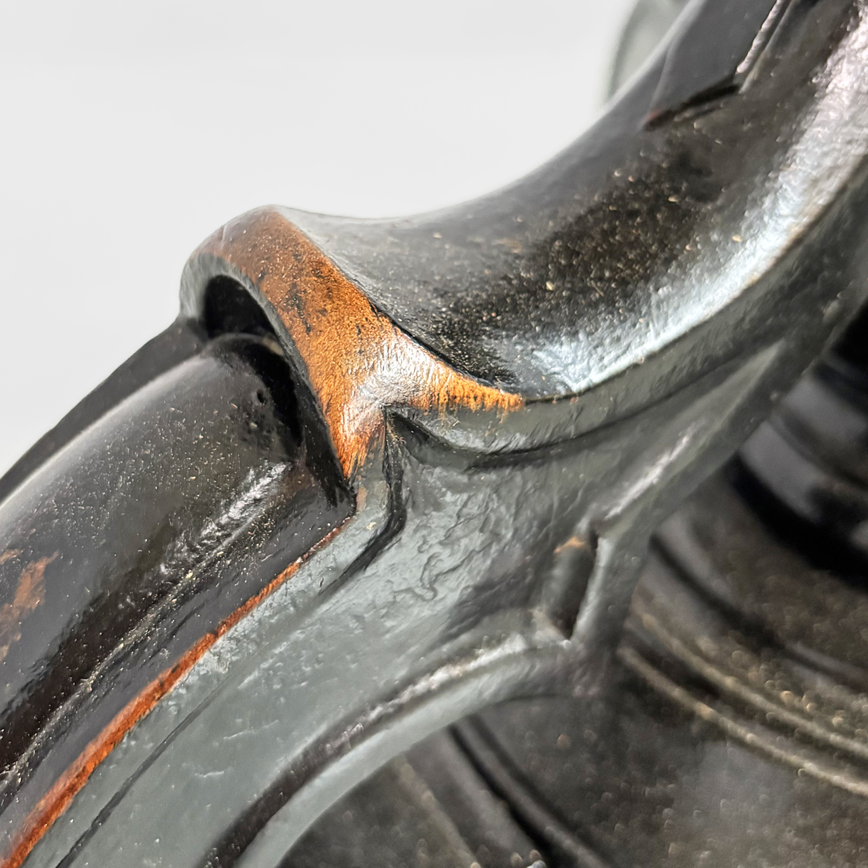 Buone condizioni. Il legno presenta segni e piccole mancanze di colore. Pelle rifatta a nuovo.