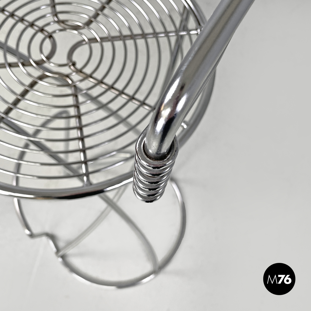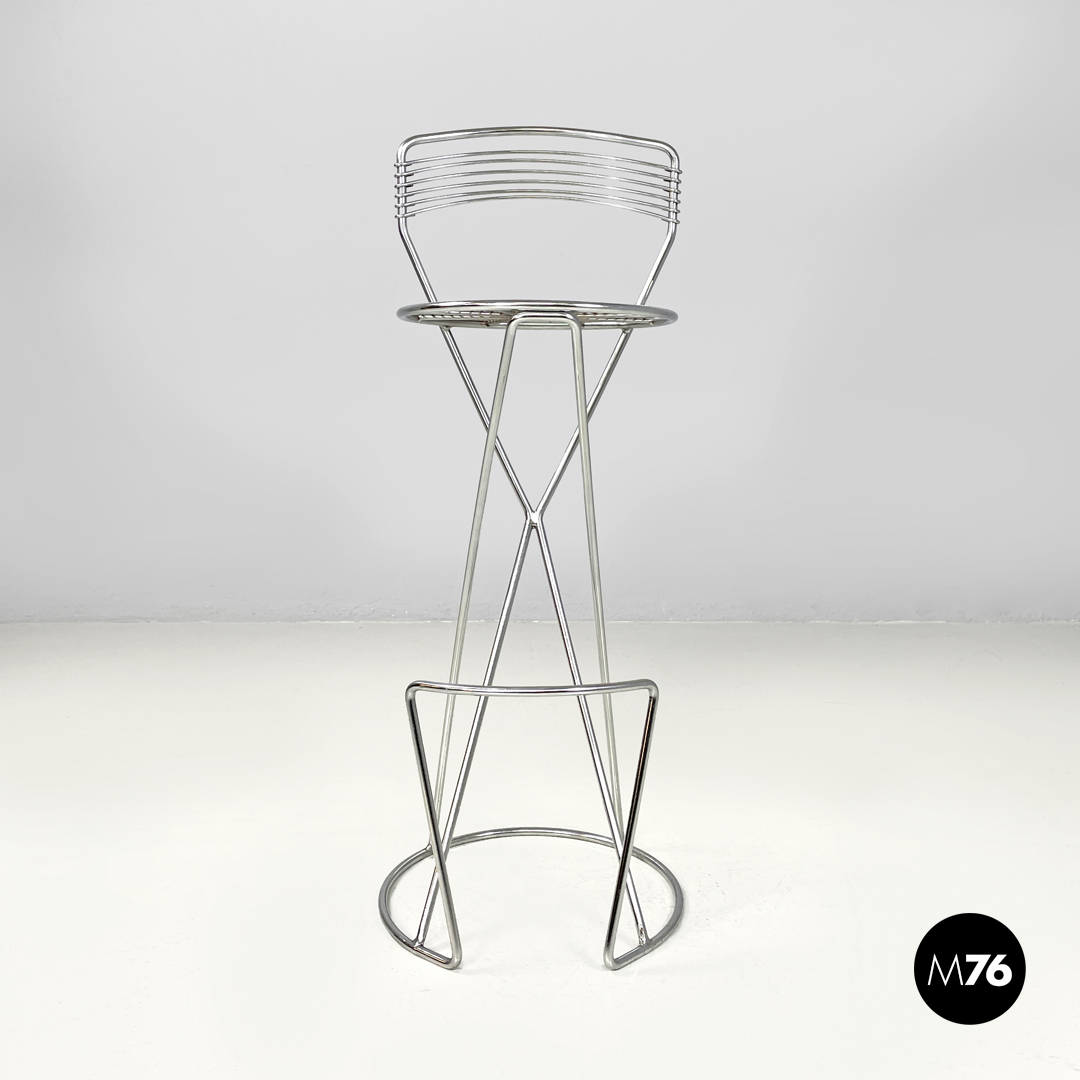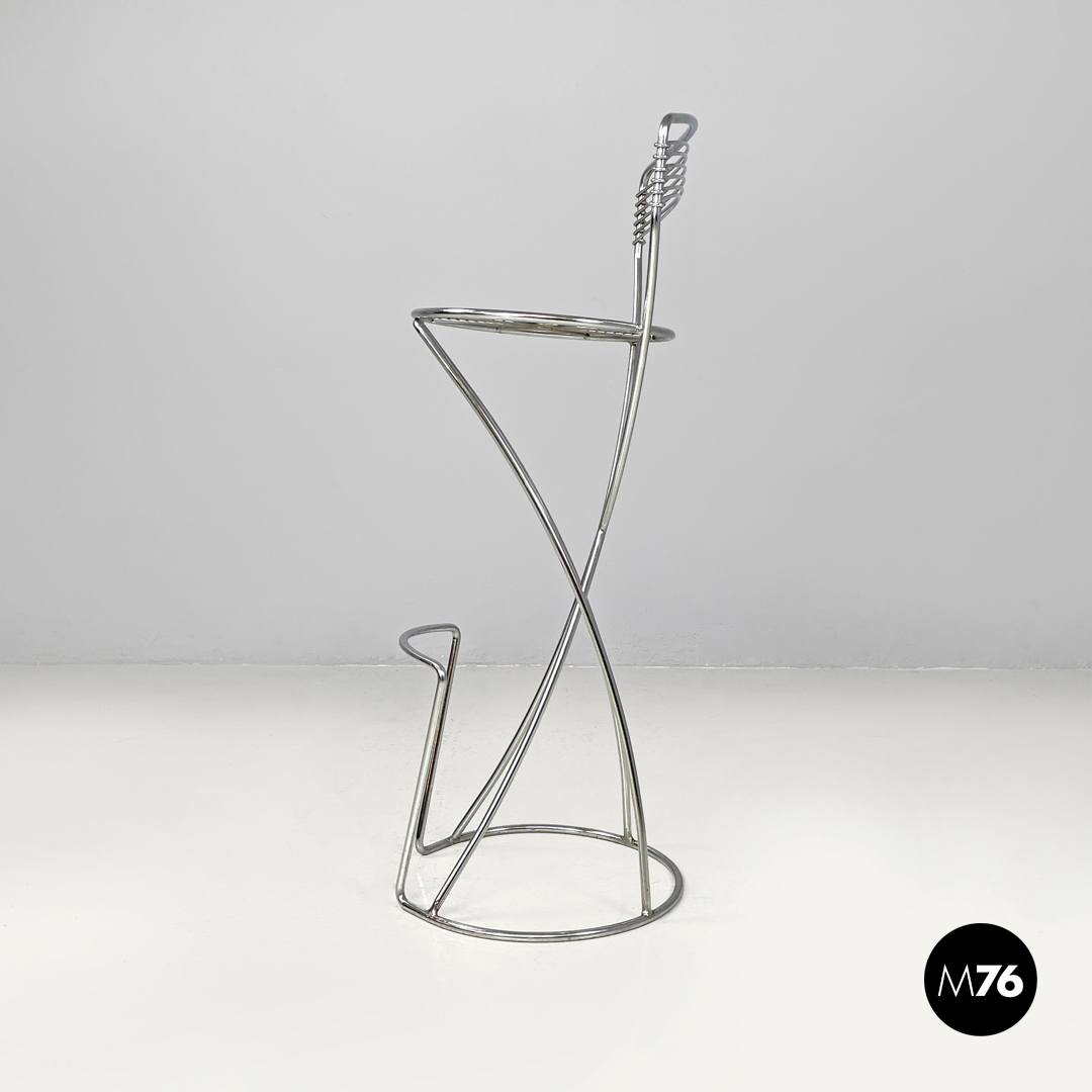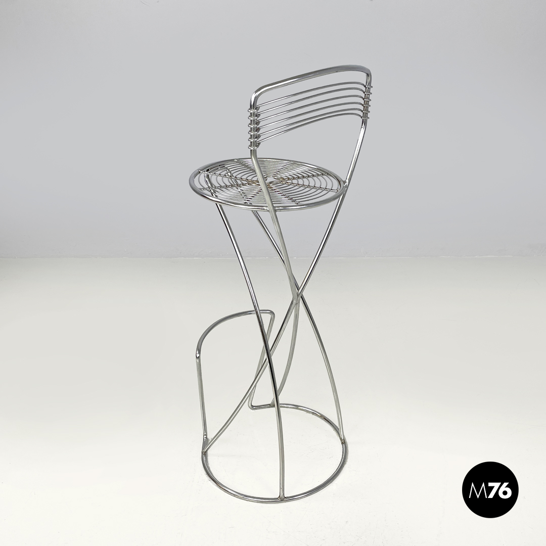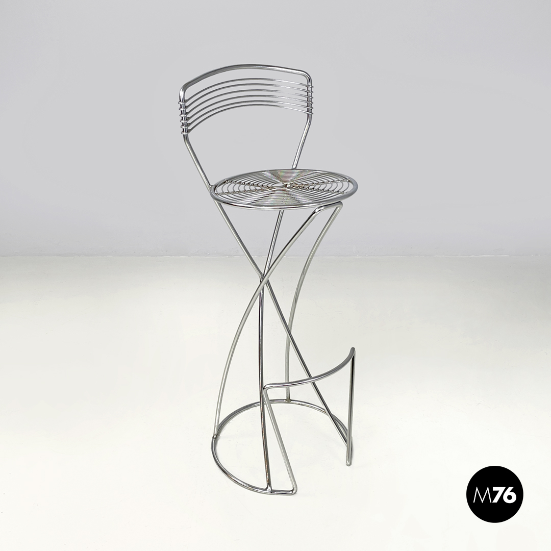 Sgabello da bar a base tonda. La struttura è in tondino di metallo cromato, la seduta è composta da un tondino che si sviluppa a spirale. Le quattro gambe si incrociano a formare due “x”, la parte frontale della base presenta un poggiapiedi.