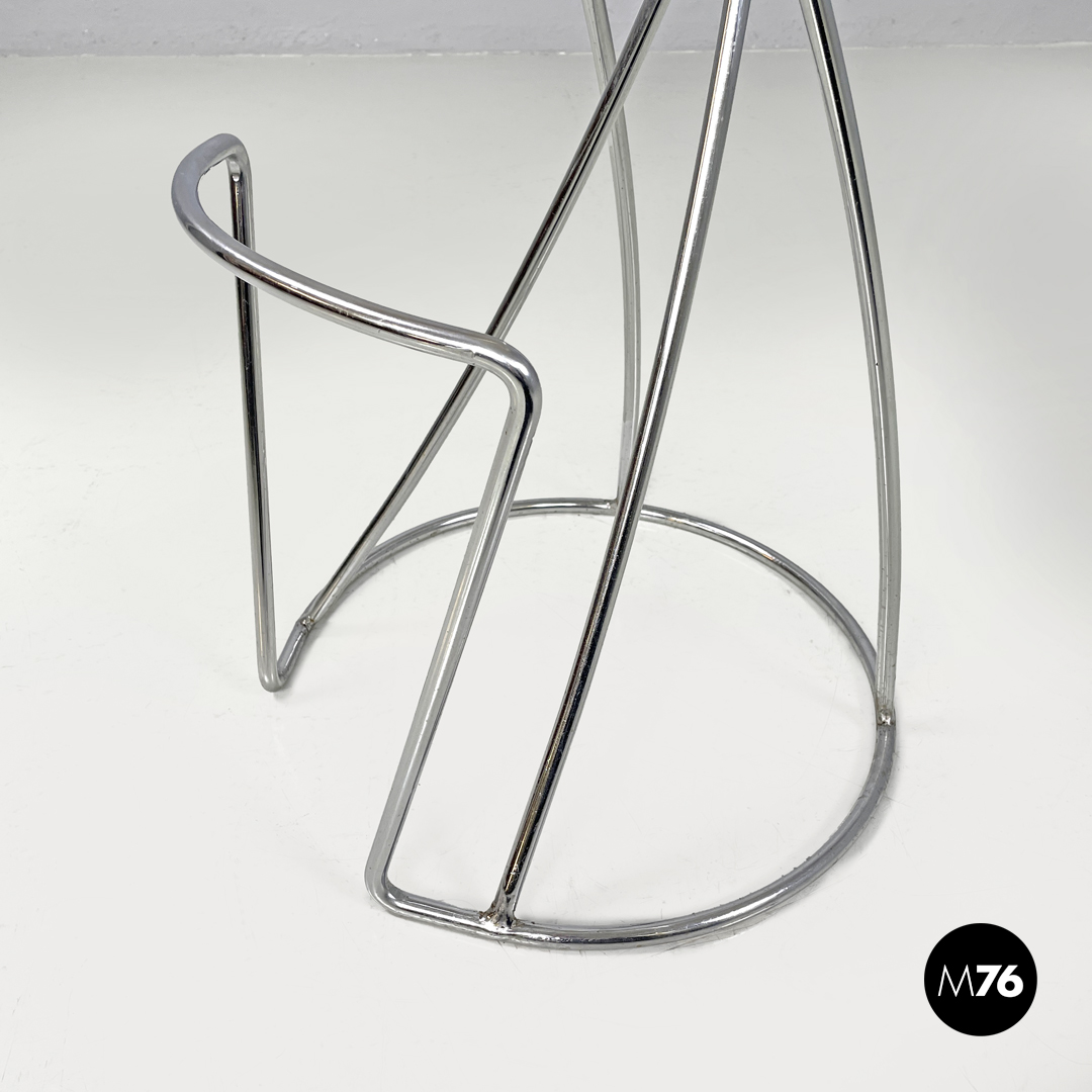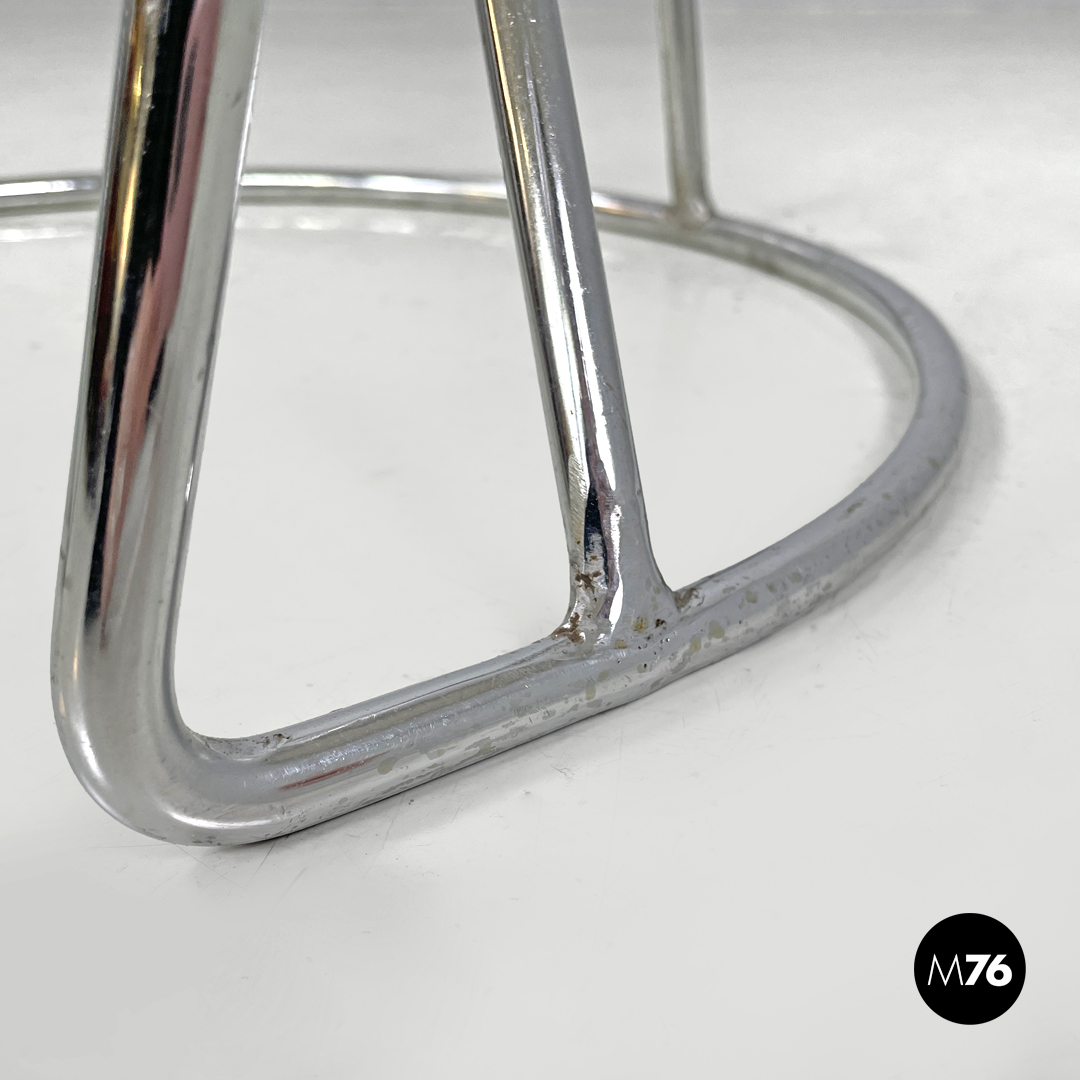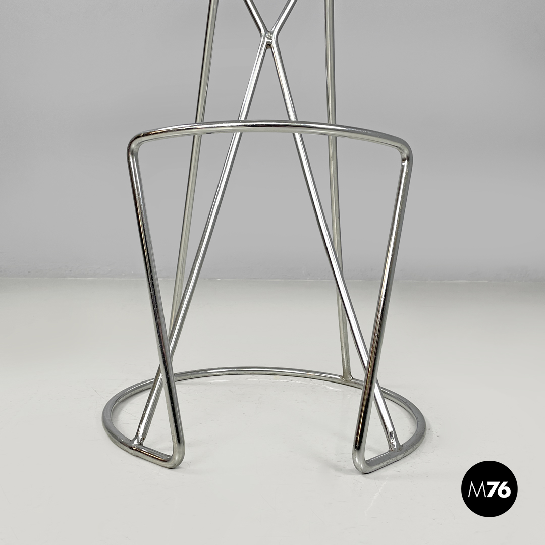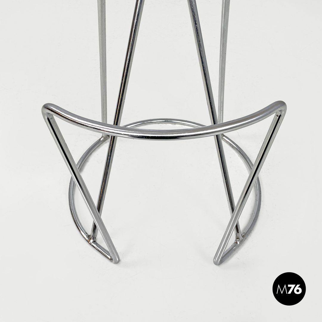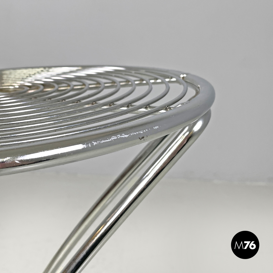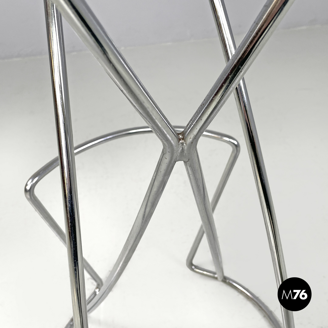 Sgabello da bar a base tonda. La struttura è in tondino di metallo cromato, la seduta è composta da un tondino che si sviluppa a spirale. Le quattro gambe si incrociano a formare due “x”, la parte frontale della base presenta un poggiapiedi.