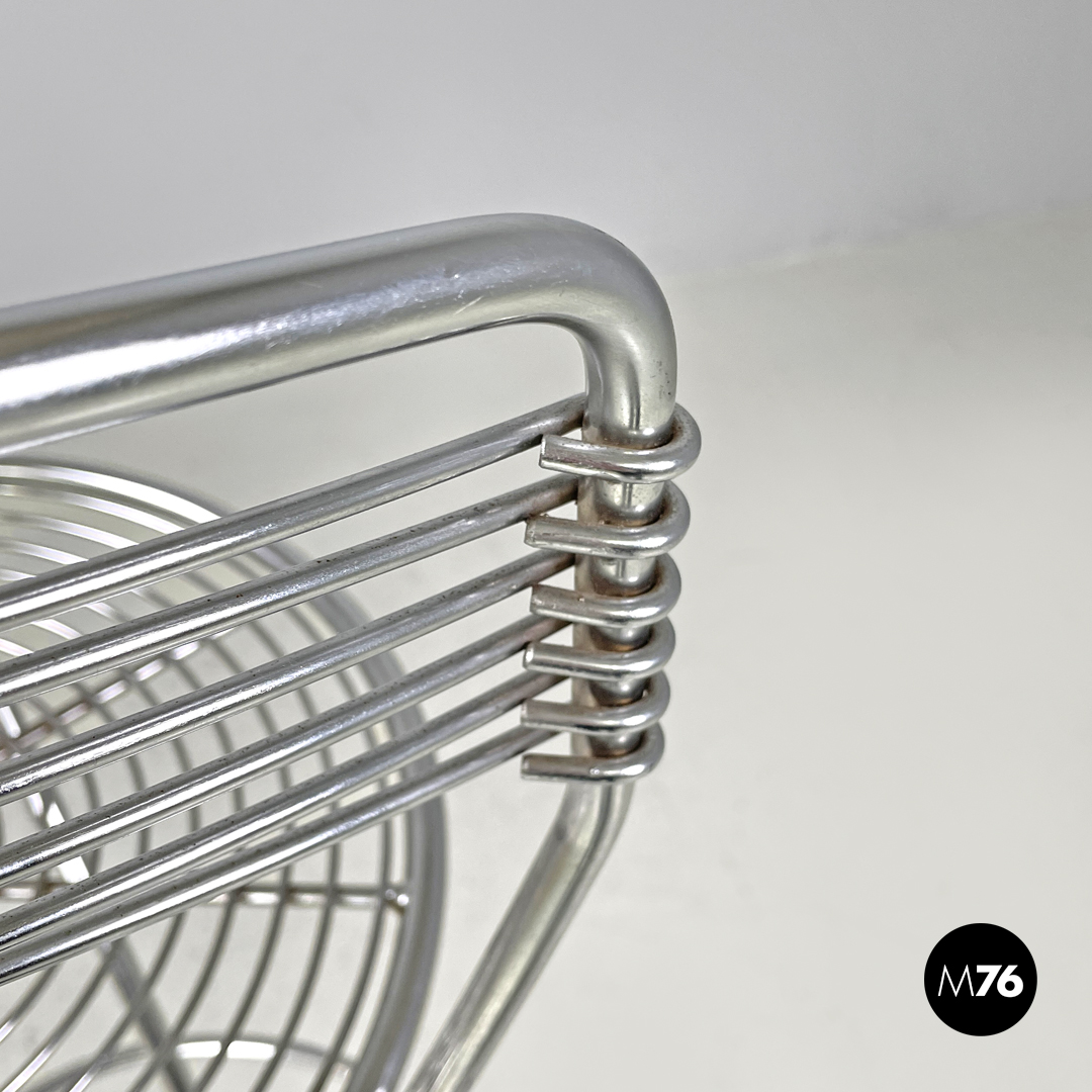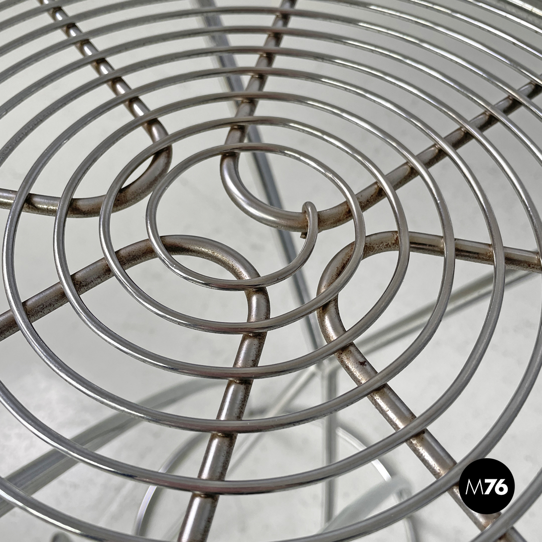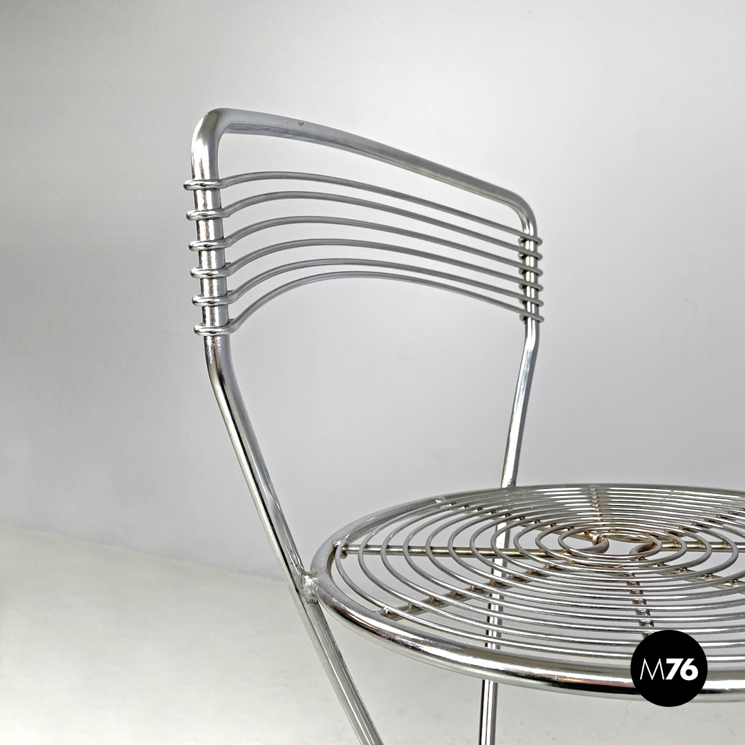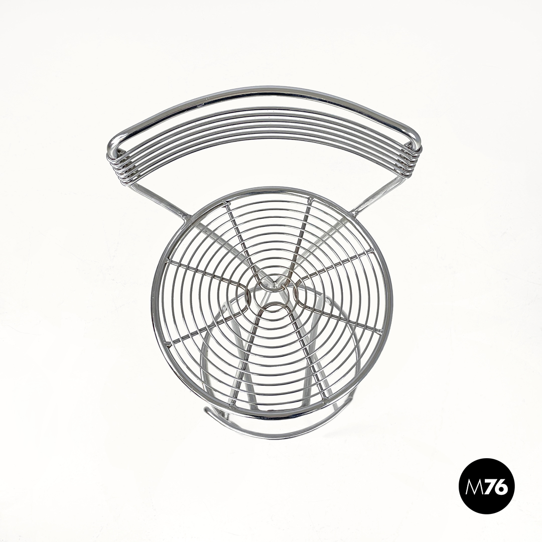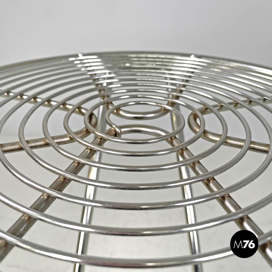 Sgabello da bar a base tonda. La struttura è in tondino di metallo cromato, la seduta è composta da un tondino che si sviluppa a spirale. Le quattro gambe si incrociano a formare due “x”, la parte frontale della base presenta un poggiapiedi.