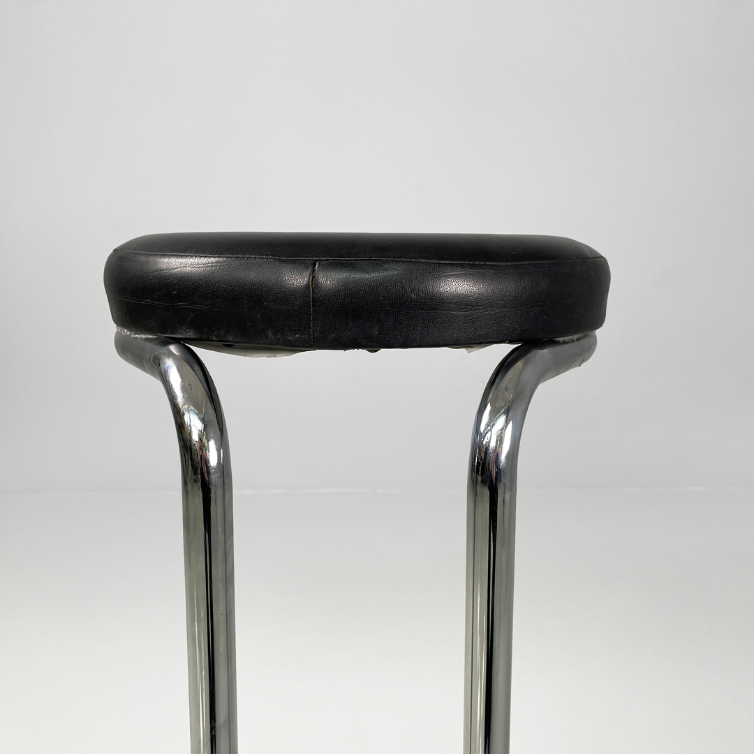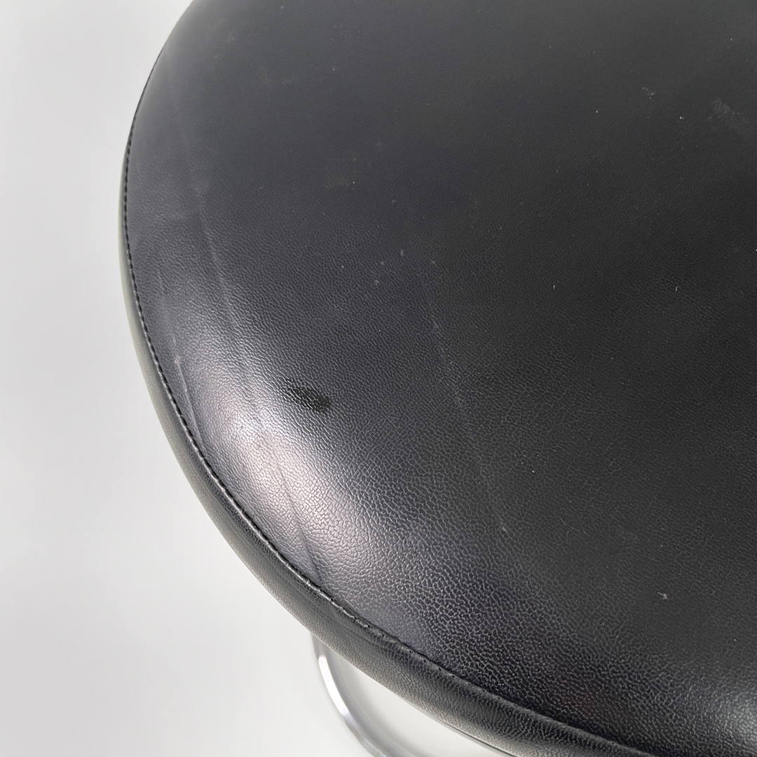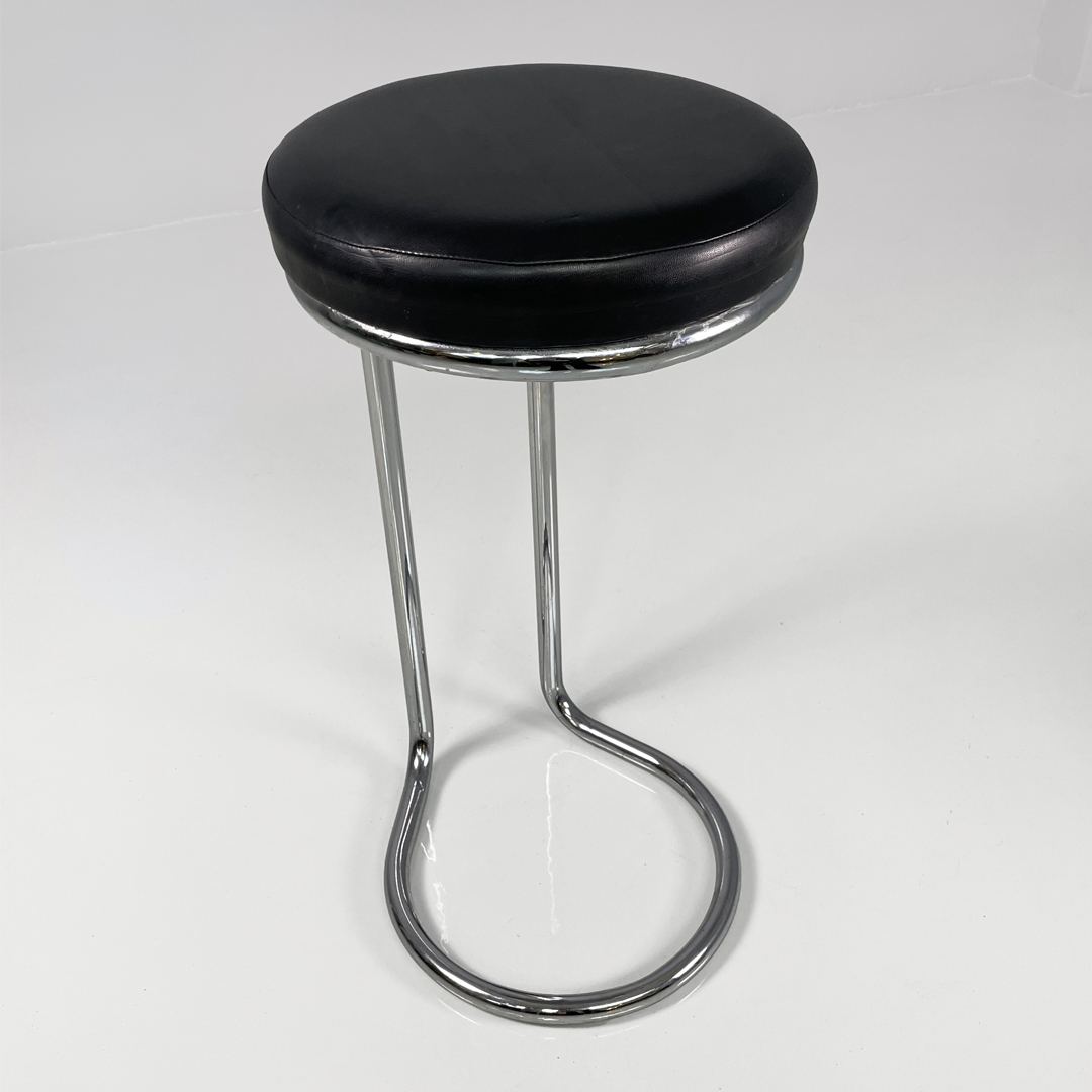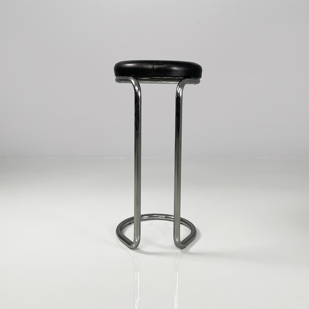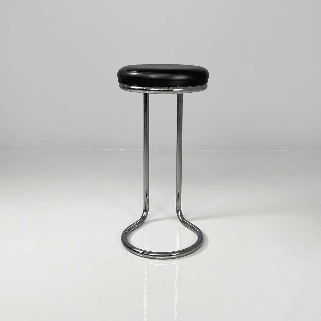 Sgabello da bar a base tonda. La struttura è in tondino di metallo cromato, la seduta è in pelle nera.