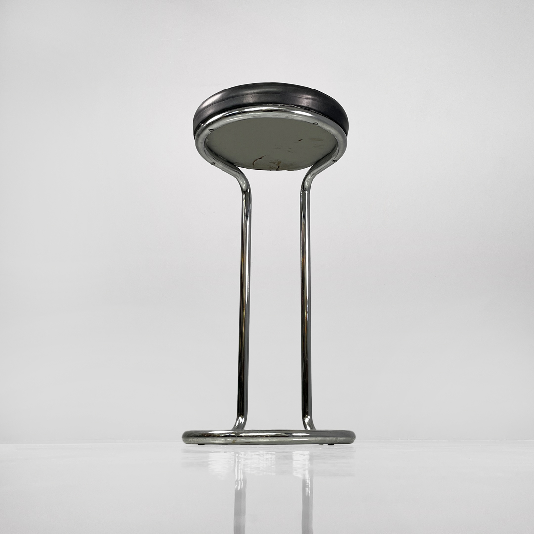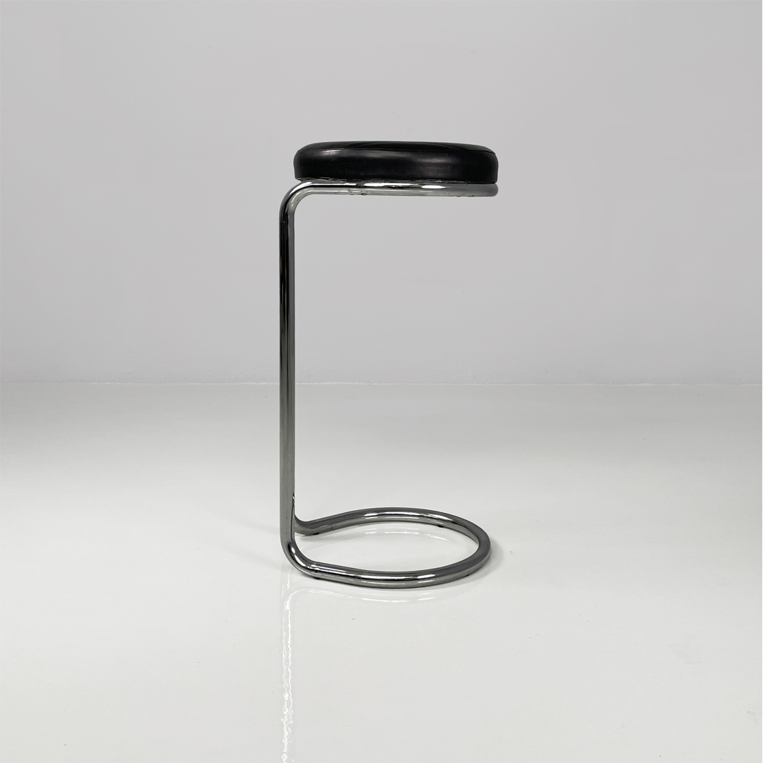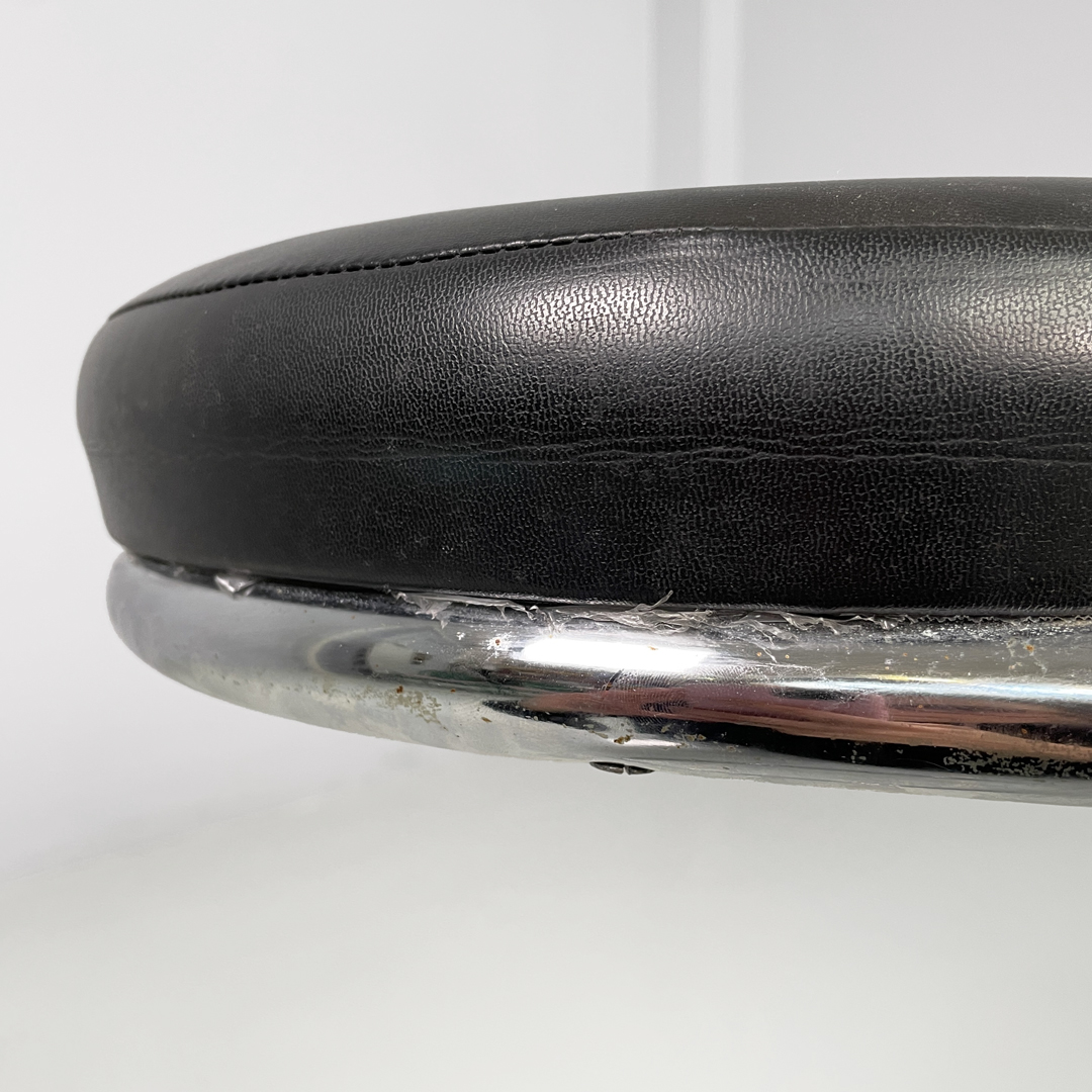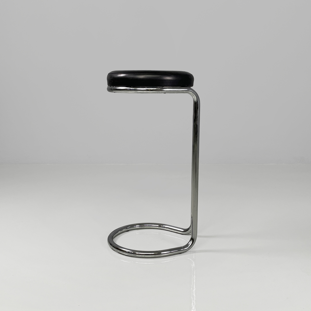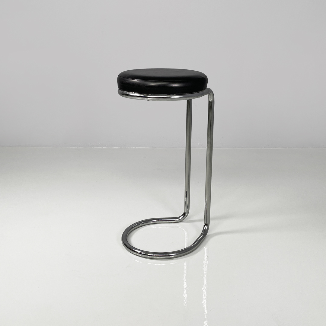 Sgabello da bar a base tonda. La struttura è in tondino di metallo cromato, la seduta è in pelle nera.