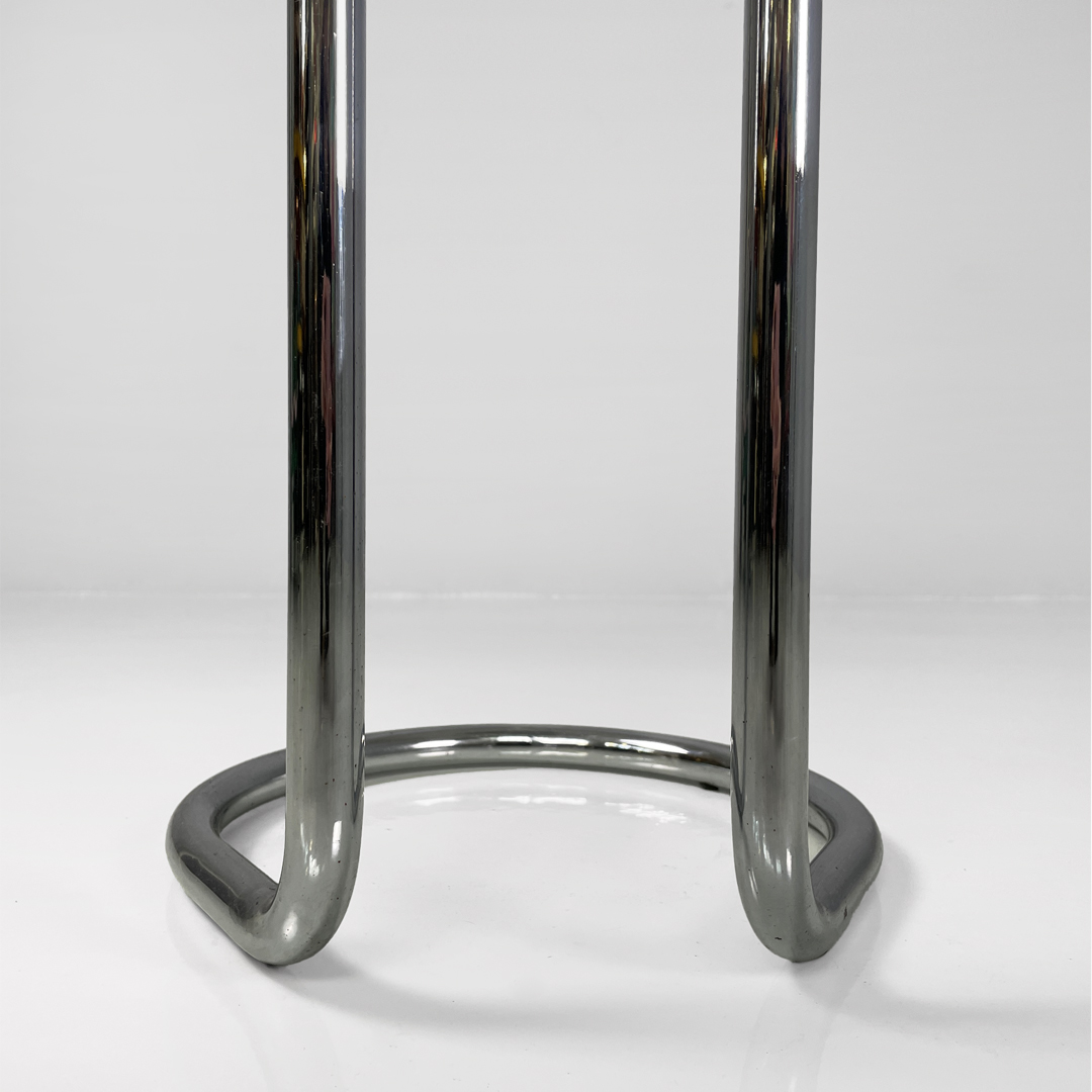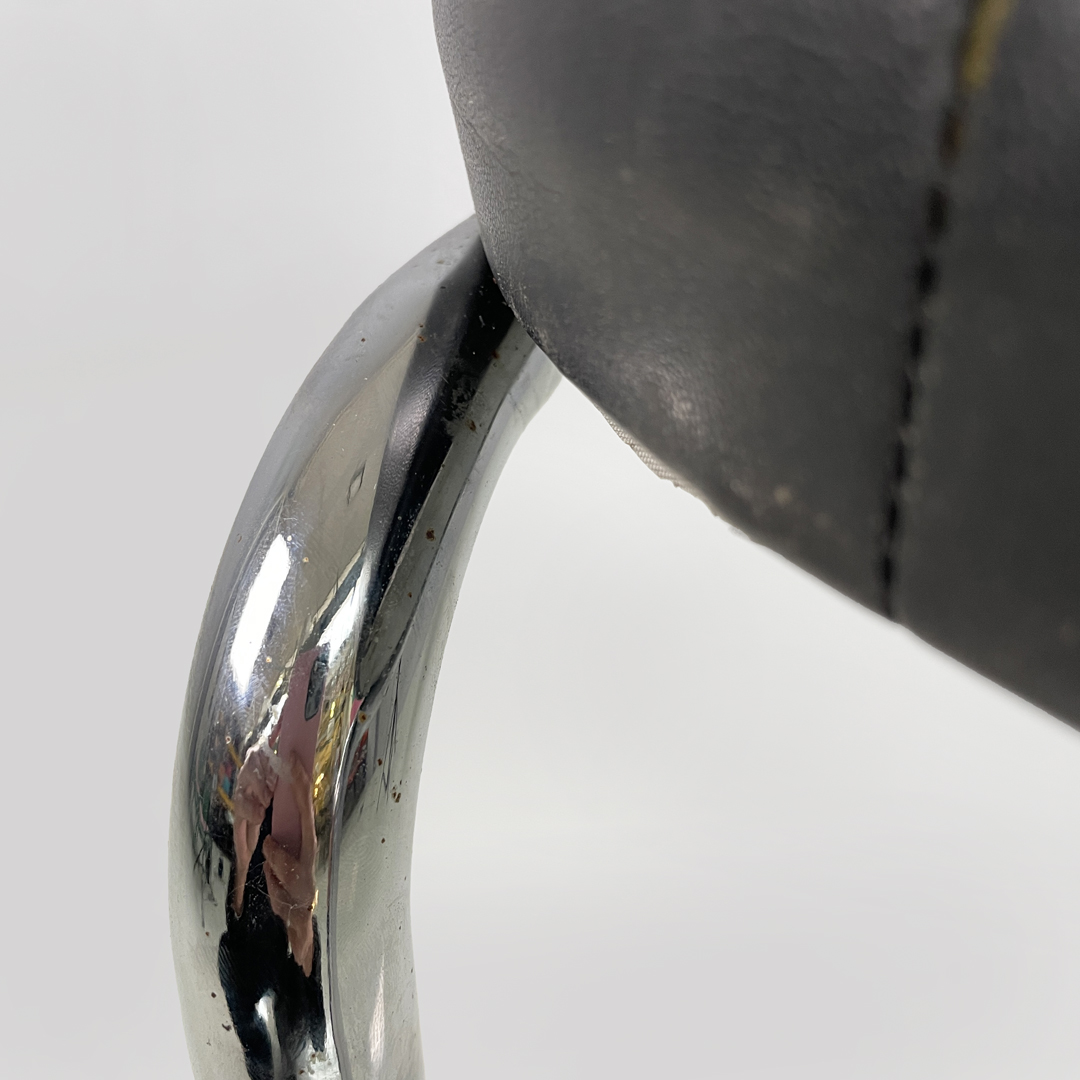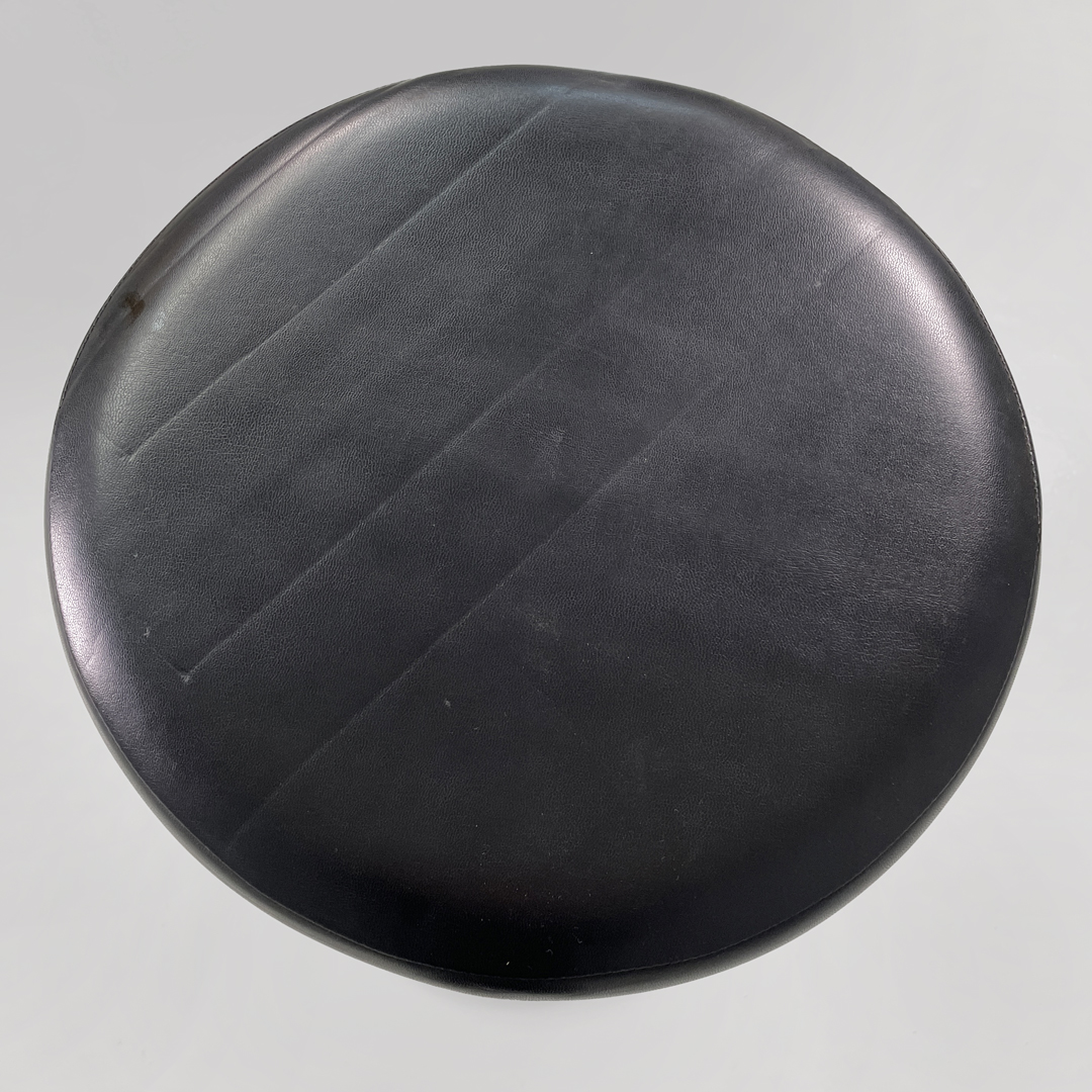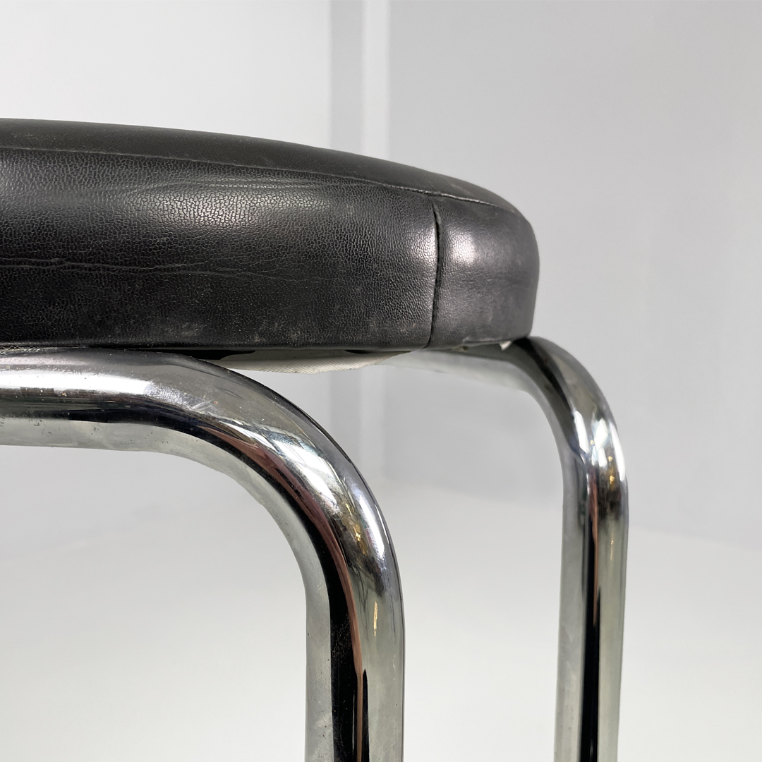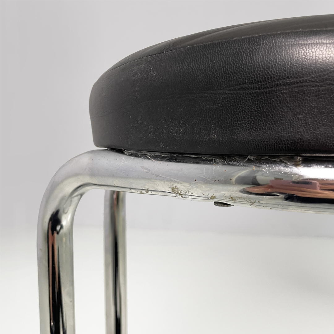 Sgabello da bar a base tonda. La struttura è in tondino di metallo cromato, la seduta è in pelle nera.