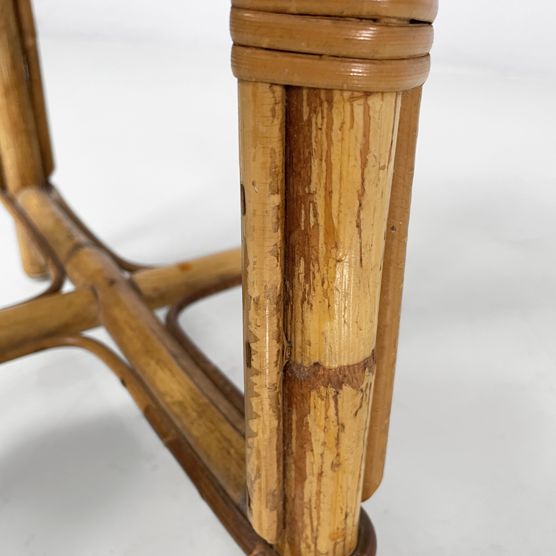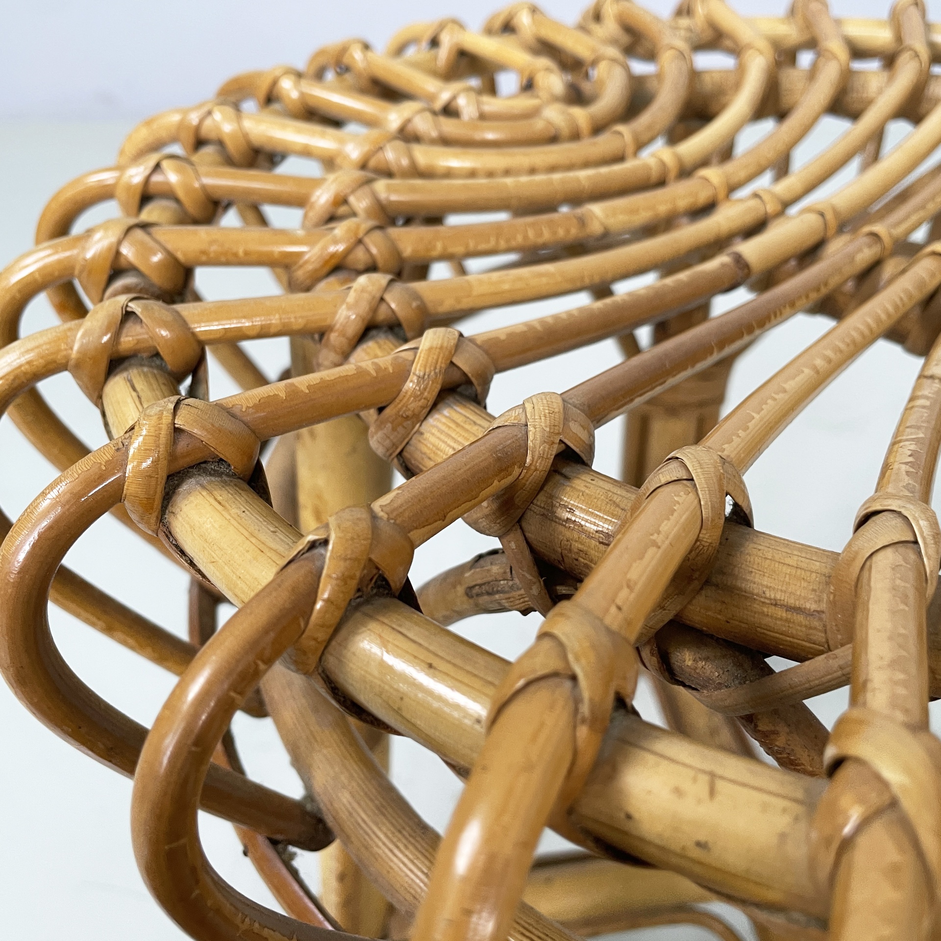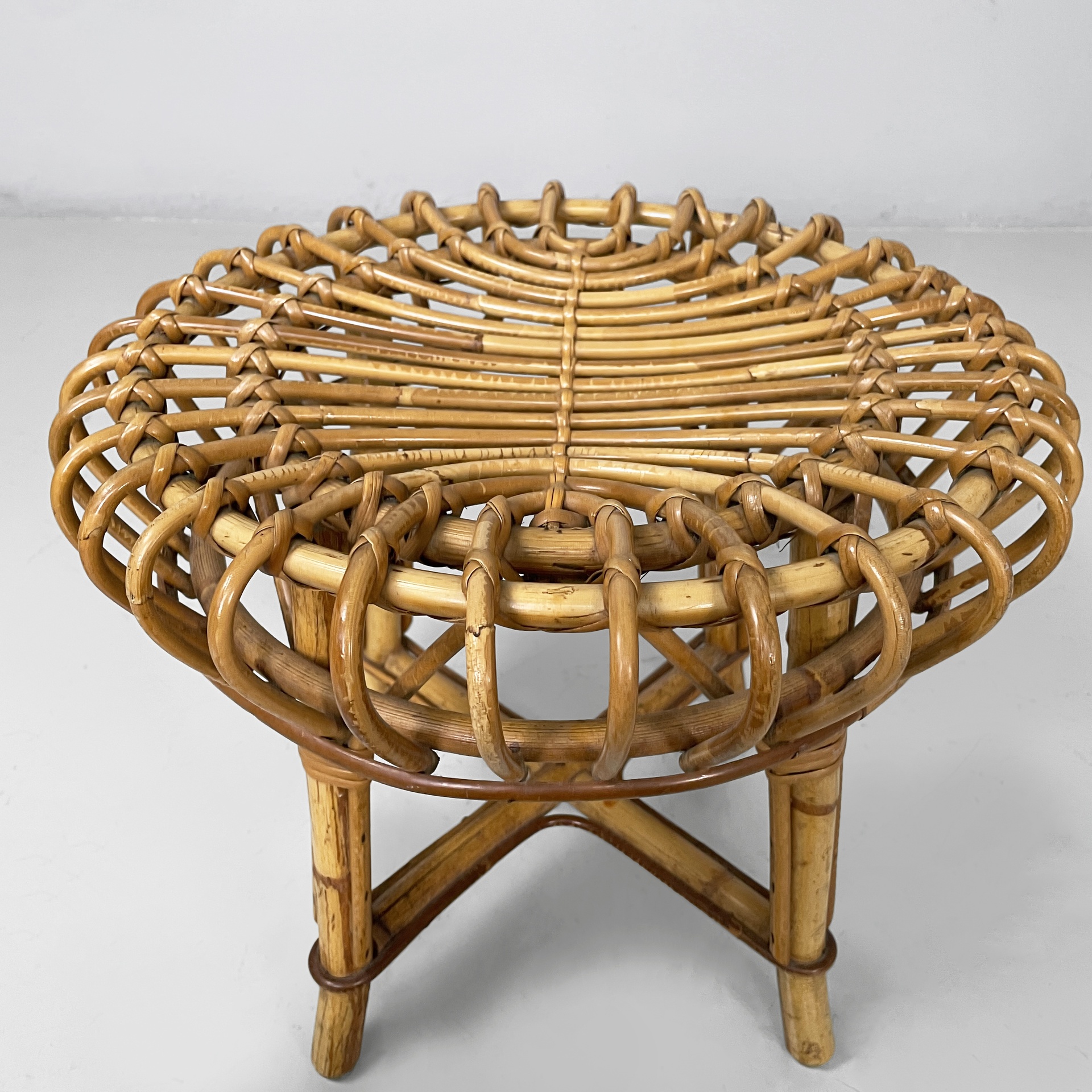 Sgabello da tavolo con seduta tonda, interamente in rattan finemente intrecciato. Le zampe sono unite al centro da una struttura a X. Adatta ad uso esterno come in giardino ed utilizzabile anche come poggiapiedi o pouf.