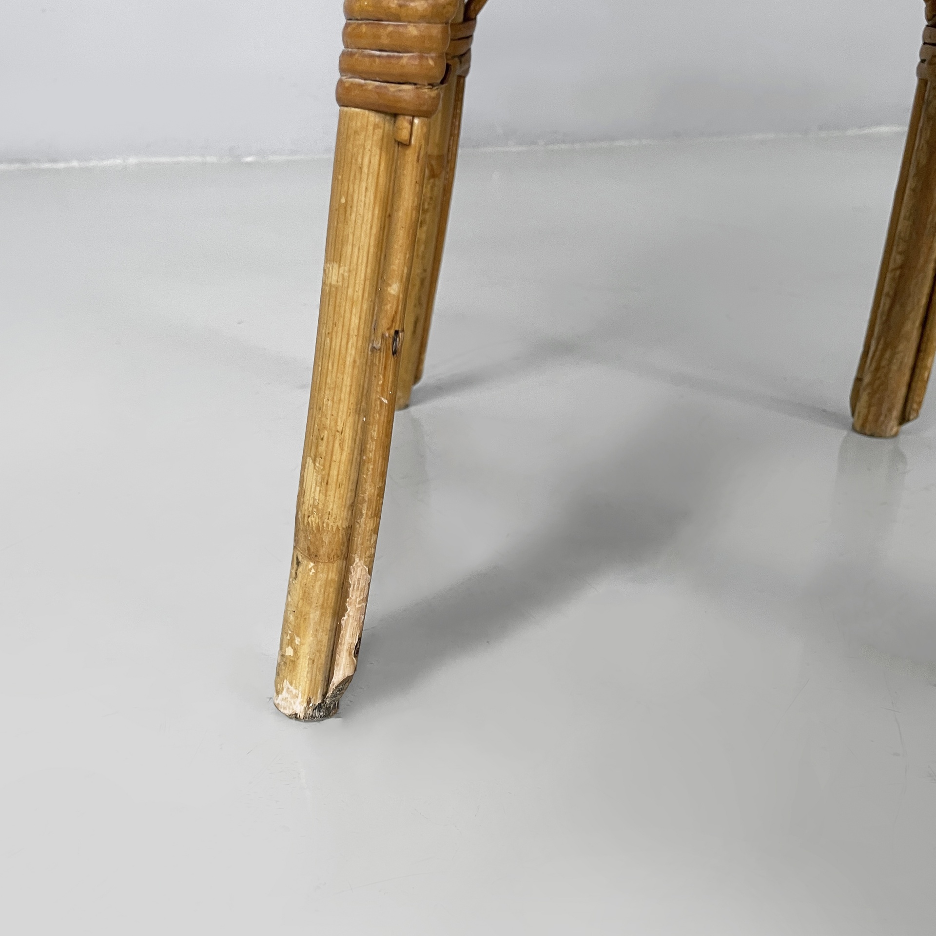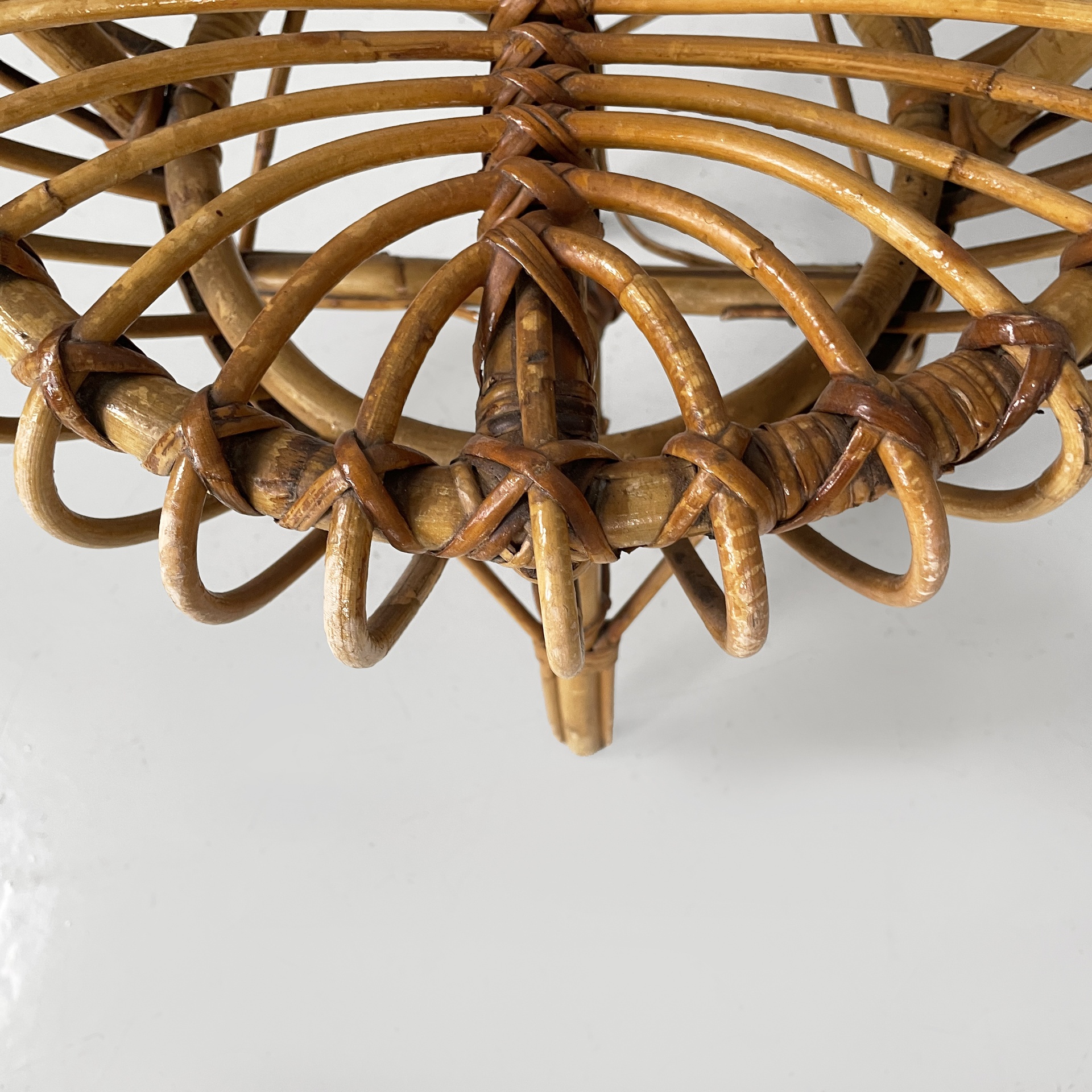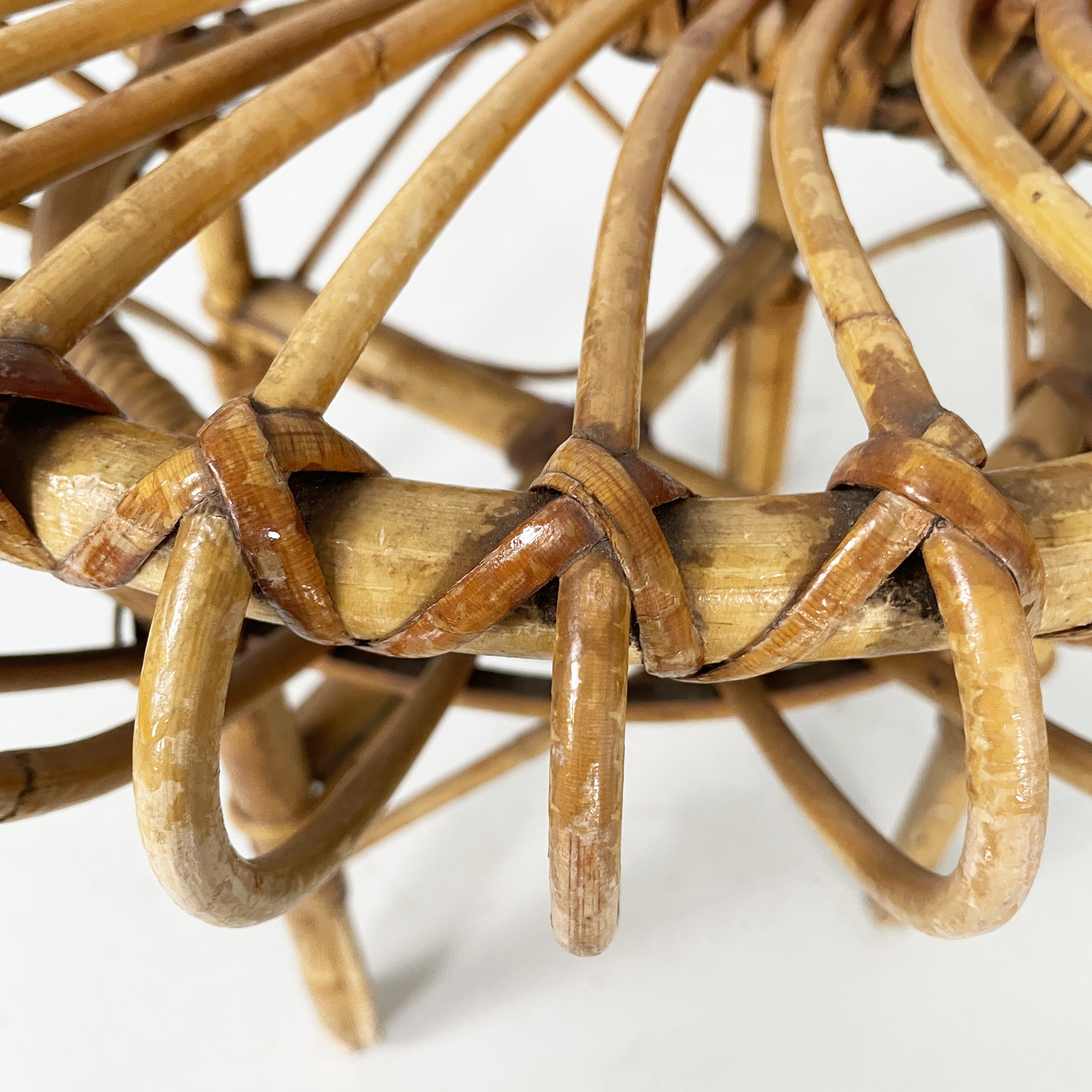 Sgabello da tavolo con seduta tonda, interamente in rattan finemente intrecciato. Le zampe sono unite al centro da una struttura a X. Adatta ad uso esterno come in giardino ed utilizzabile anche come poggiapiedi o pouf.