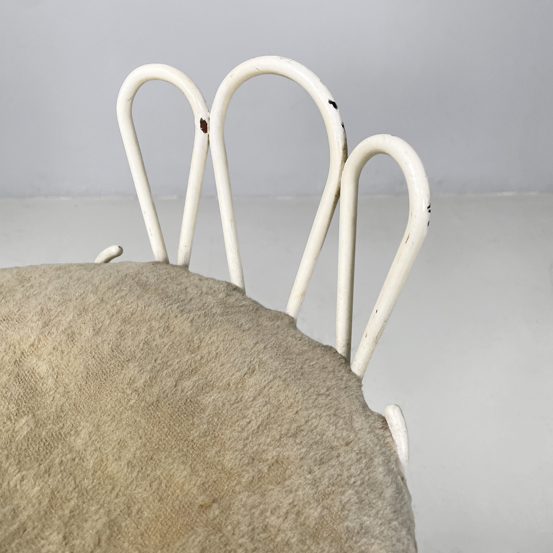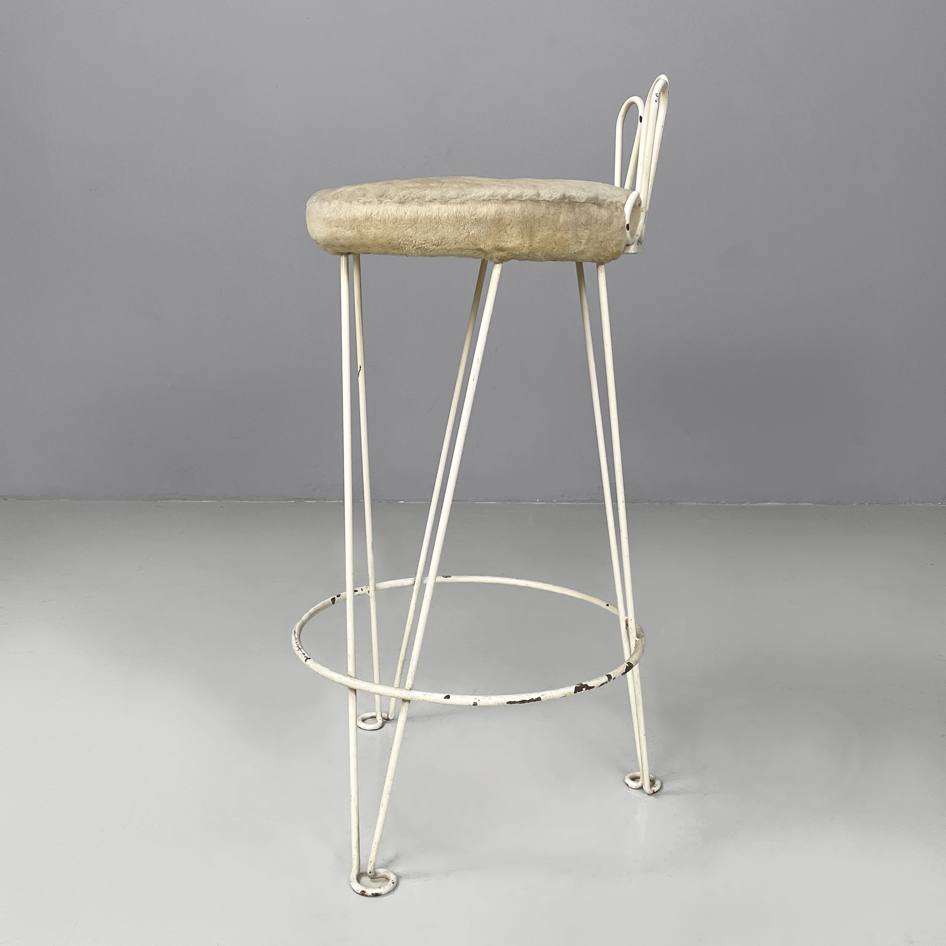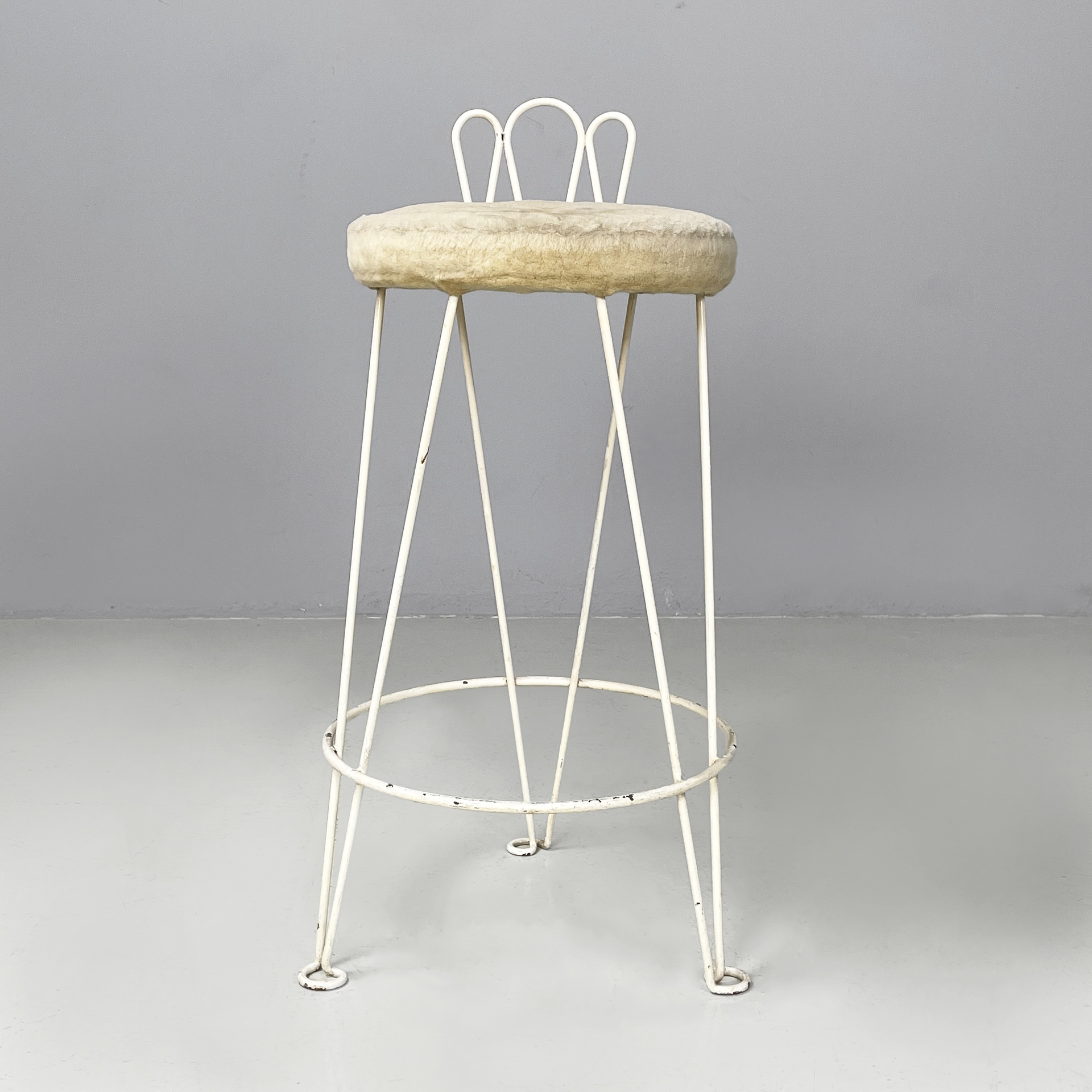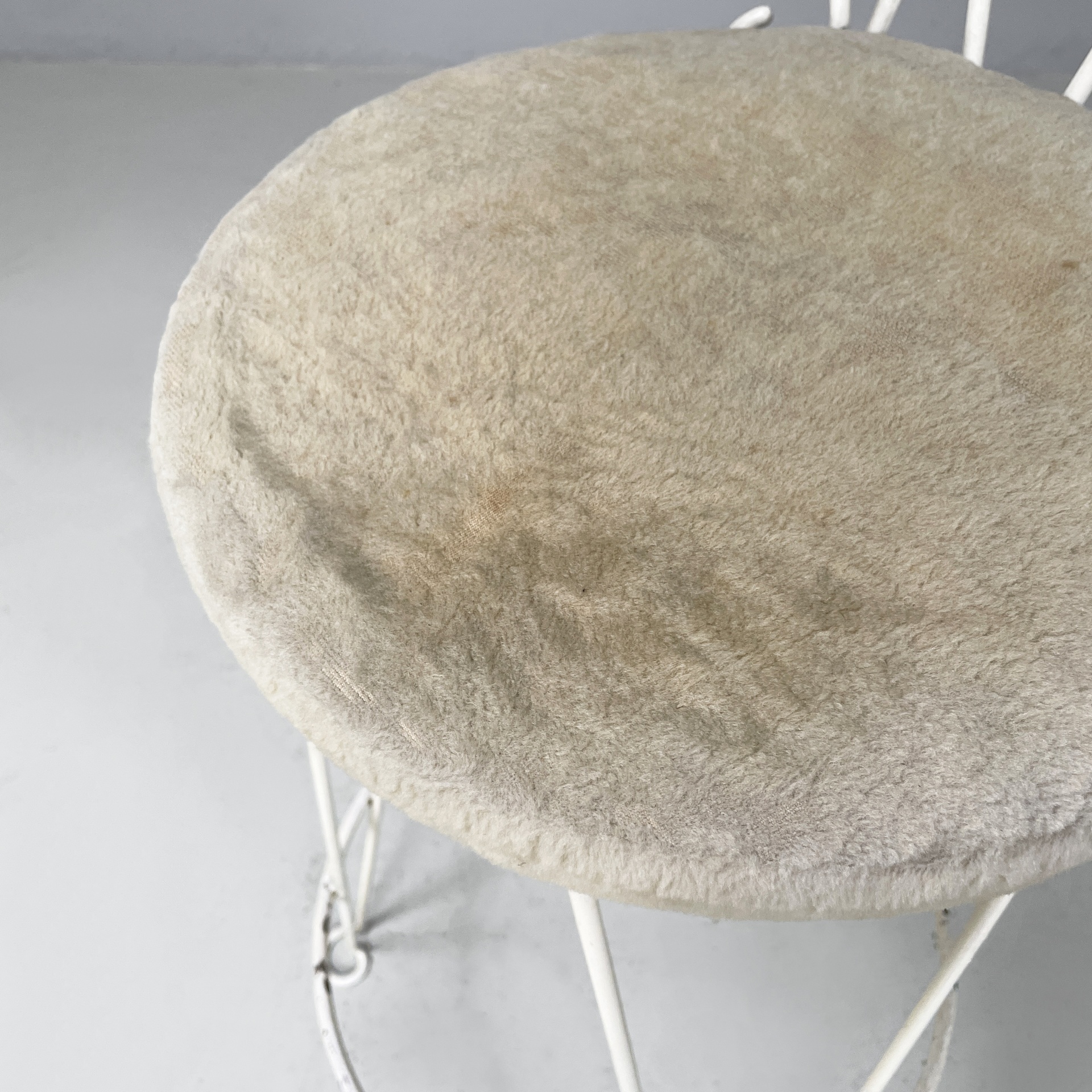 Sgabello da bar con seduta tonda in tessuto peloso bianco. Lo schienale è composto da un tondino di metallo verniciato bianco con decorazioni a ricciolo. Le tre zampe, i piedini tondi e il poggiapiedi sono in tondino di metallo bianco. Utilizzabile anche in esterno come in giardino.