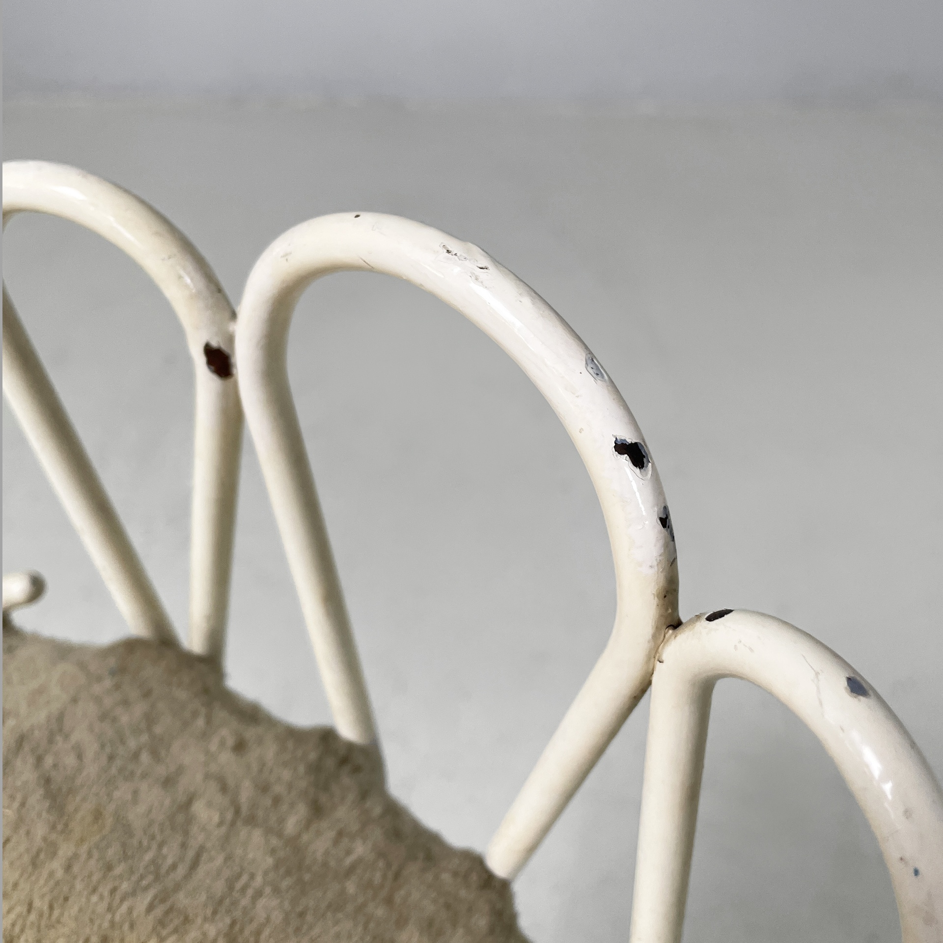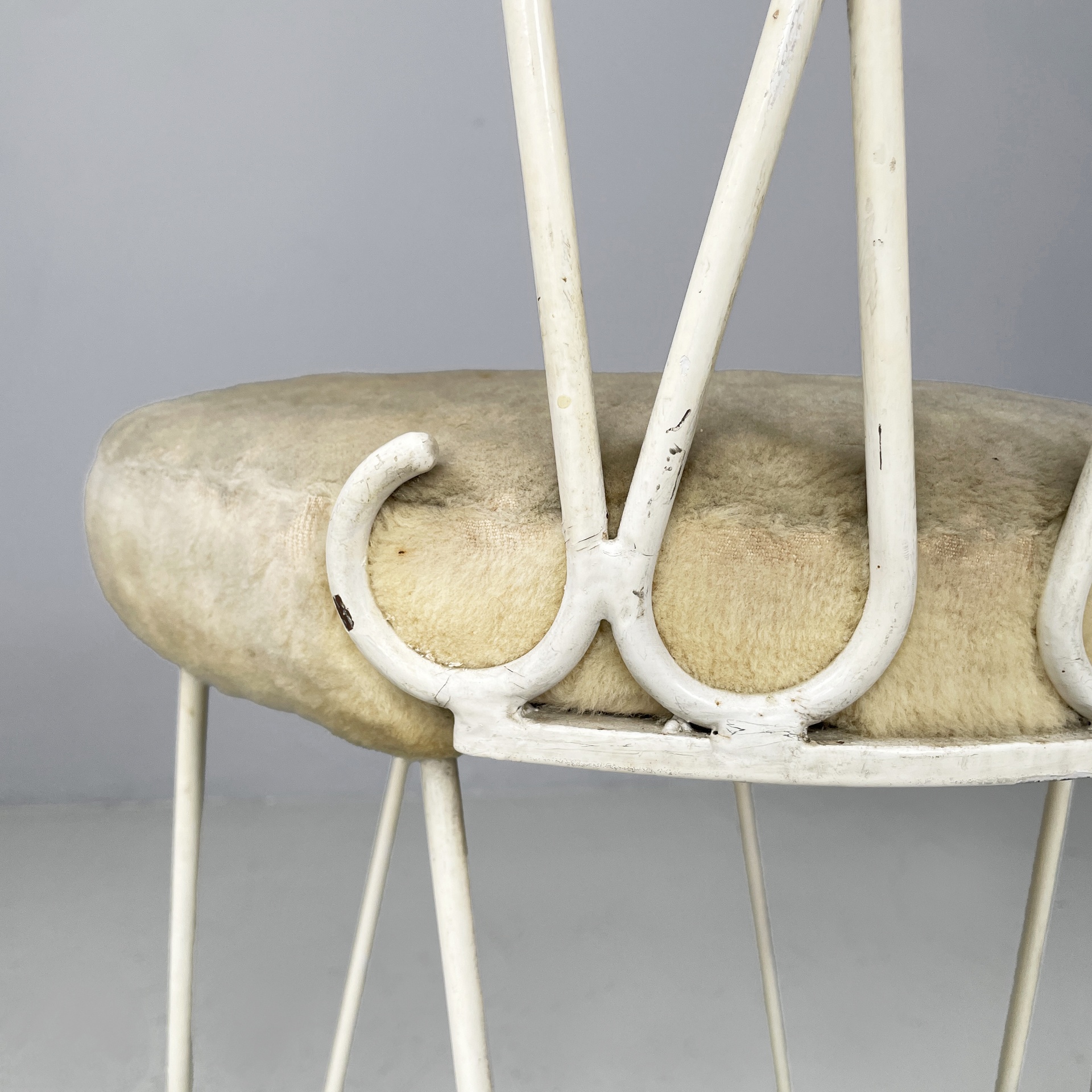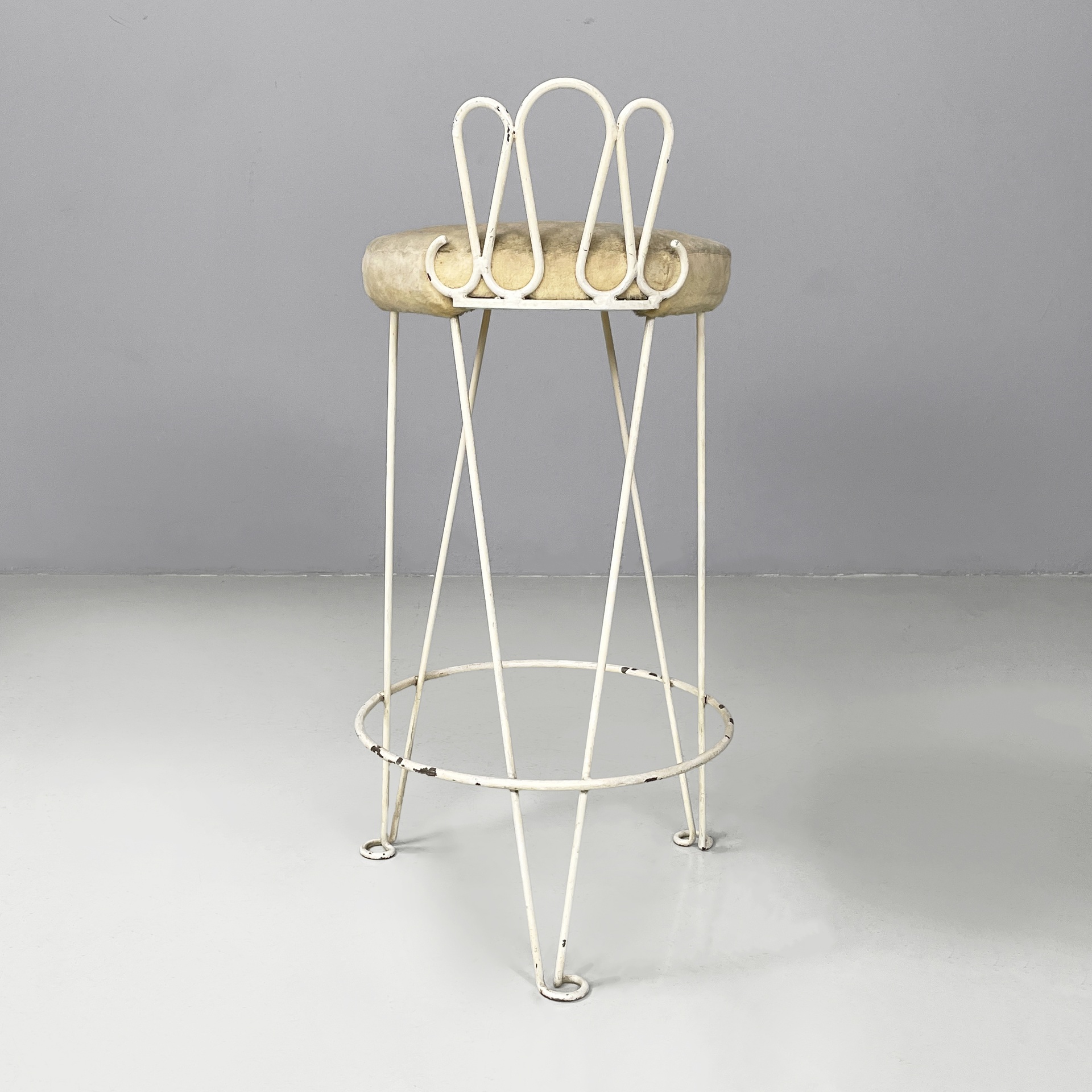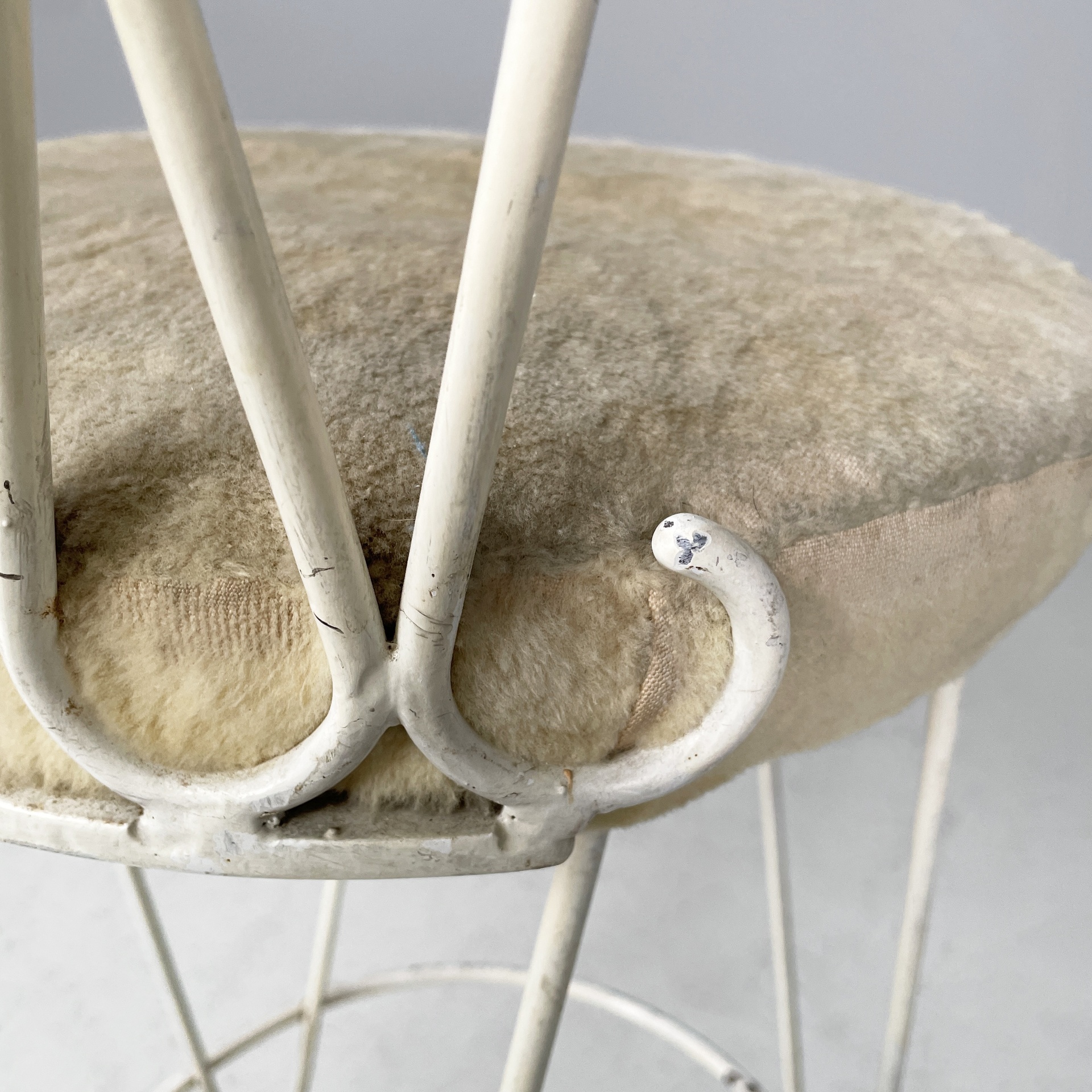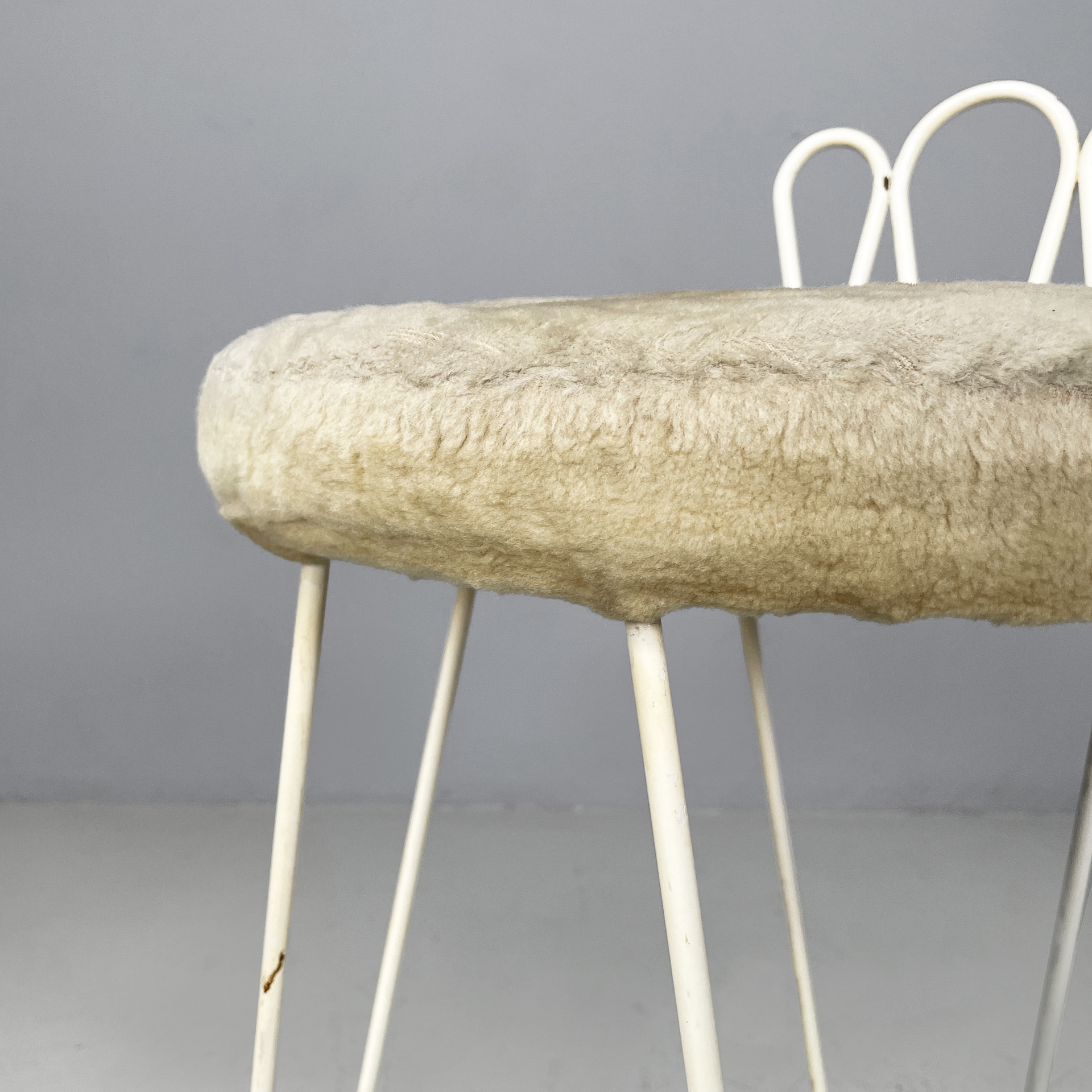 Sgabello da bar con seduta tonda in tessuto peloso bianco. Lo schienale è composto da un tondino di metallo verniciato bianco con decorazioni a ricciolo. Le tre zampe, i piedini tondi e il poggiapiedi sono in tondino di metallo bianco. Utilizzabile anche in esterno come in giardino.