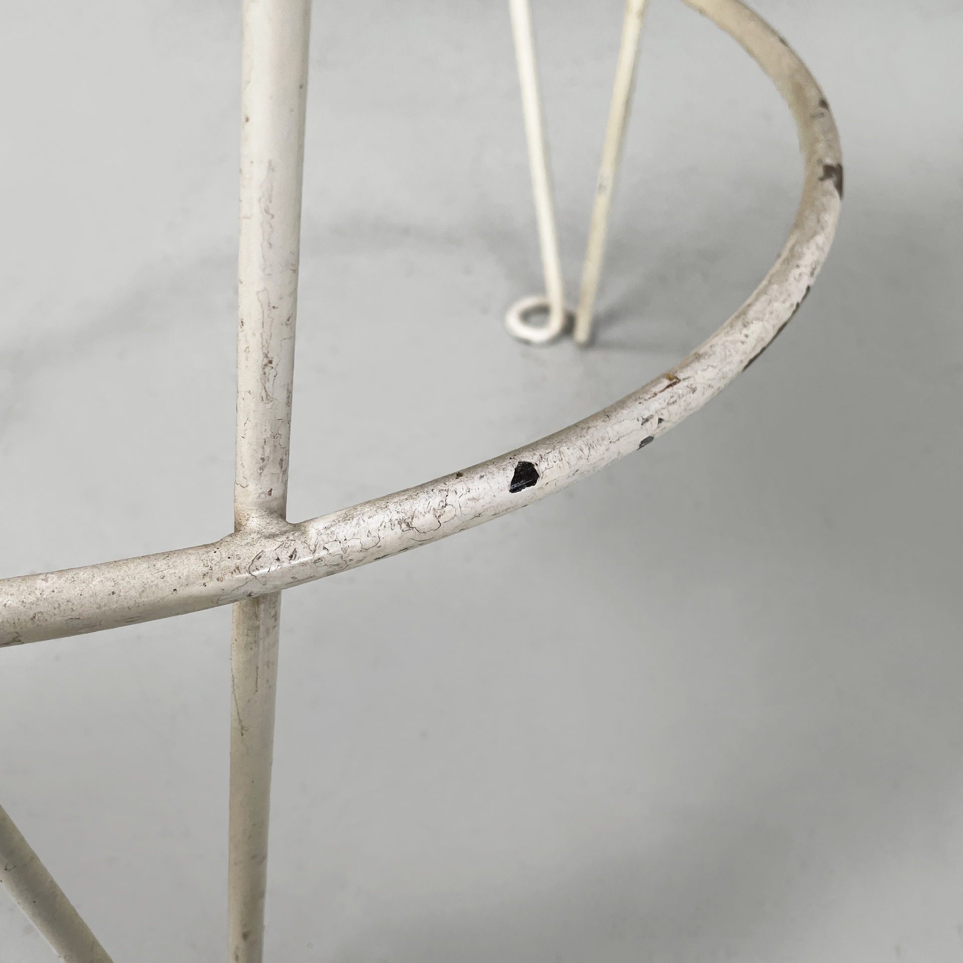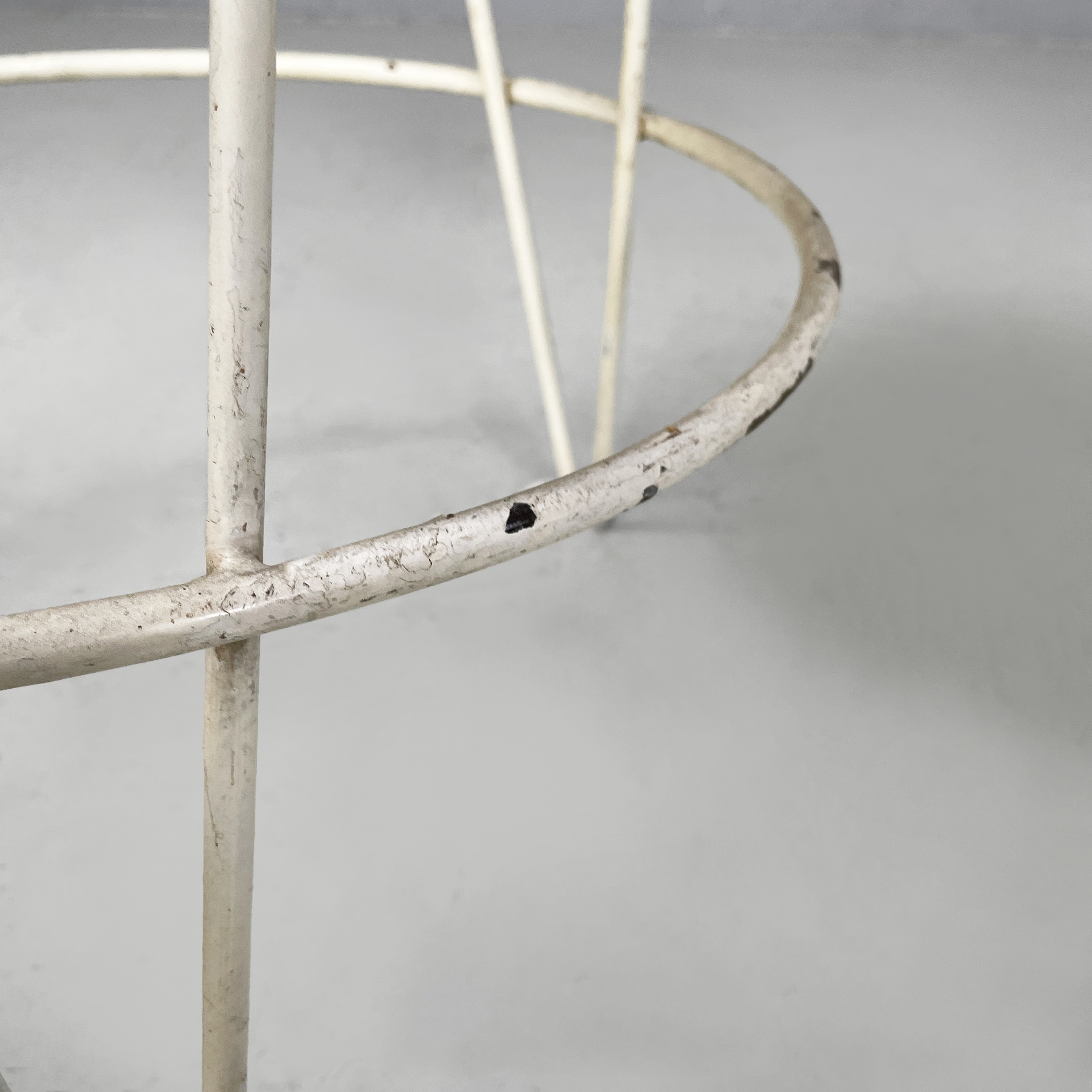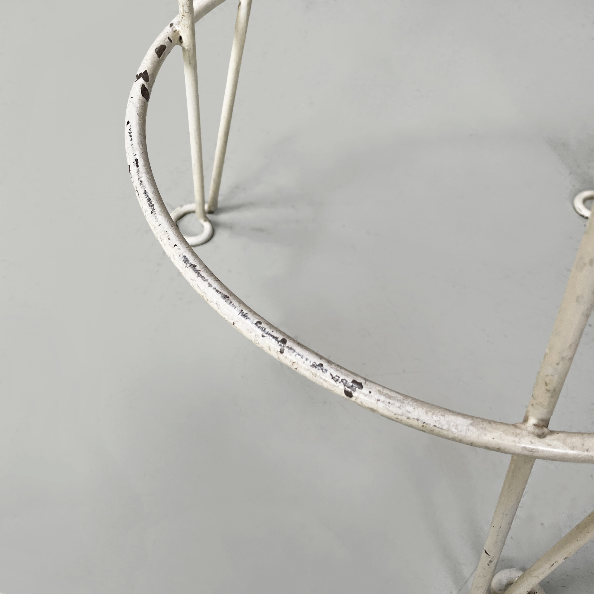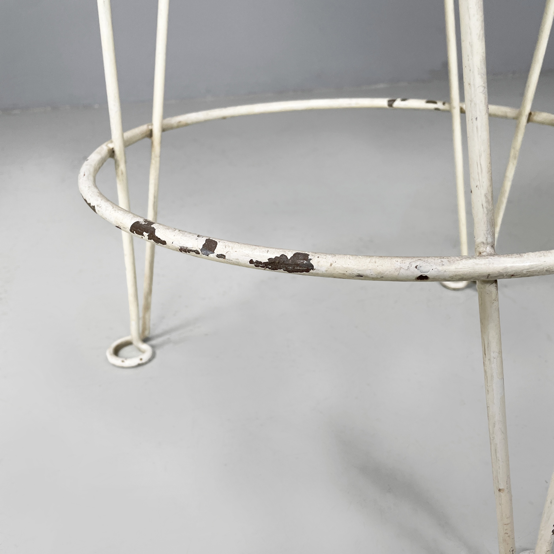 Sgabello da bar con seduta tonda in tessuto peloso bianco. Lo schienale è composto da un tondino di metallo verniciato bianco con decorazioni a ricciolo. Le tre zampe, i piedini tondi e il poggiapiedi sono in tondino di metallo bianco. Utilizzabile anche in esterno come in giardino.