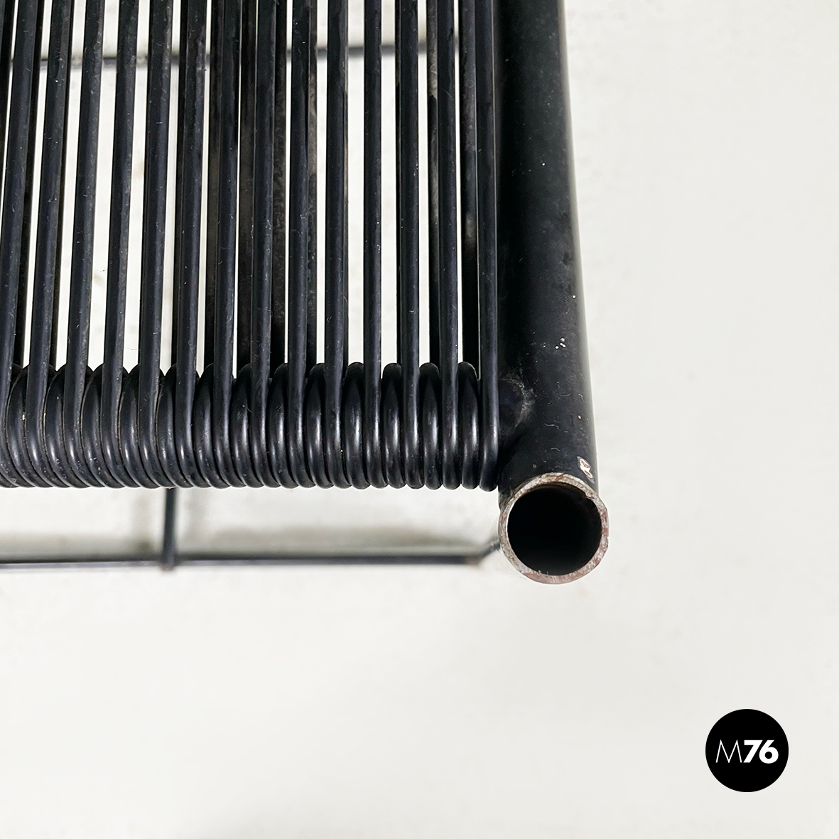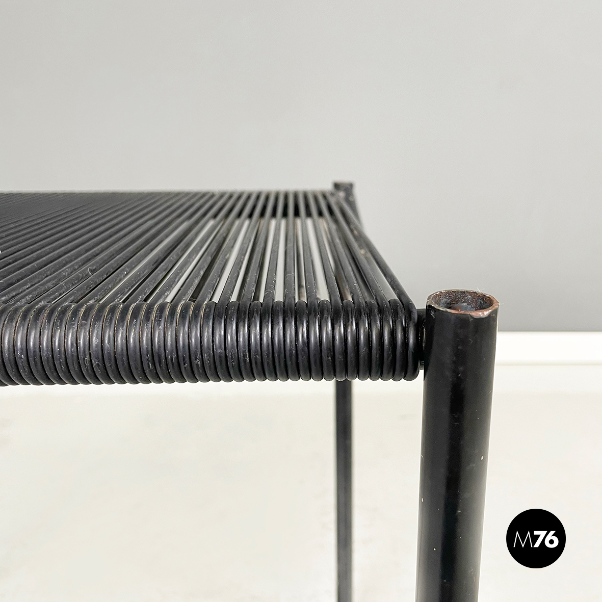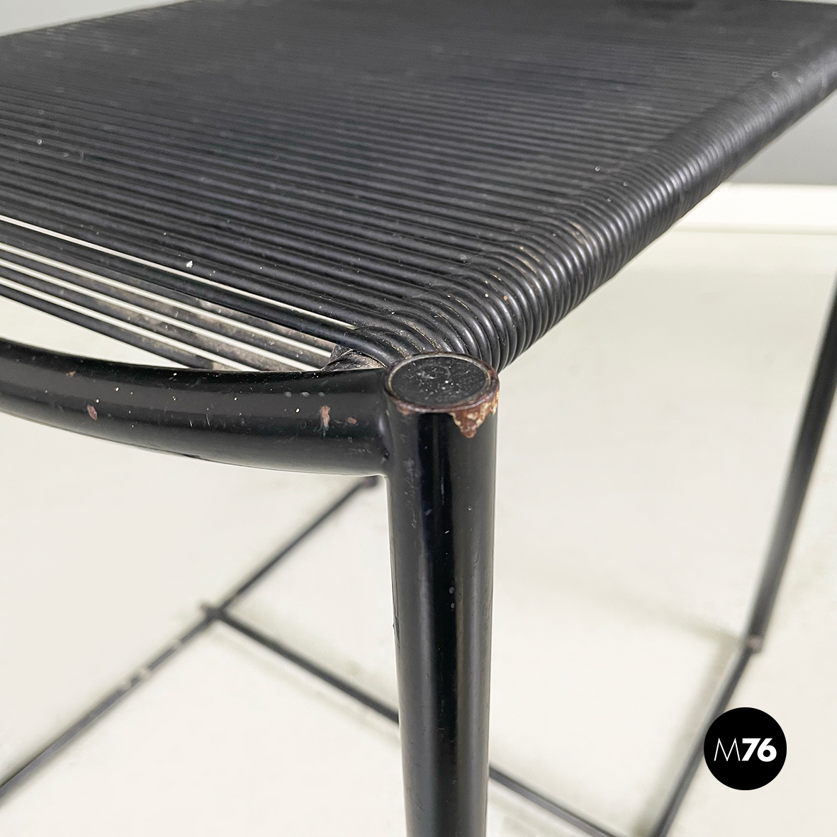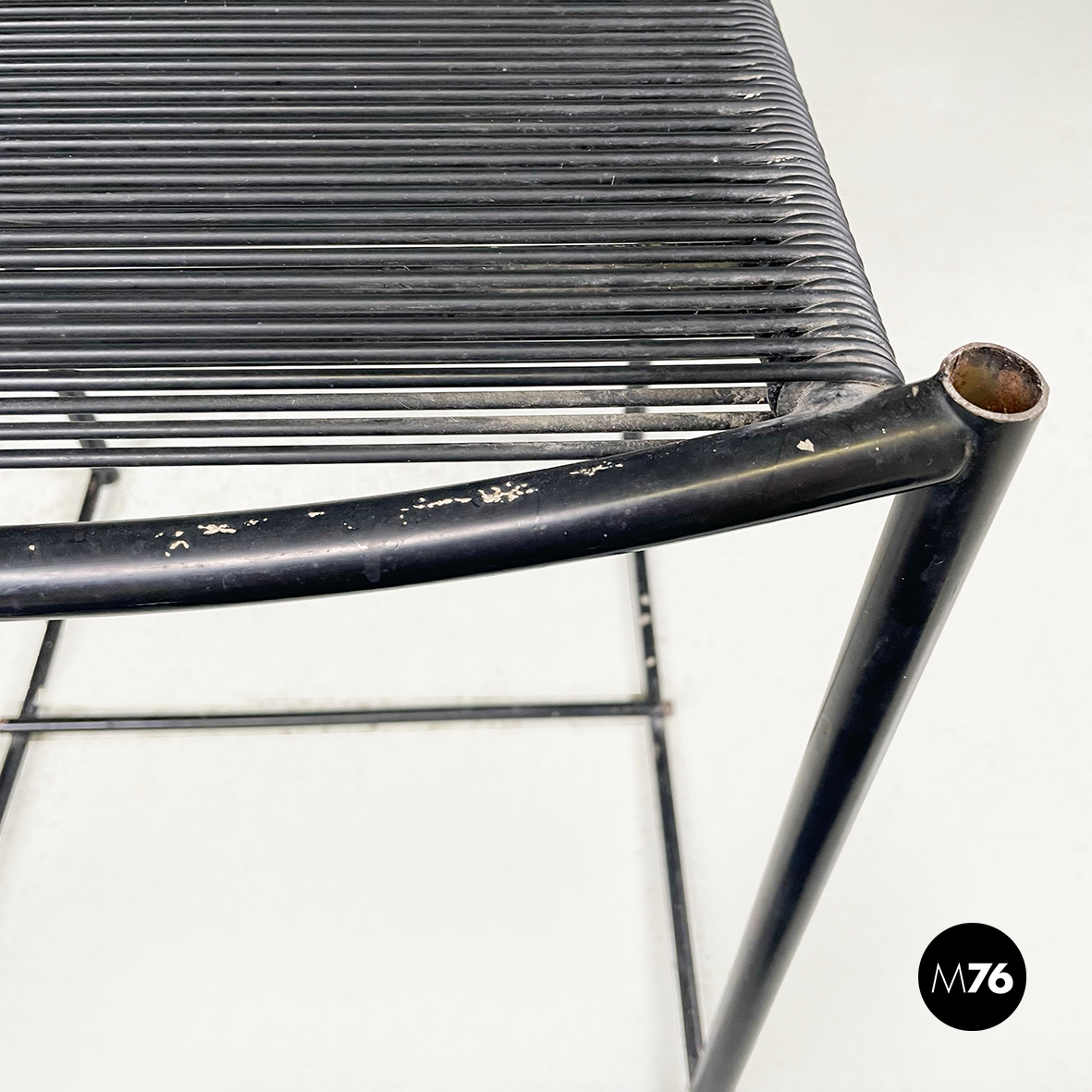 Sgabello da tavolo modello Spaghetti con seduta e schienale rettangolari ed elastici realizzati da fili di scooby nero. La struttura è in tondino di metallo verniciato nero con manico curvato dietro lo schienale.