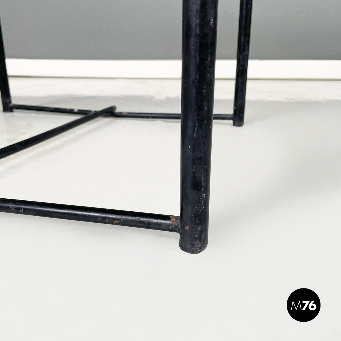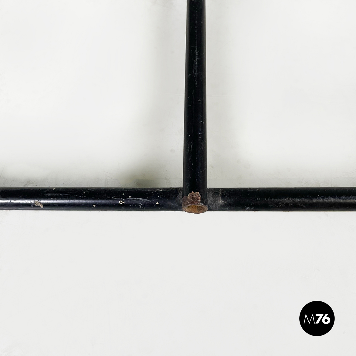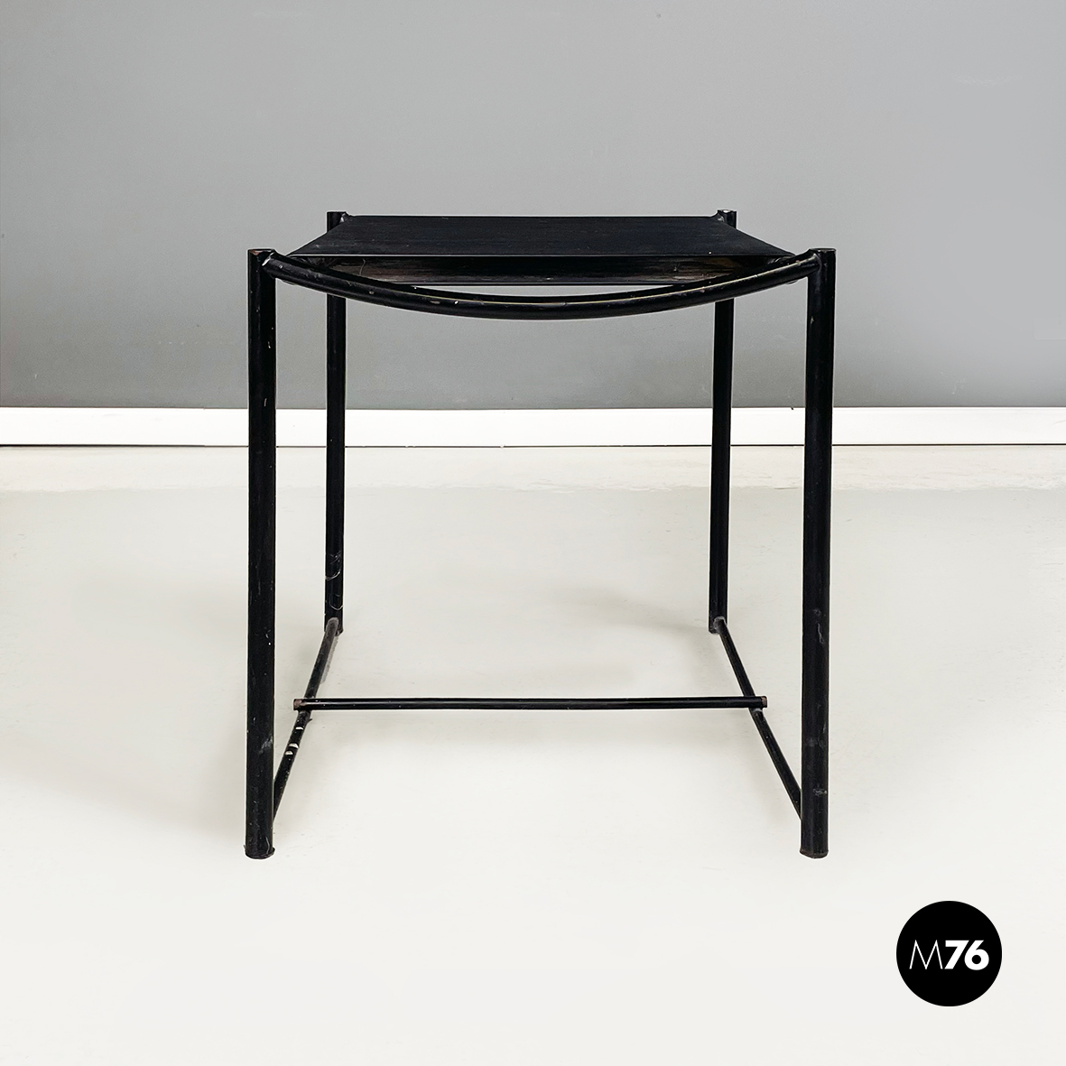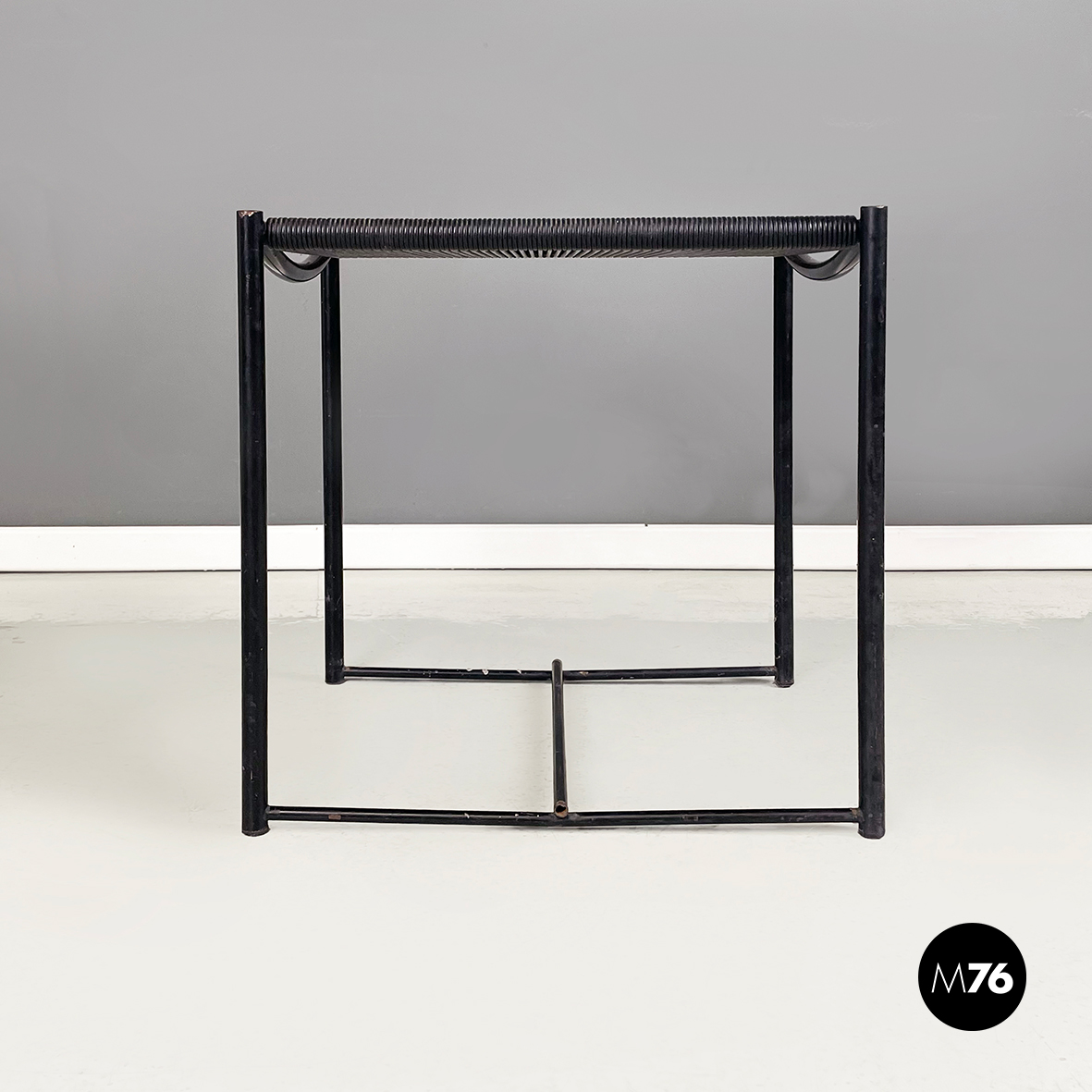 Sgabello da tavolo modello Spaghetti con seduta e schienale rettangolari ed elastici realizzati da fili di scooby nero. La struttura è in tondino di metallo verniciato nero con manico curvato dietro lo schienale.