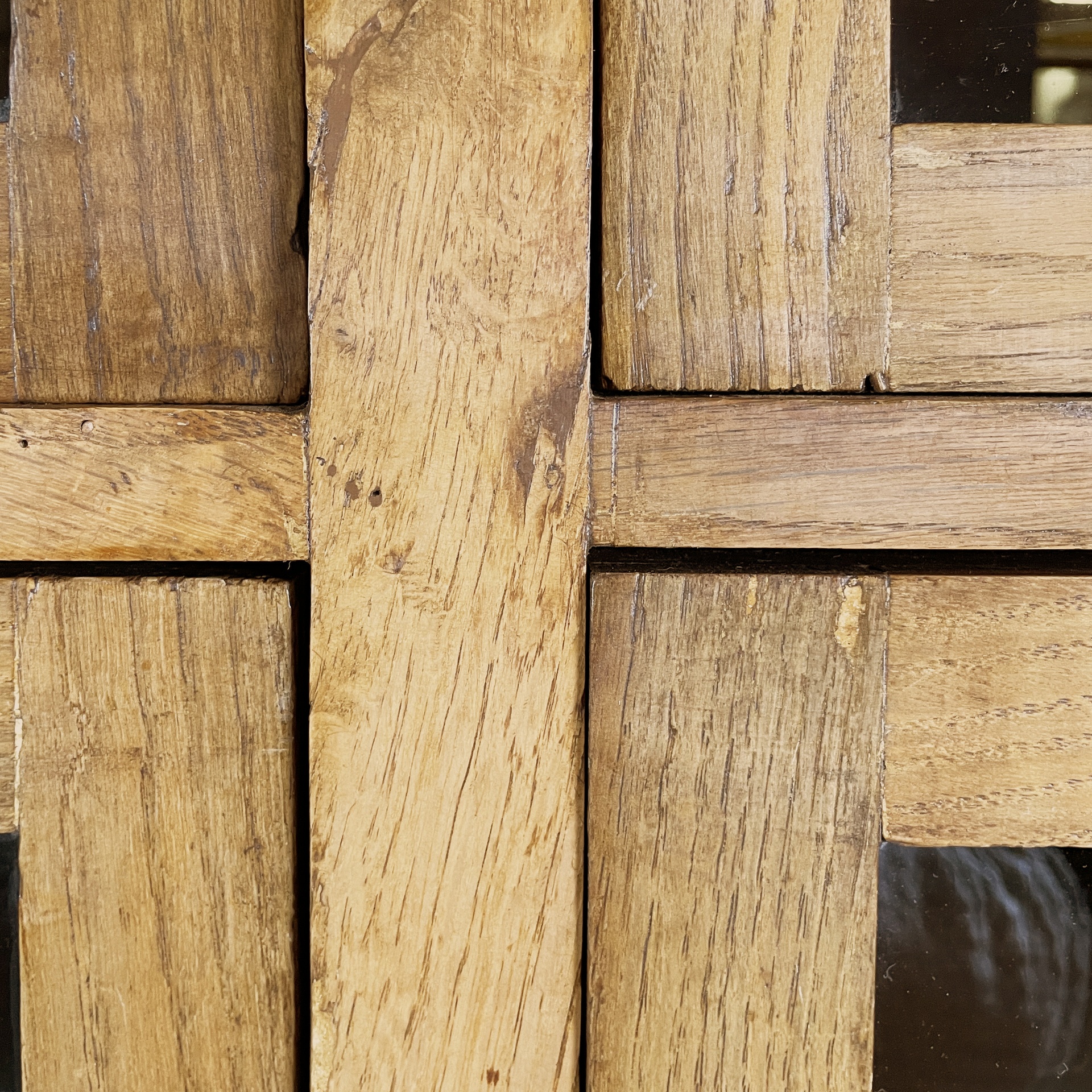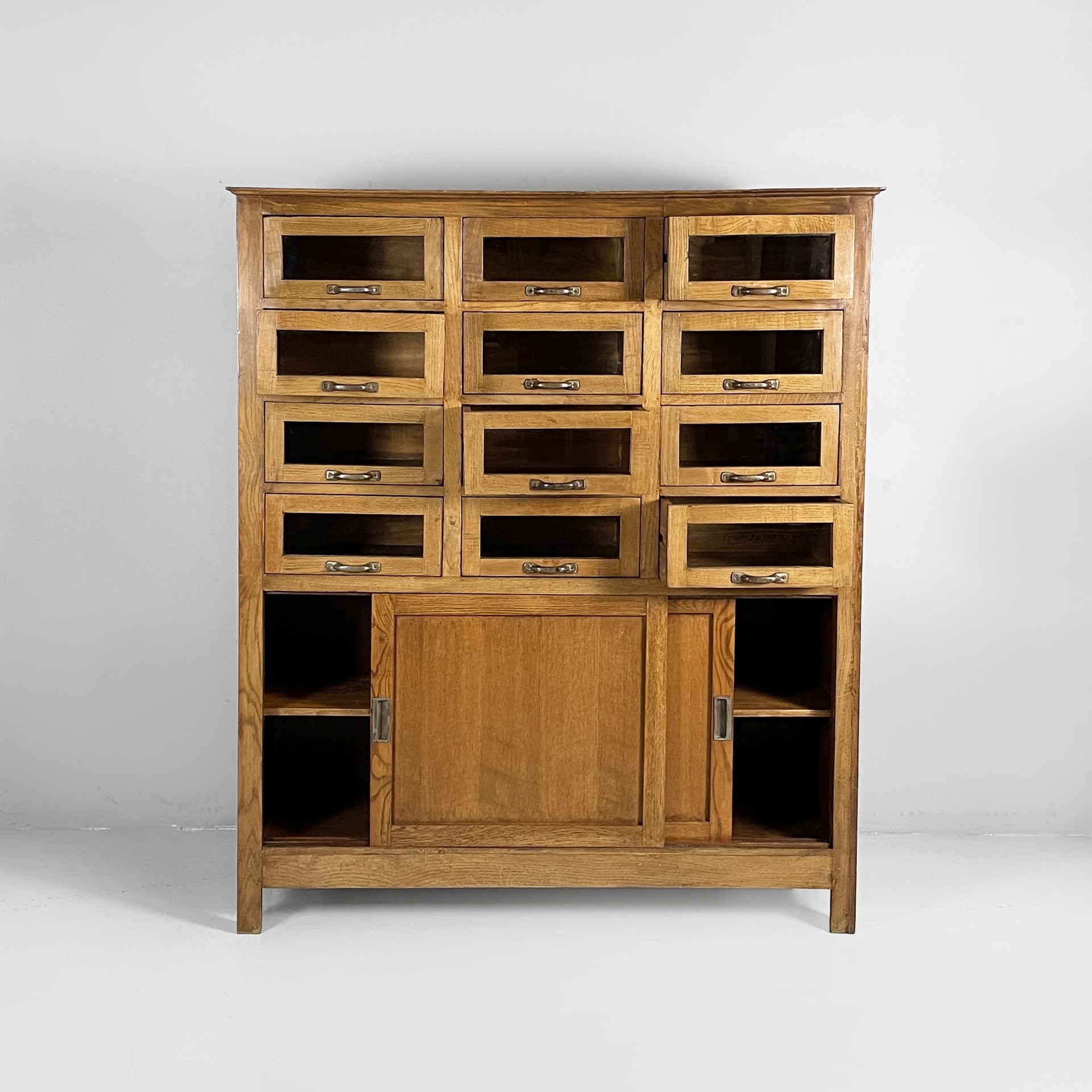 Credenza con struttura in legno. Il sideboard presenta nella parte alta quattro file da tre cassetti in vetro con profili in legno e maniglie in metallo. Nella parte inferiore è presente un vano con doppia anta a scorrimento e maniglie in metallo. Piedini squadrati in legno.
