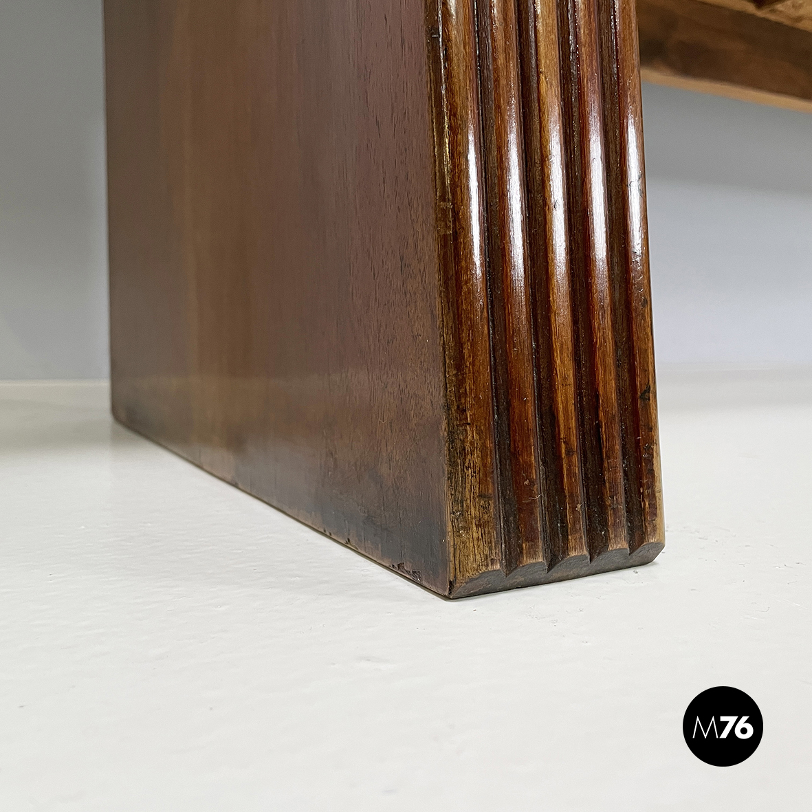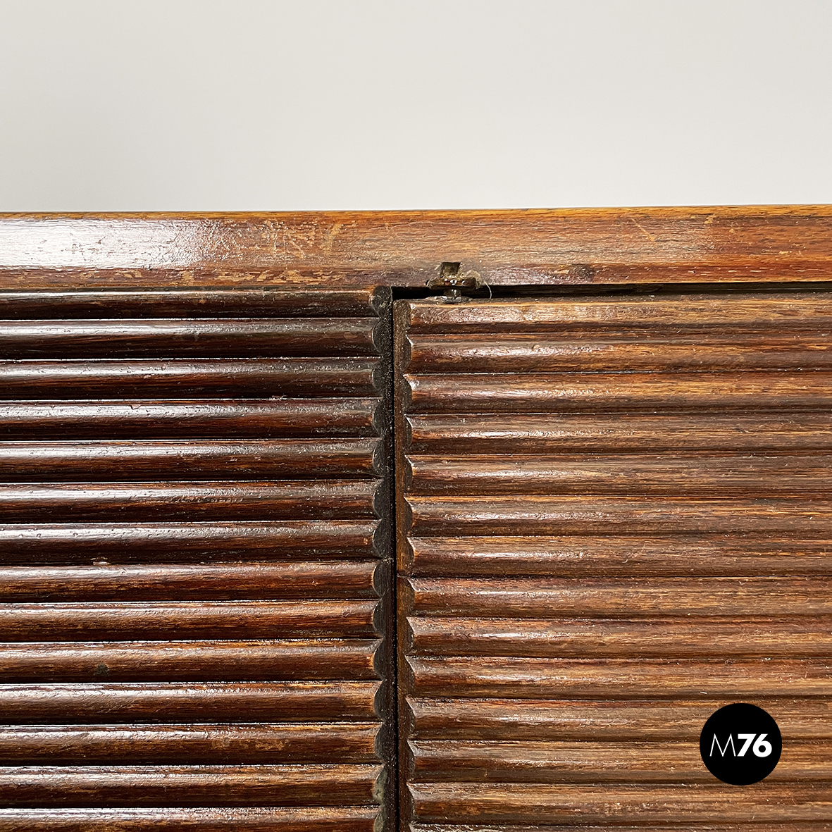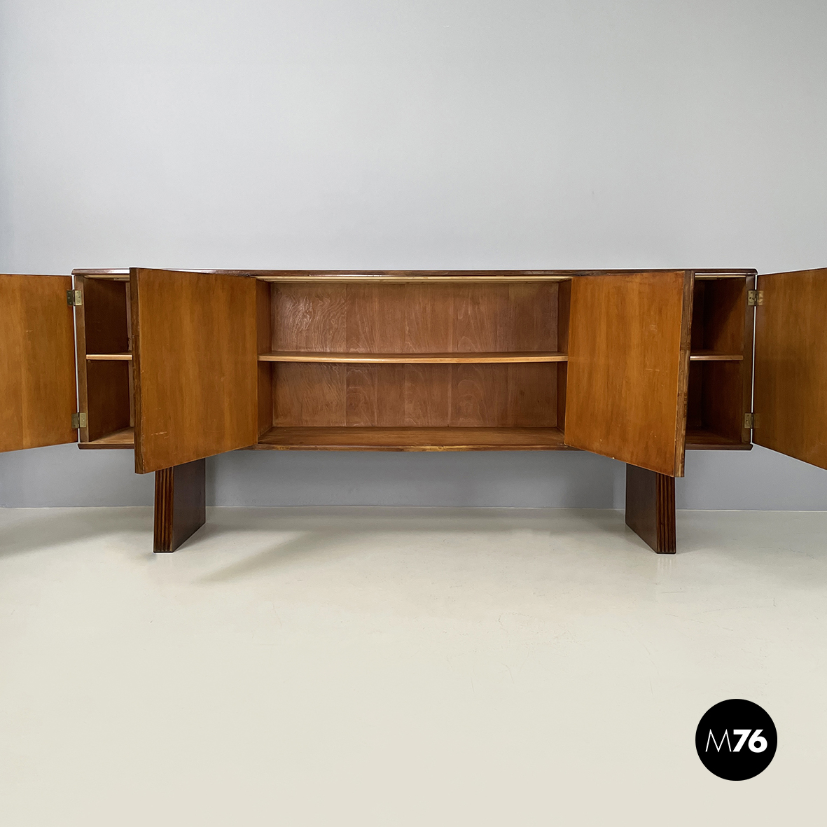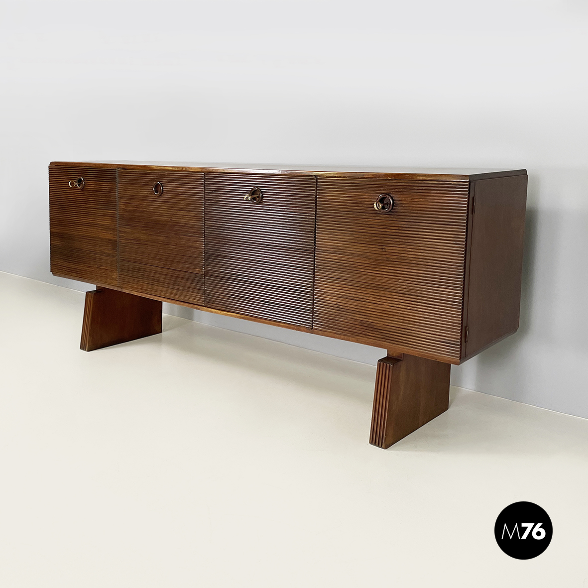 Sideboard con piano rettangolare in legno. Presenta quattro ante grissinate, ciascuna con un foro con cornice in legno tornito che fa da maniglia. Tre ante su quattro hanno le chiavi, funzionanti, in ottone dorato. All’interno sono presenti tre vani, i due laterali sono più piccoli mentre quello centrale è più ampio, tutti e tre gli spazi hanno mensole in legno. Le due gambe sono leggermente meno profonde della struttura principale e sono a sezione rettangolare, la parte davanti presenta la stessa grissinatura decorativa delle ante.