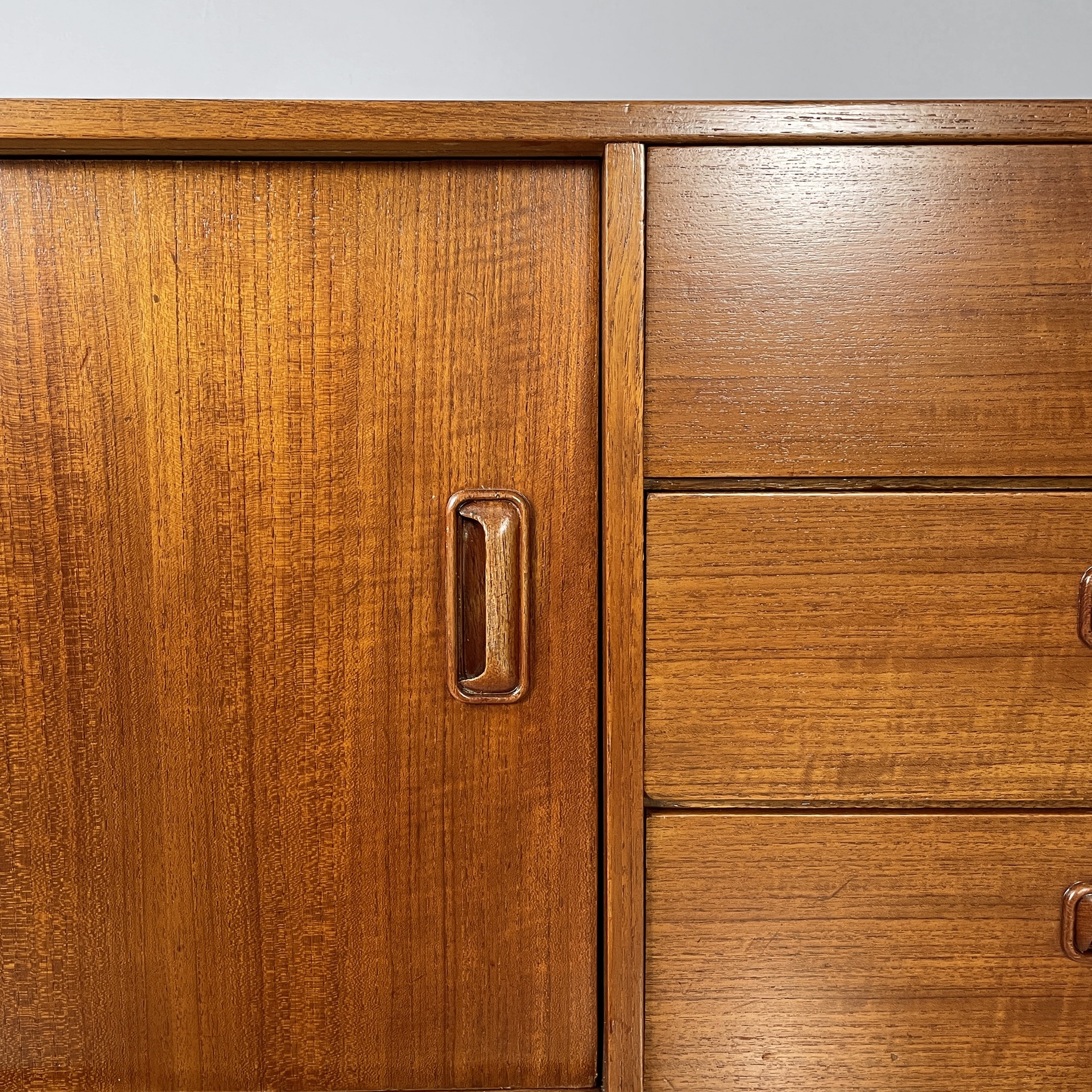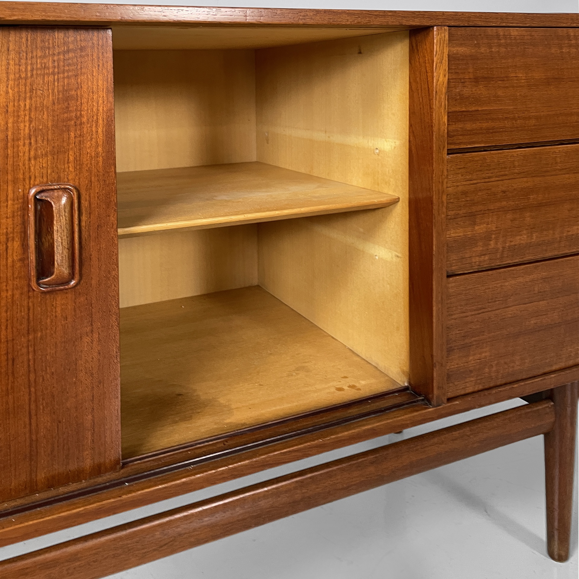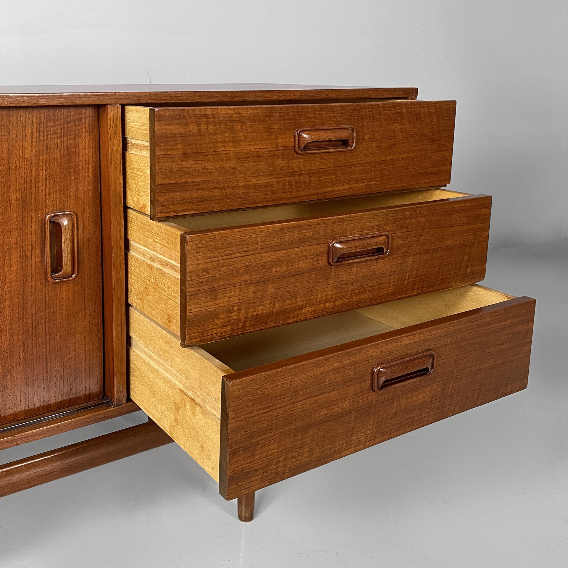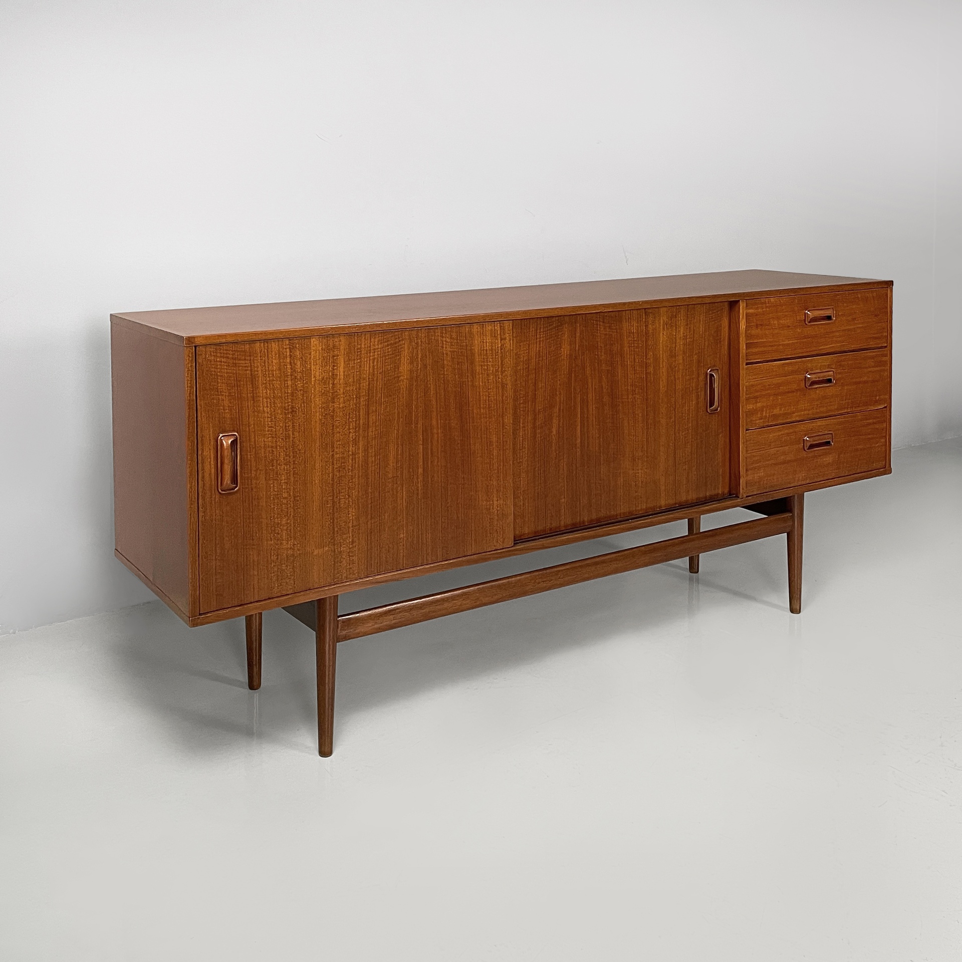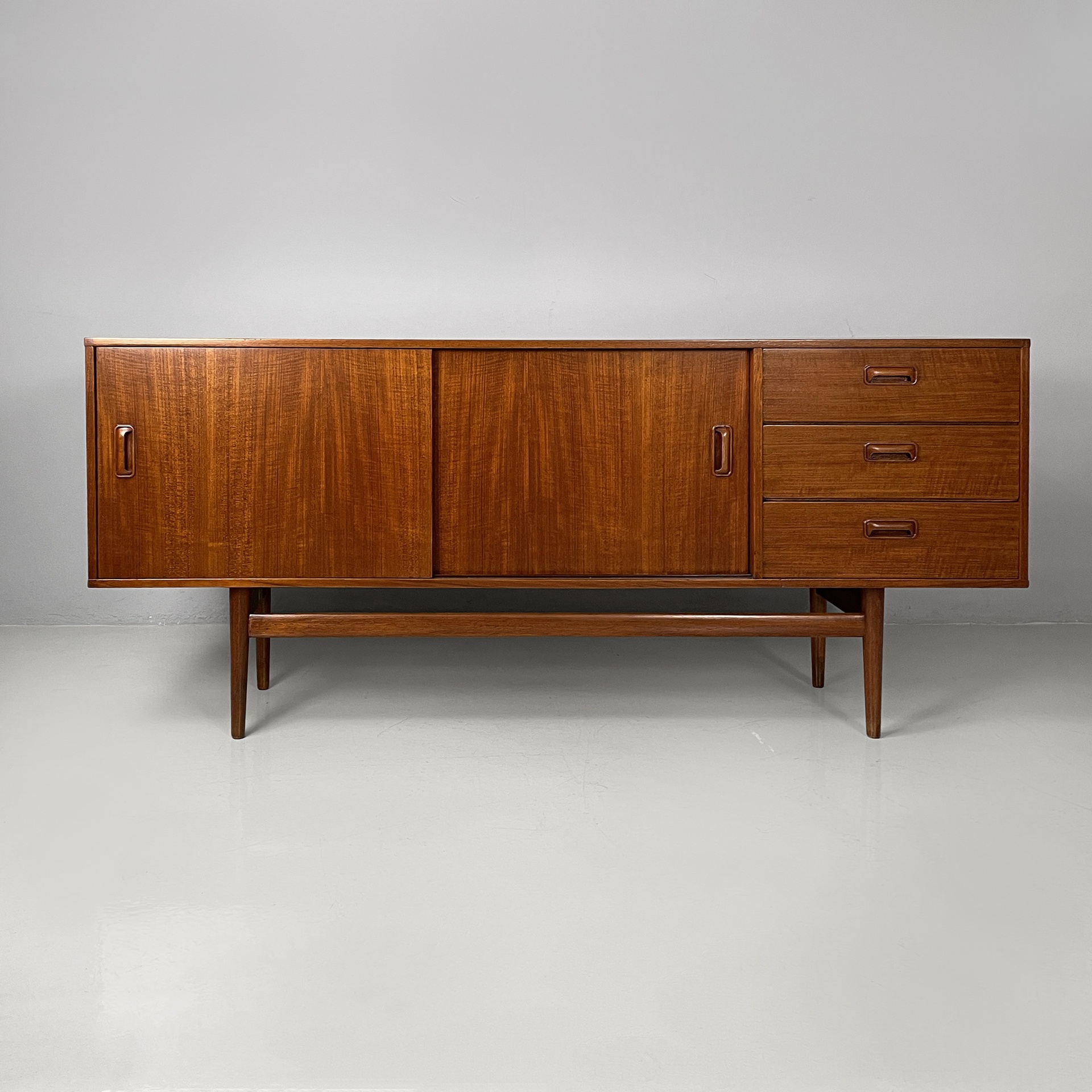 Sideboard a base rettangolare interamente in legno. Sul fronte sono presenti una colonna di tre cassetti, due vani con anta scorrevole e mensola interna. Le zampe a sezione tonda sono unite da listelli orizzontali.