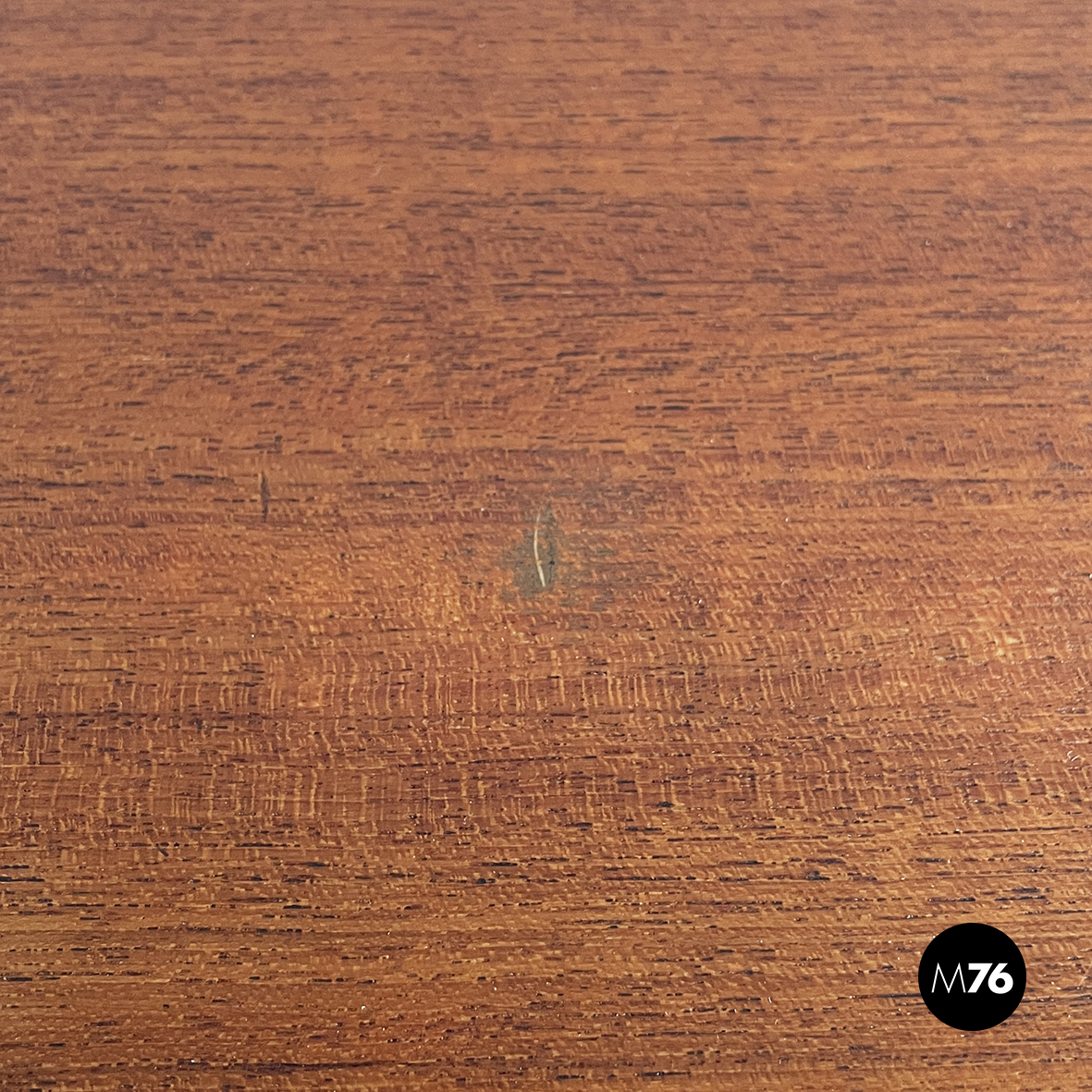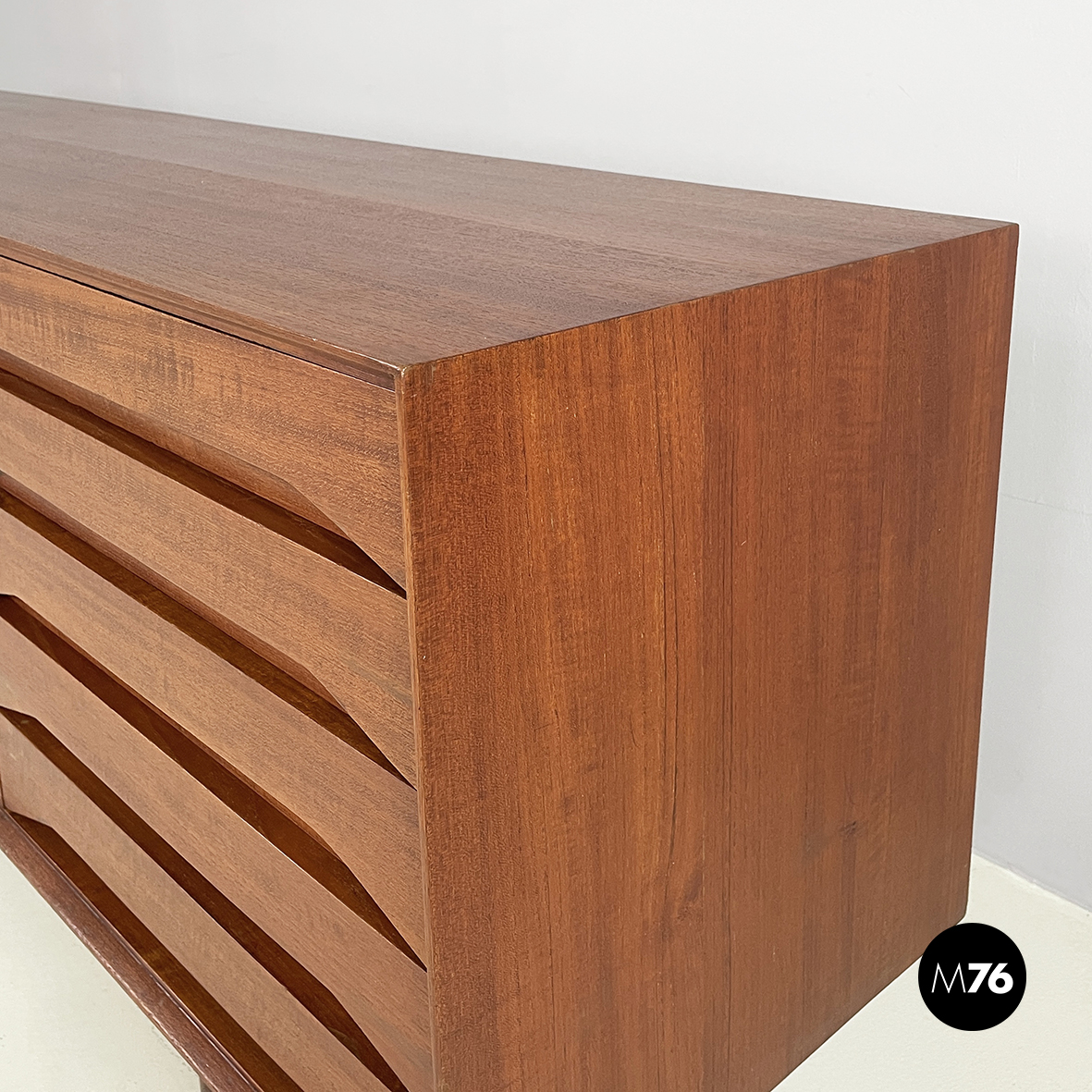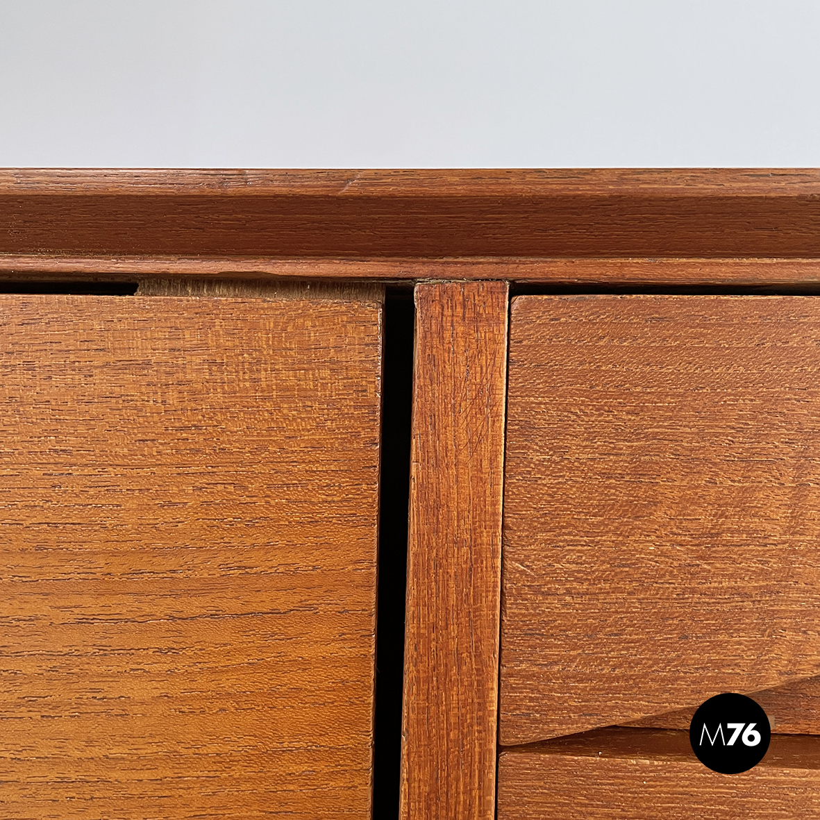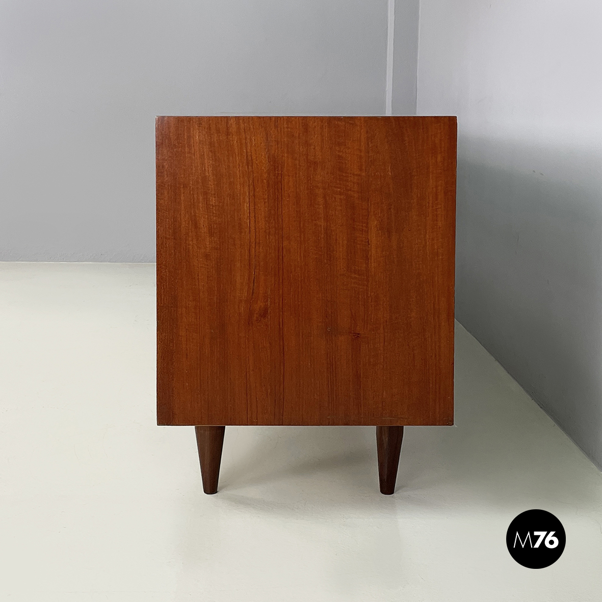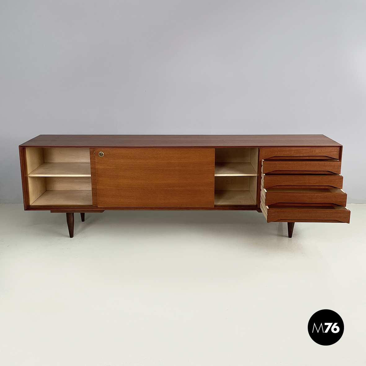 Sideboard a base rettangolare in legno. Su un lato presenta due ante a scorrimento con all’interno una mensola. Maniglie tonda in ottone. Sul lato opposto presenta cinque cassetti rettangolari. Zampe a sezione tonda.