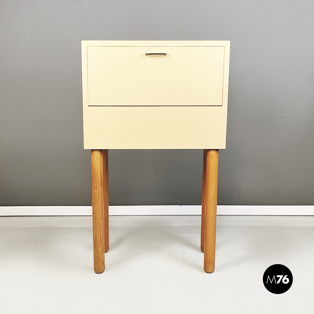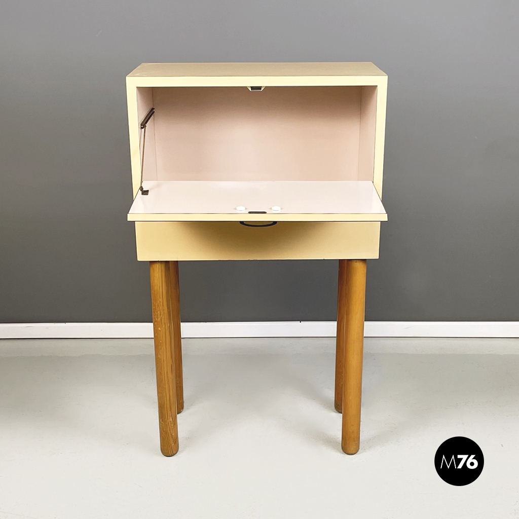 Sideboard o mobile bar a base rettangolare in legno e formica beige. Questo highboard presenta un vano in formica con apertura a ribalta e maniglia in metallo. Le zampe alte sono a sezione tonda in legno.