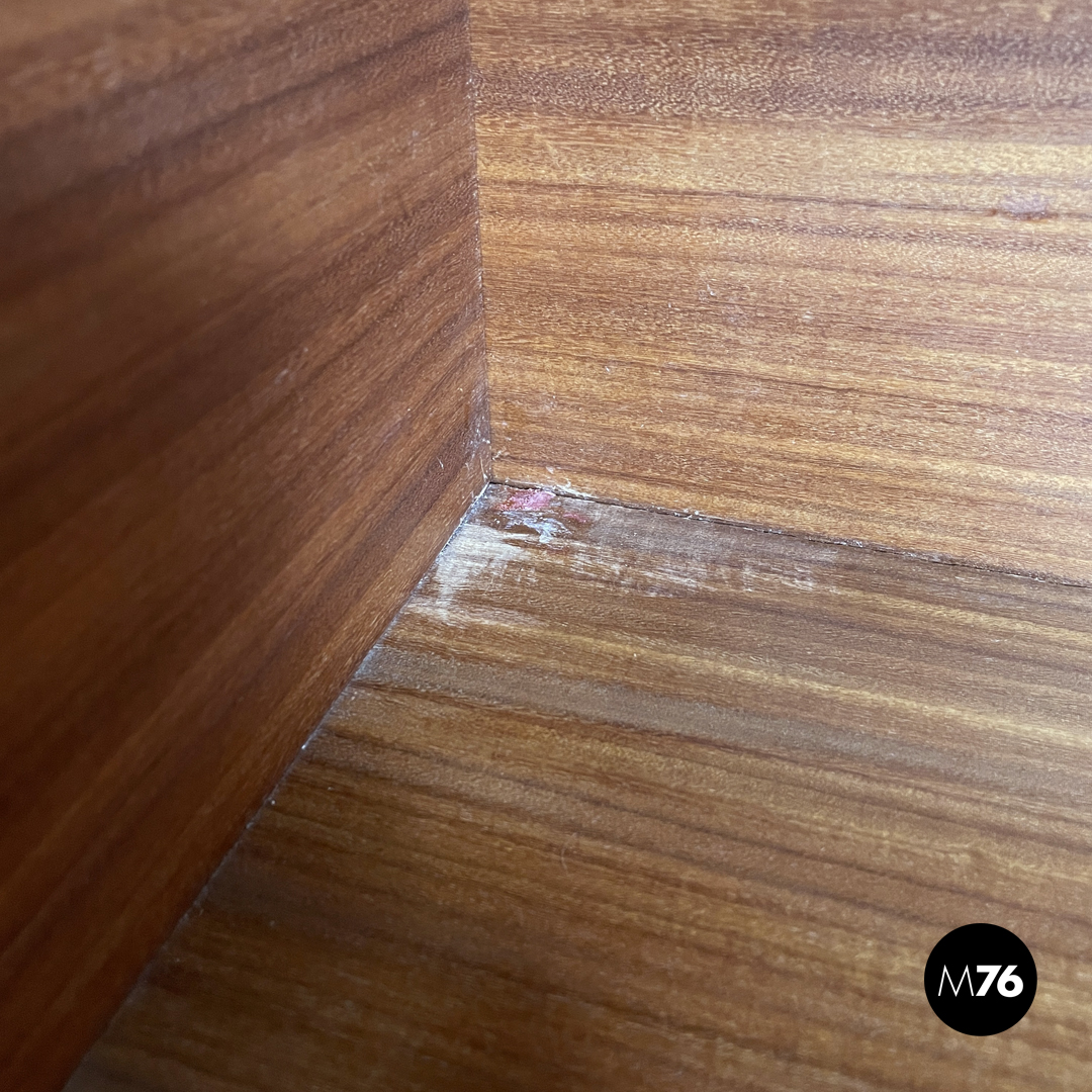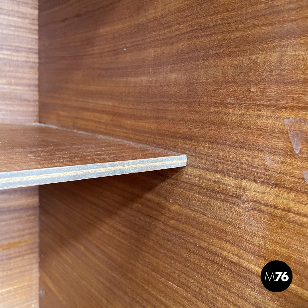 Sideboard a base rettangolare in legno. Presenta due ante a scorrimento con maniglie tonde in ottone, all’interno si trovano quattro vani divisi con una mensola orizzontale e una parete verticale centrale. Con quattro piedini a sezione circolare.
