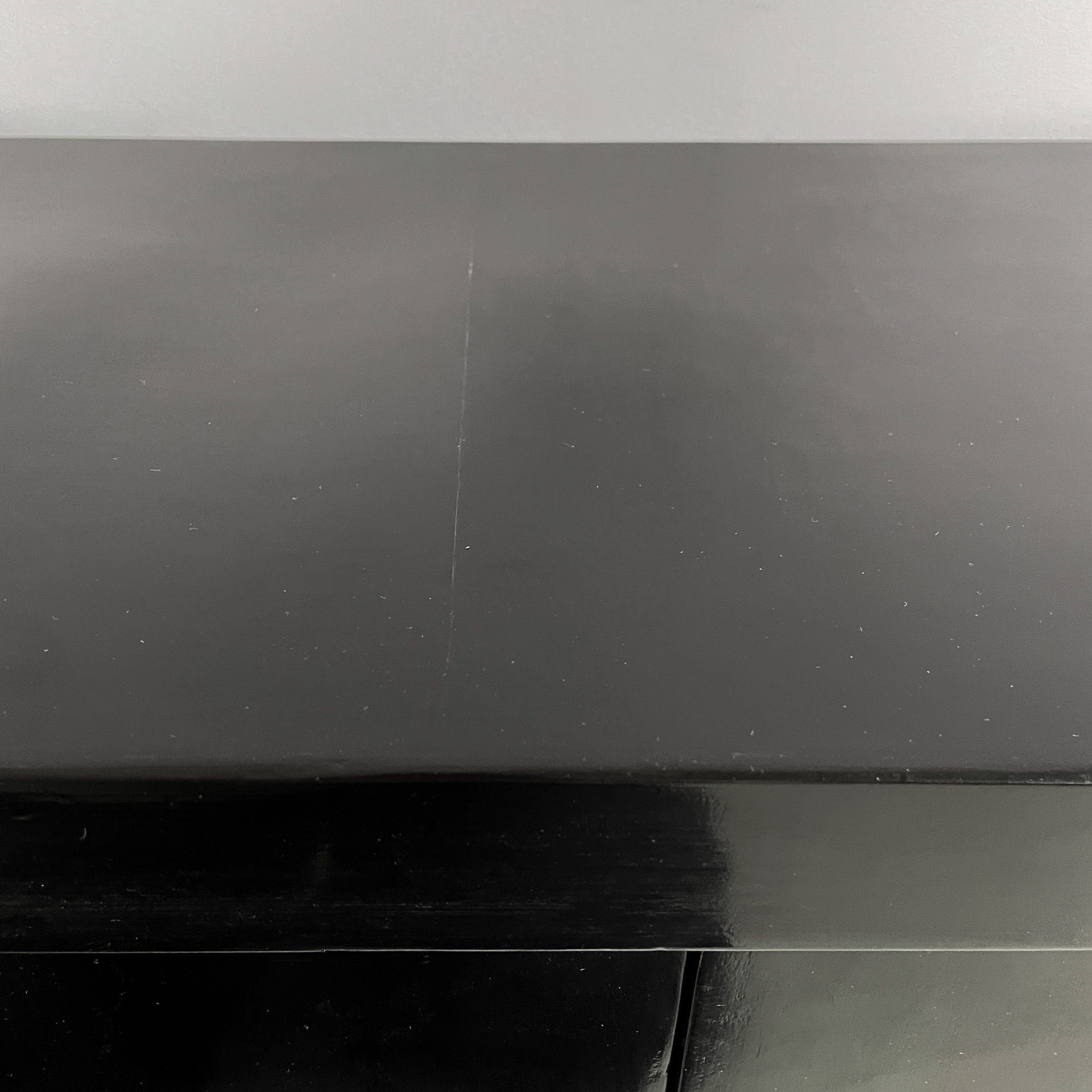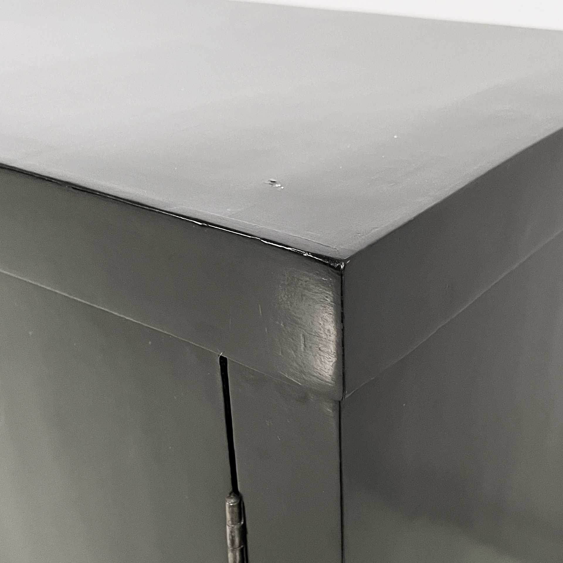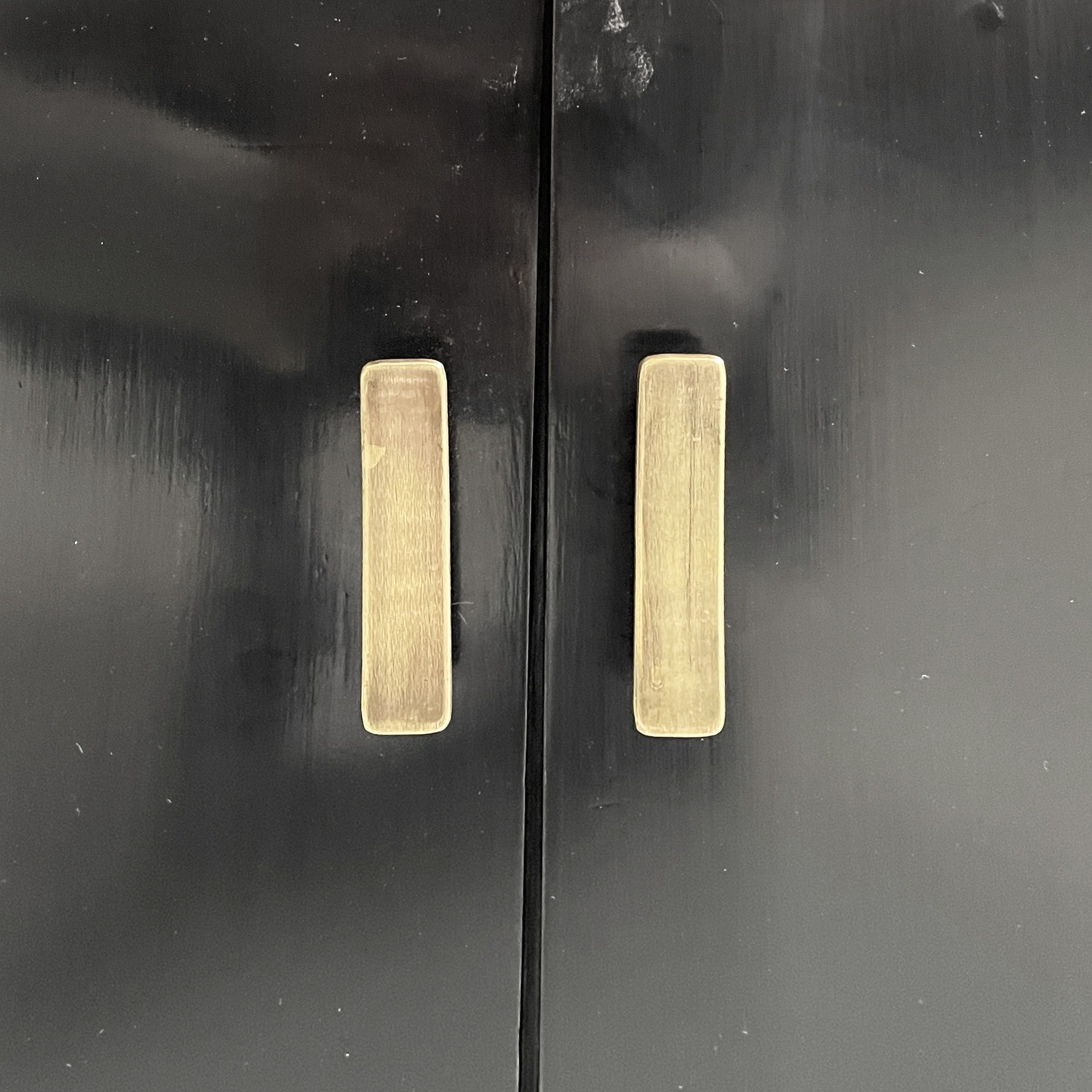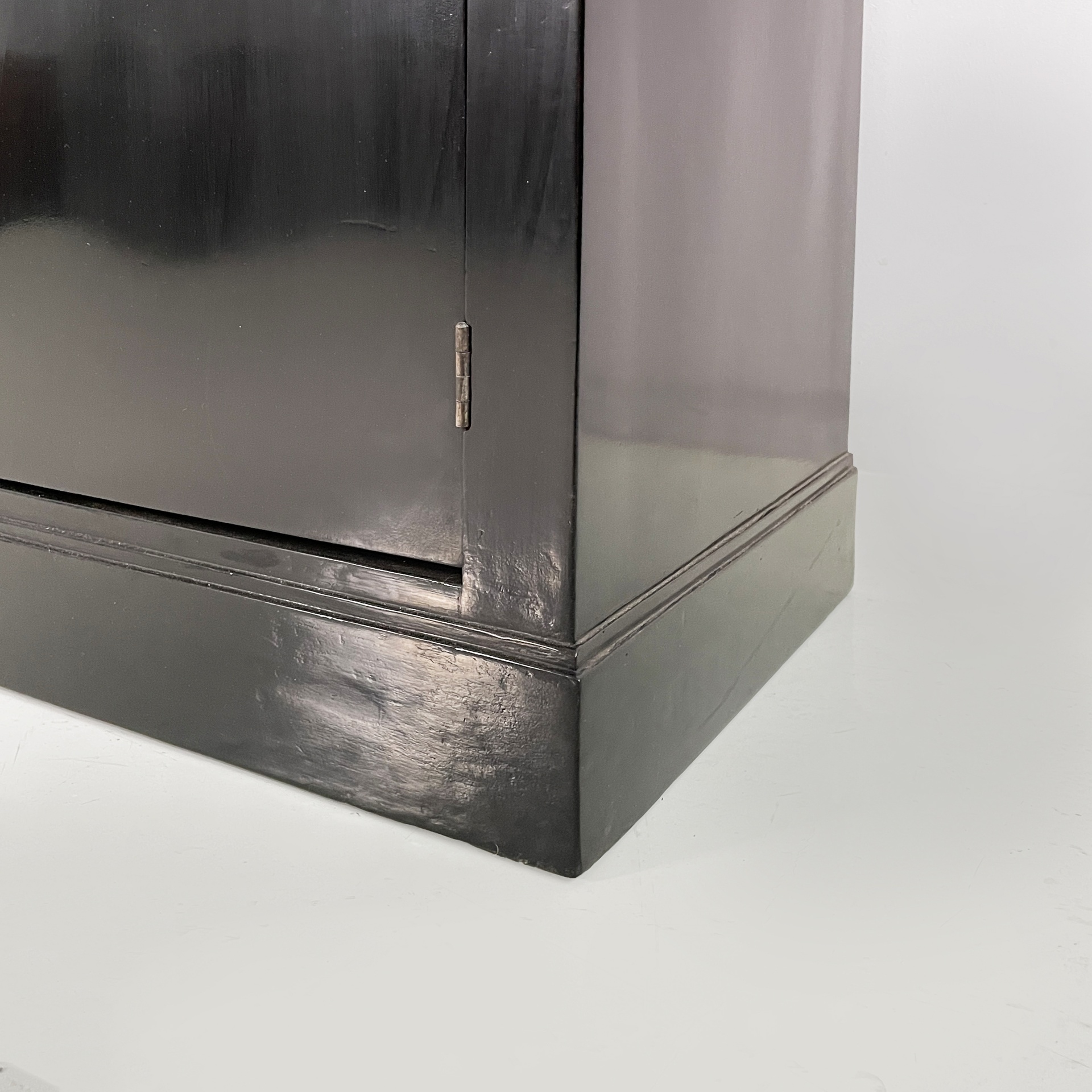 Sideboard a base rettangolare in legno verniciato nero. Sul fronte è presente un vano con quattro ante a battente e maniglie in ottone curvato. Mensola interna in legno nero. Art Deco.