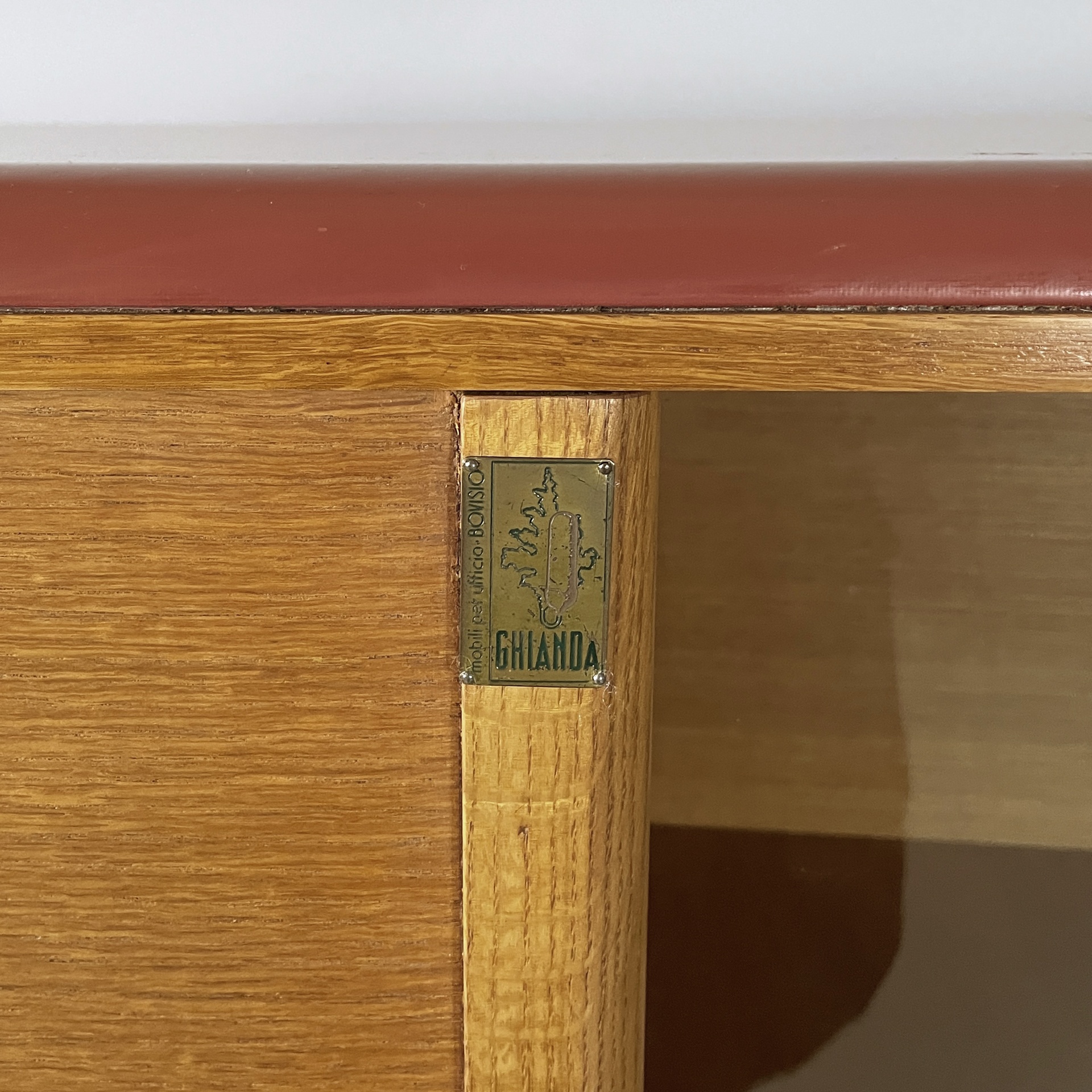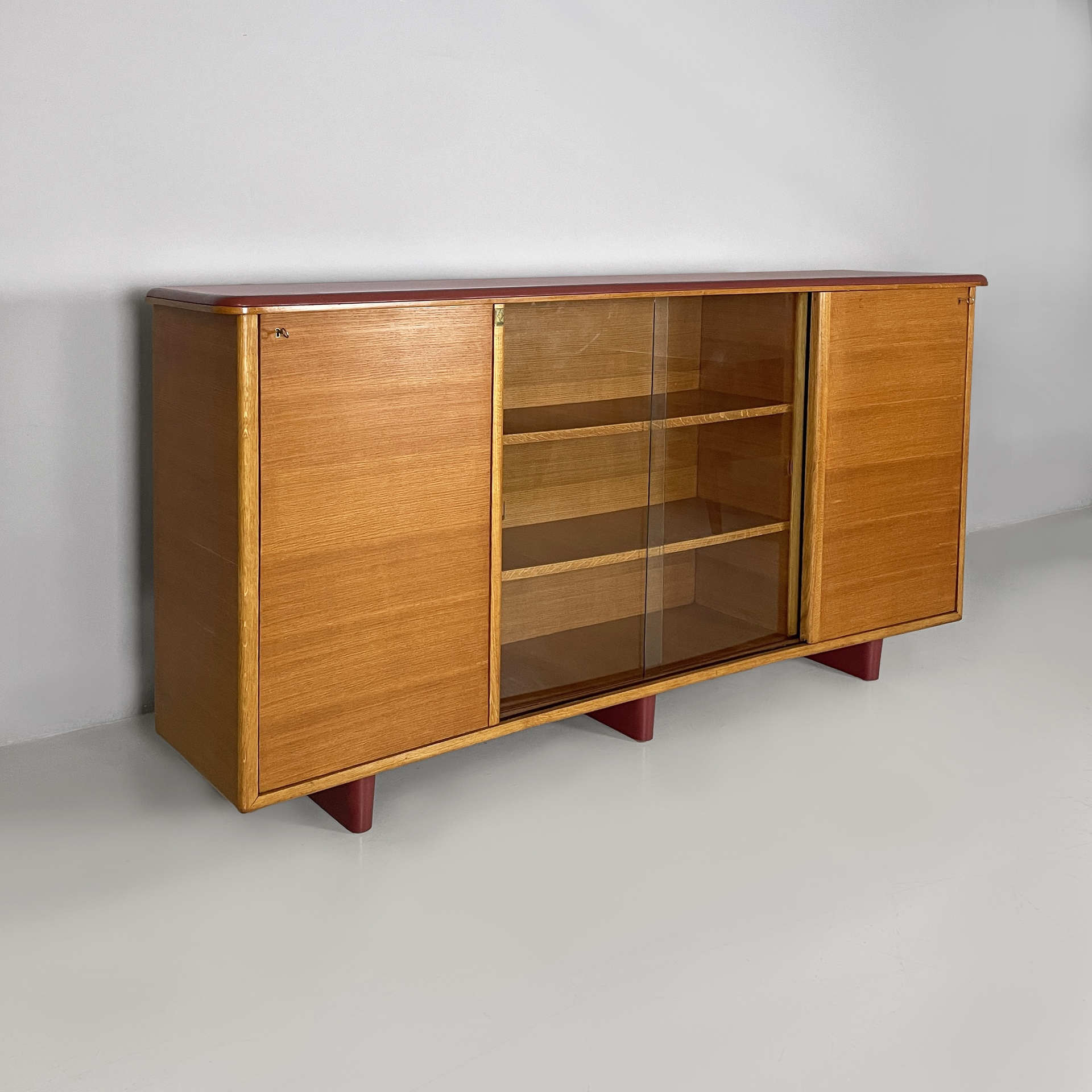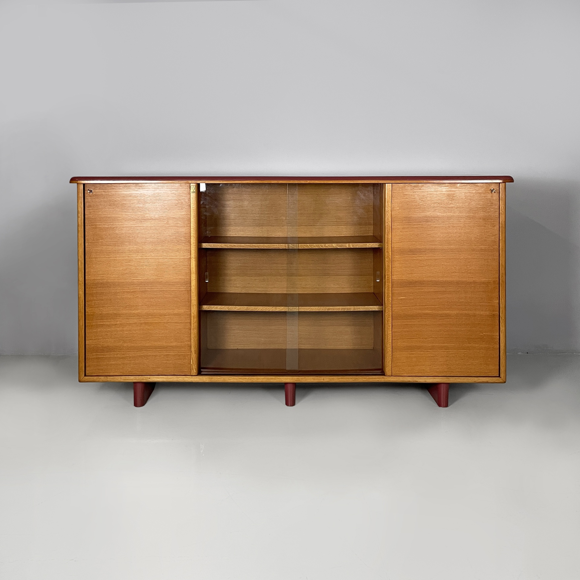 Sideboard o credenza con piano sagomato rivestito in pelle bordeaux. Sul fronte sono presenti un vano centrale con doppia anta a scorrimento in vetro e mensole interne in legno, due vani laterali con anta a scorrimento in legno e mensole interne in legno. I vani laterali hanno le chiavi. Le tre zampe a sezione ovale sono in legno rivestito in pelle bordeaux.