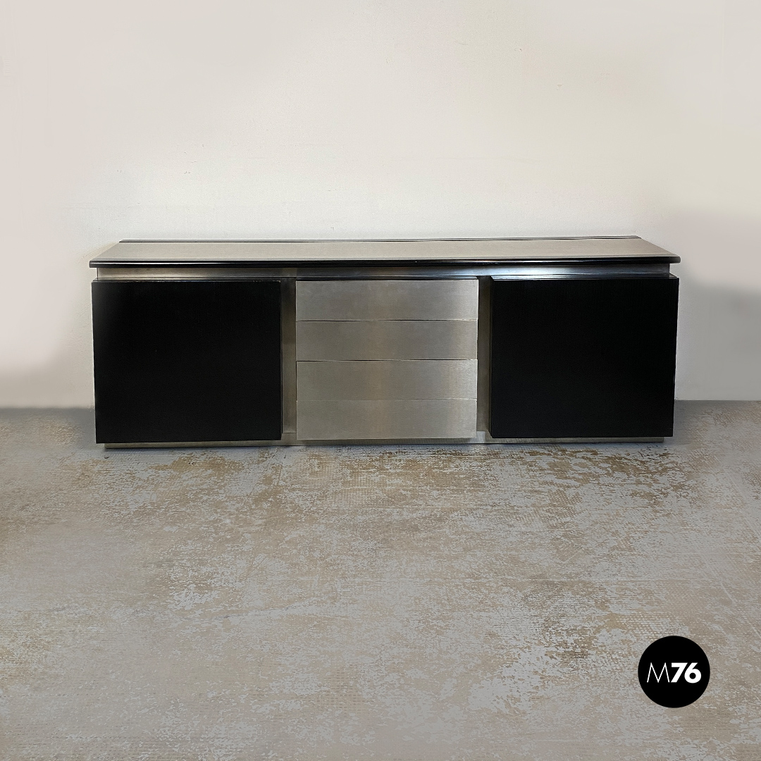 Sideboard modello Parioli con struttura in legno massello con finitura nero opaco e profili in alluminio due ante a battente con mensola in vetro interna e modulo centrale a cassetti.