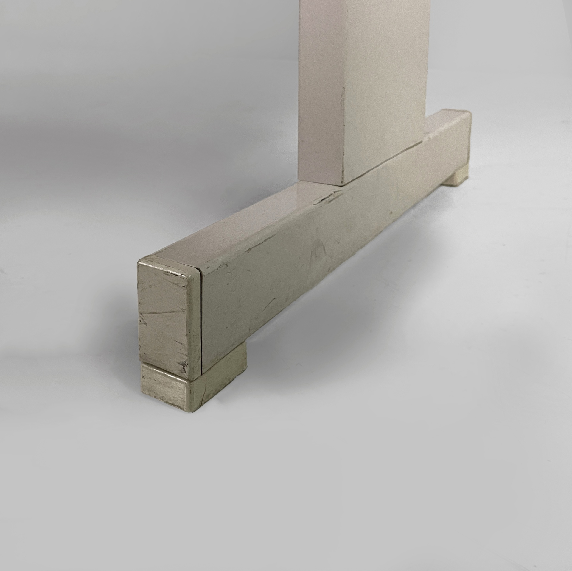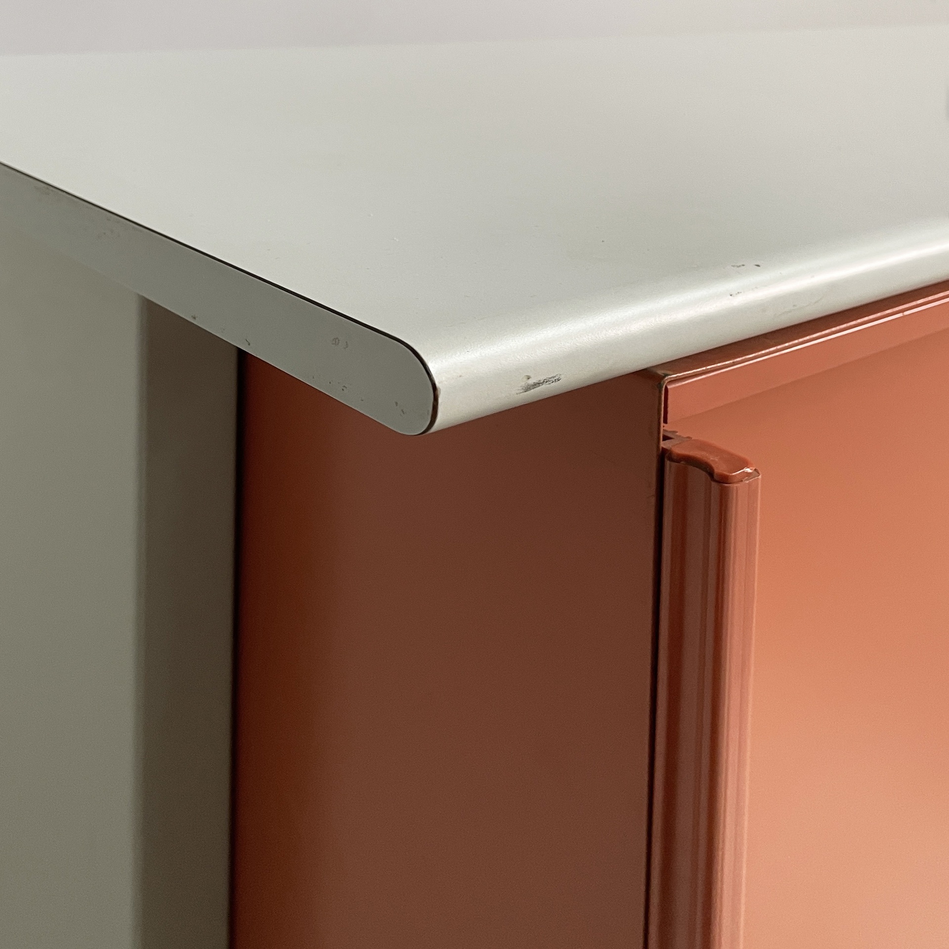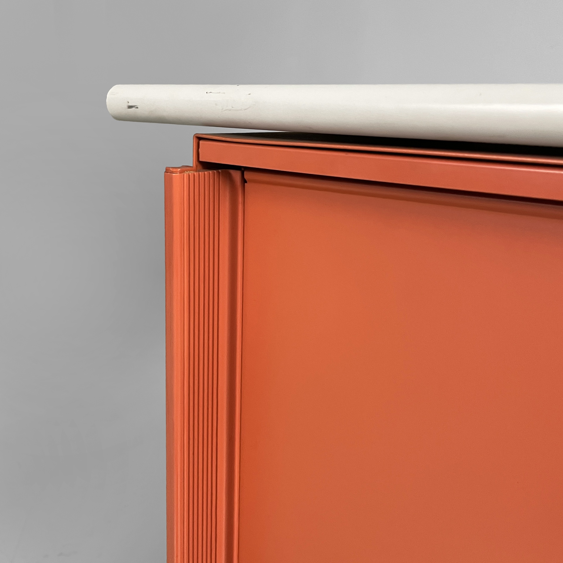 Sideboard appartenete alla serie Synthesis 45 in laminato e metallo. Il piano rettangolare in laminato bianco presenta il bordo arrotondato. Sotto è presente un vano rettangolare in metallo arancione con doppia anta a scorrimento. Le due zampe a sezione squadrata in metallo grigio chiaro hanno i piedini in plastica grigio-bianca.