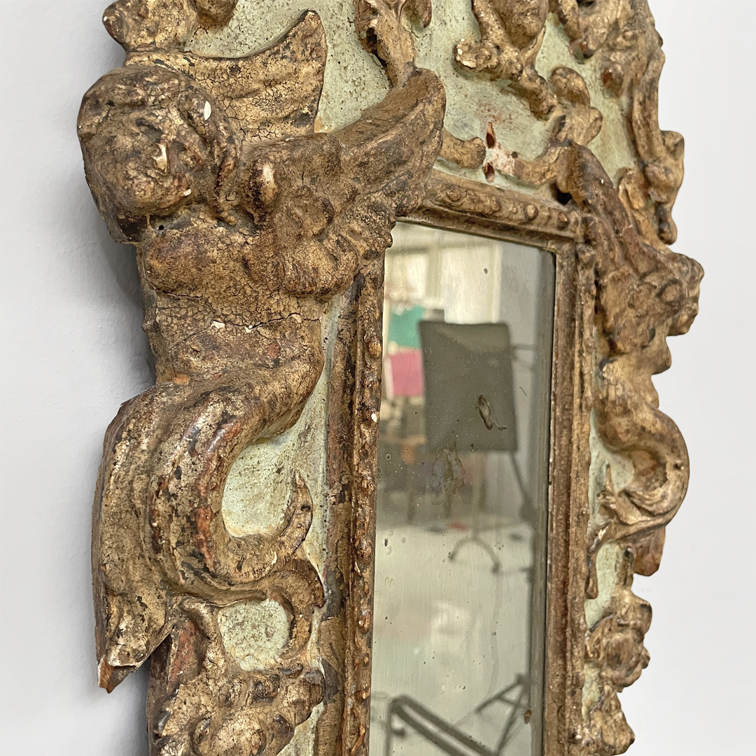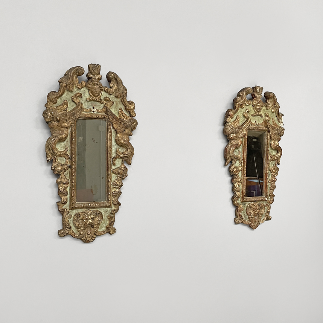 Specchiere da parete di forma rettangolare in legno. La cornice è in legno finemente lavorato, di colore oro e laccato verde chiaro. Presenta delle decorazioni a forma di riccioli e volute, putti alati sui lati, al centro un viso femminile e un viso animale nella parte inferiore. In stile 1700.