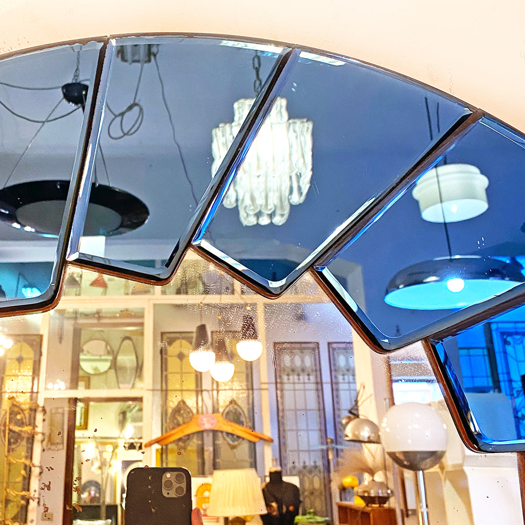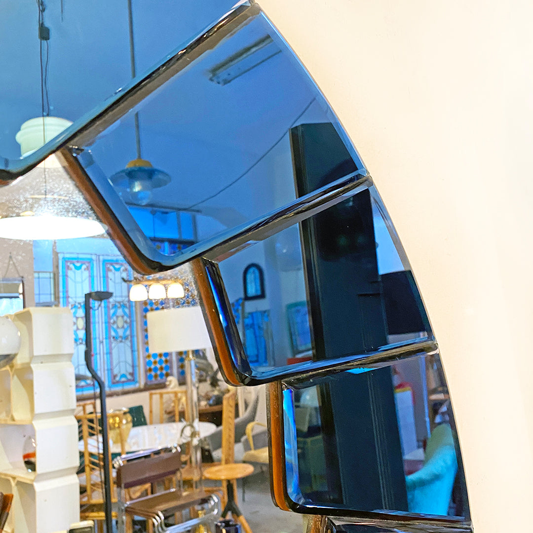 Specchio di forma tonda di media dimensione, con vetro normale nella parte centrale e cornice a spicchi concentrici in vetro blu specchiato.