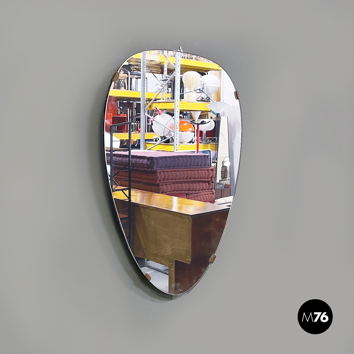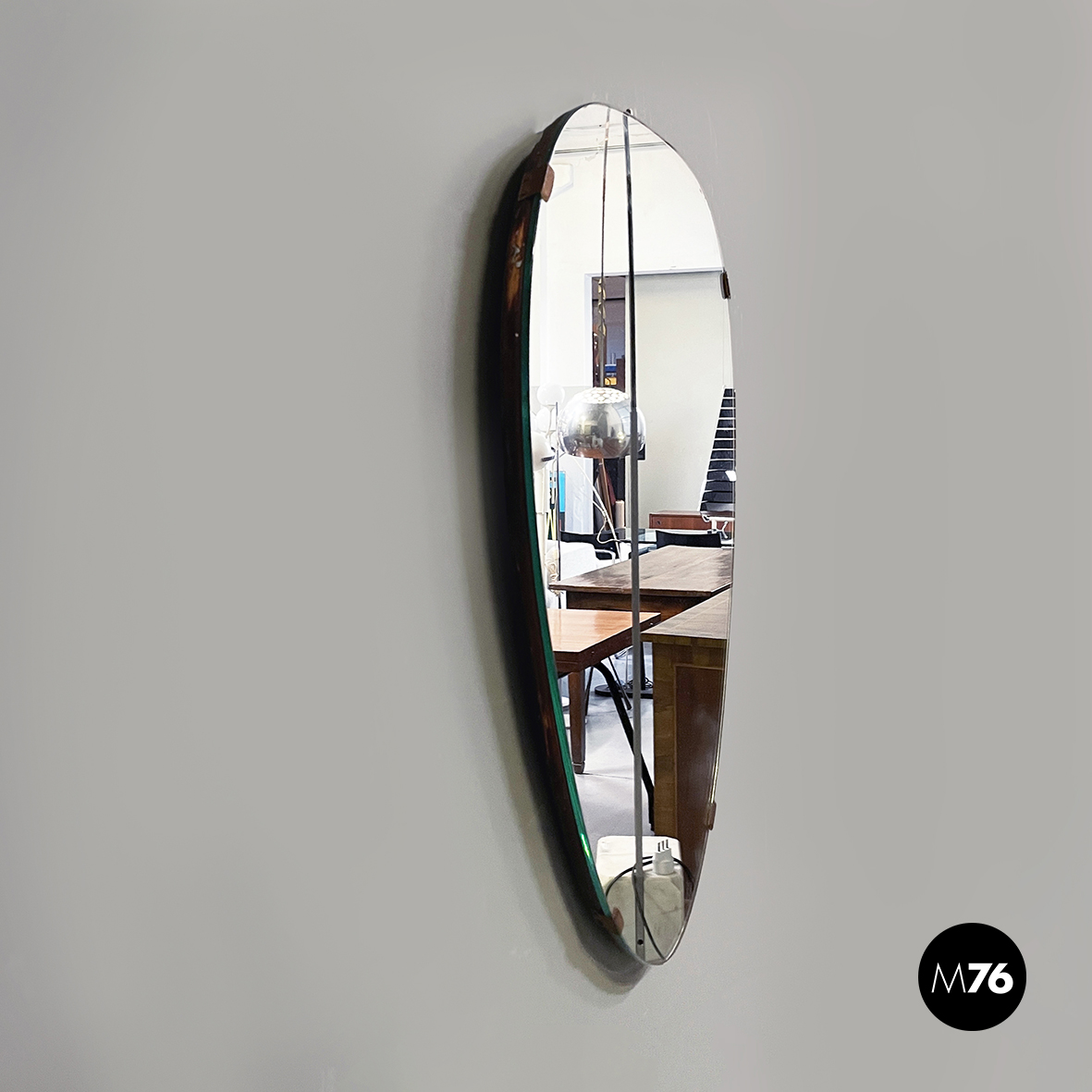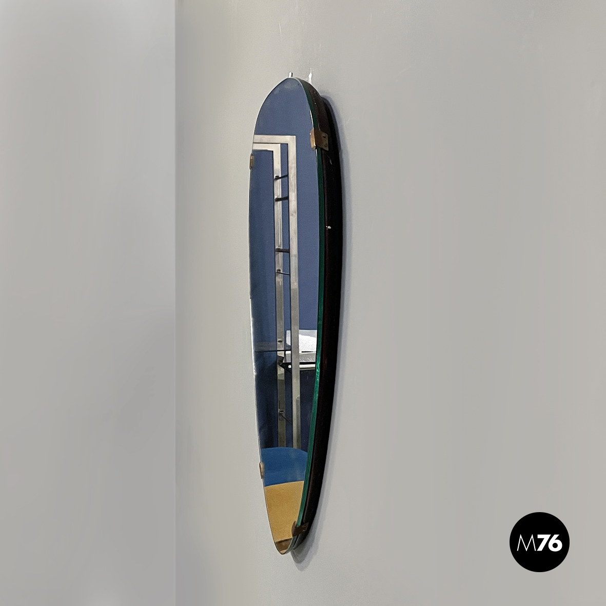 Specchio da parete a forma di scudo. La struttura dello lo specchio è in legno con quattro ganci in ottone brunito, i quali permettono allo specchio di rimanere fissato alla struttura.
