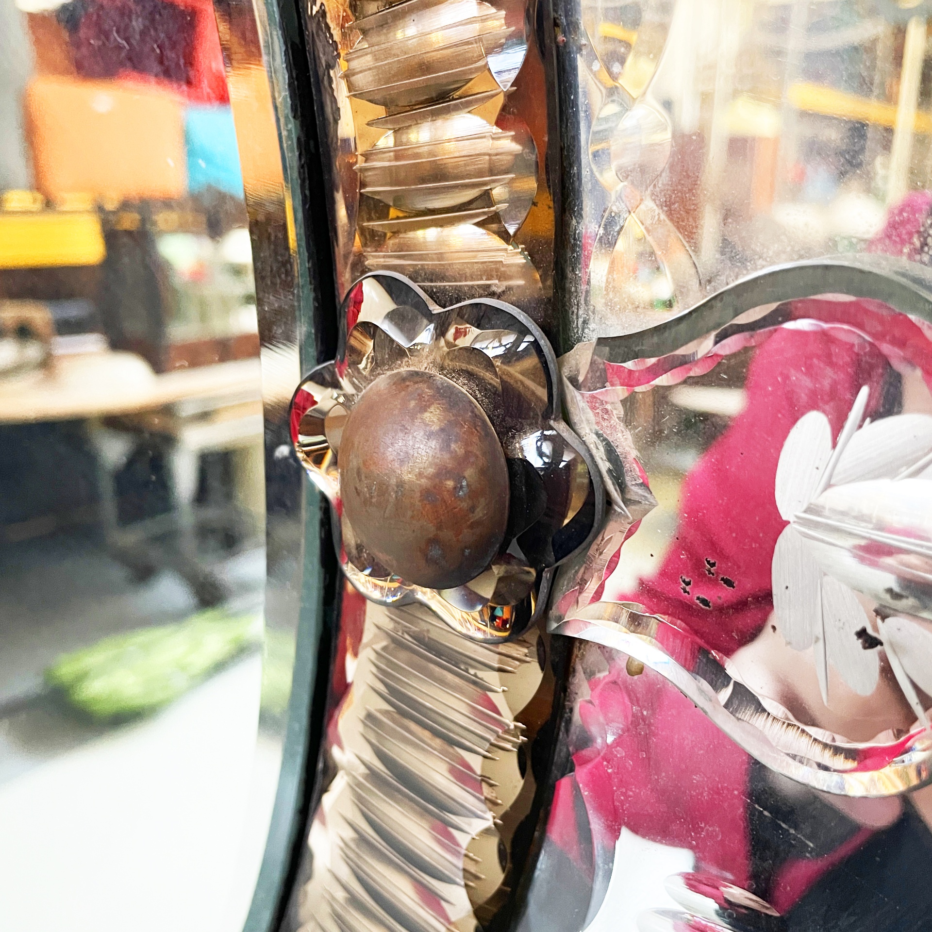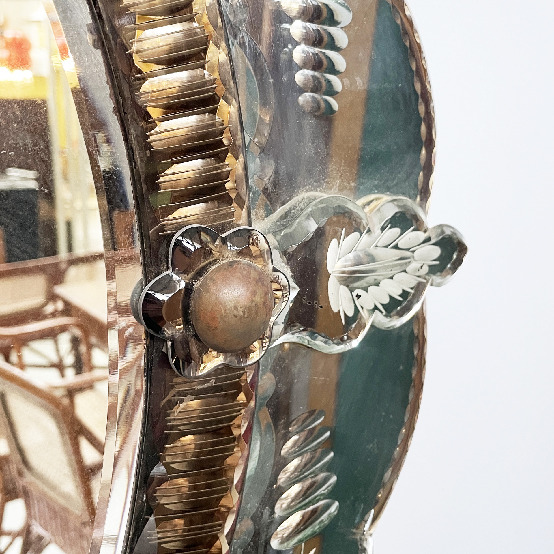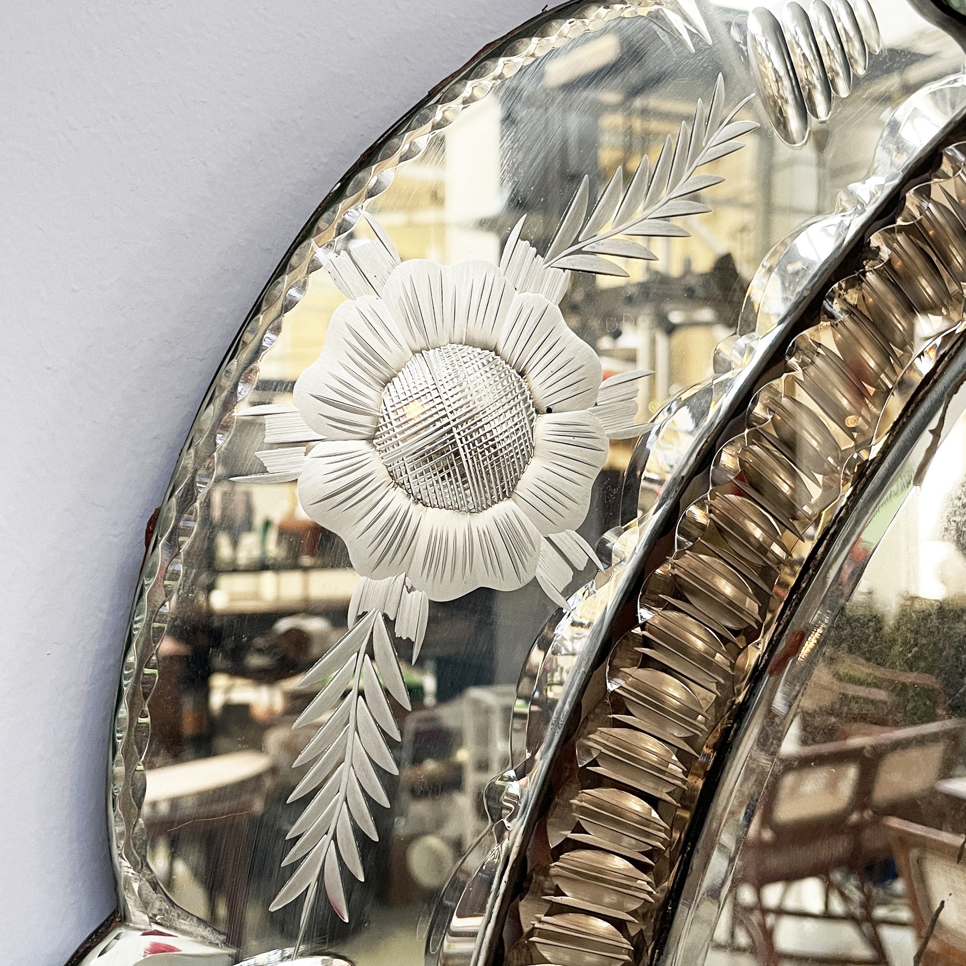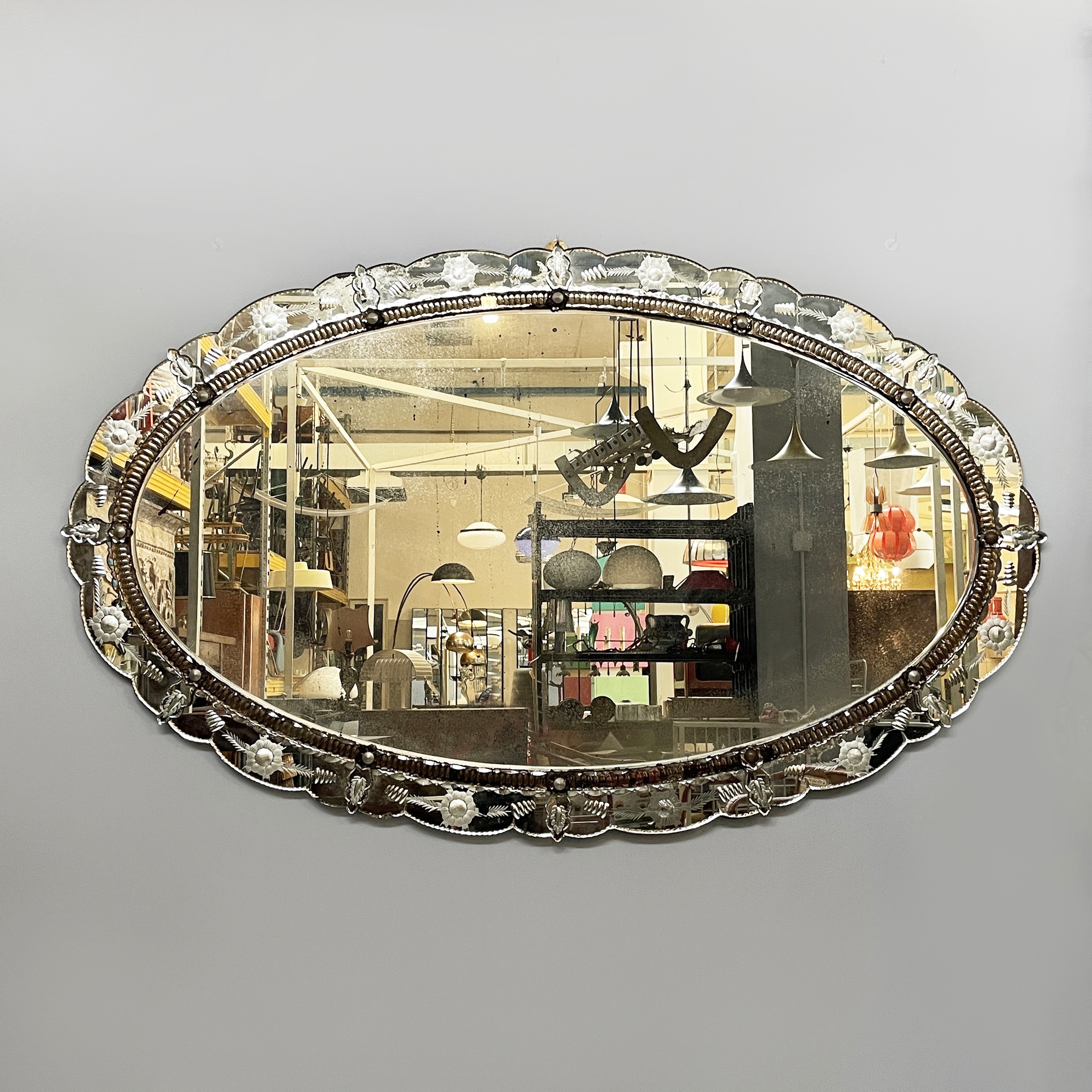 Specchio da parete ovale con acidature a forma di fiori e foglie. Sul profilo ondulato ci sono decori a forma di foglia in specchio e fiori in vetro rosa con interno tondo in metallo. All’interno della specchiera è presente una decorazione in vetro rosato. Nella parte superiore è presente un gancio in ottone. Appartenente al periodo Art Nouveau.