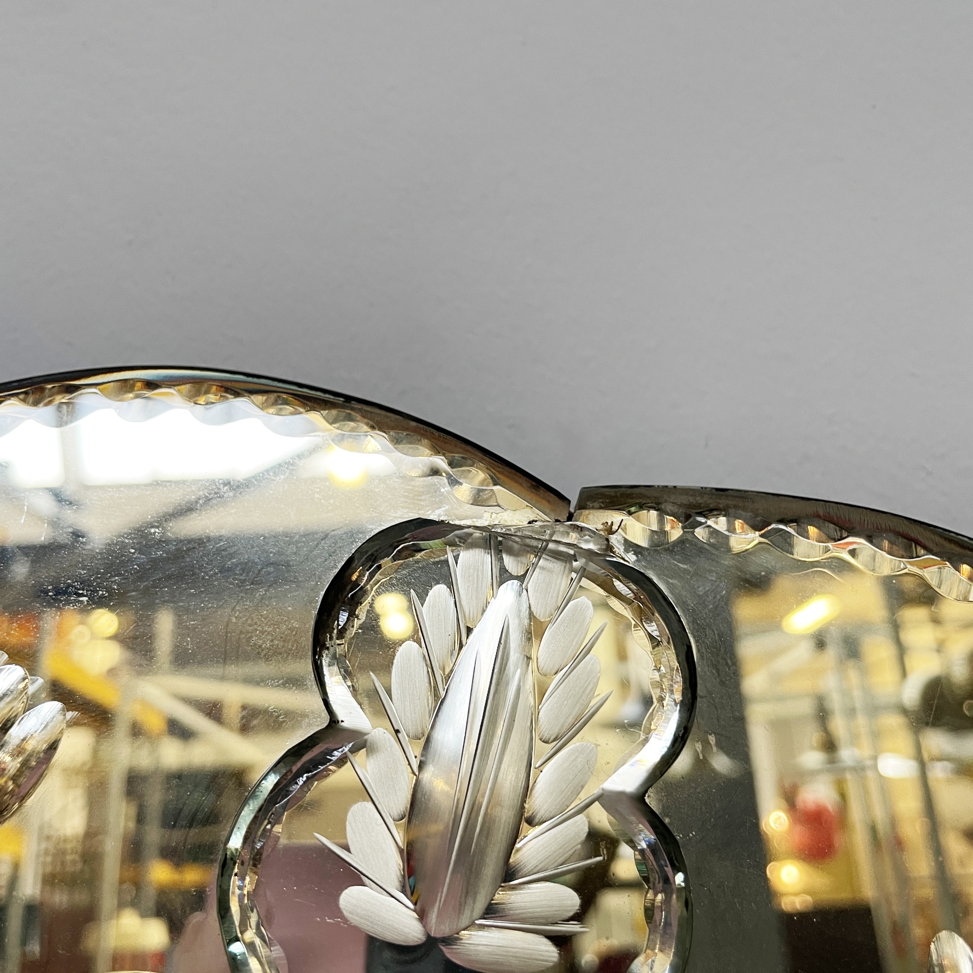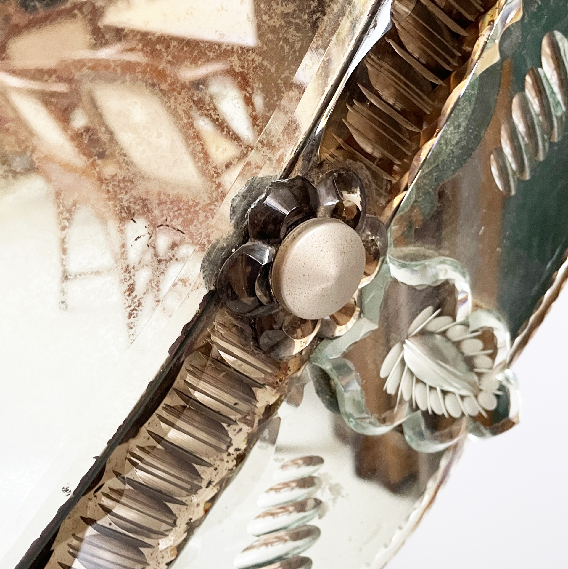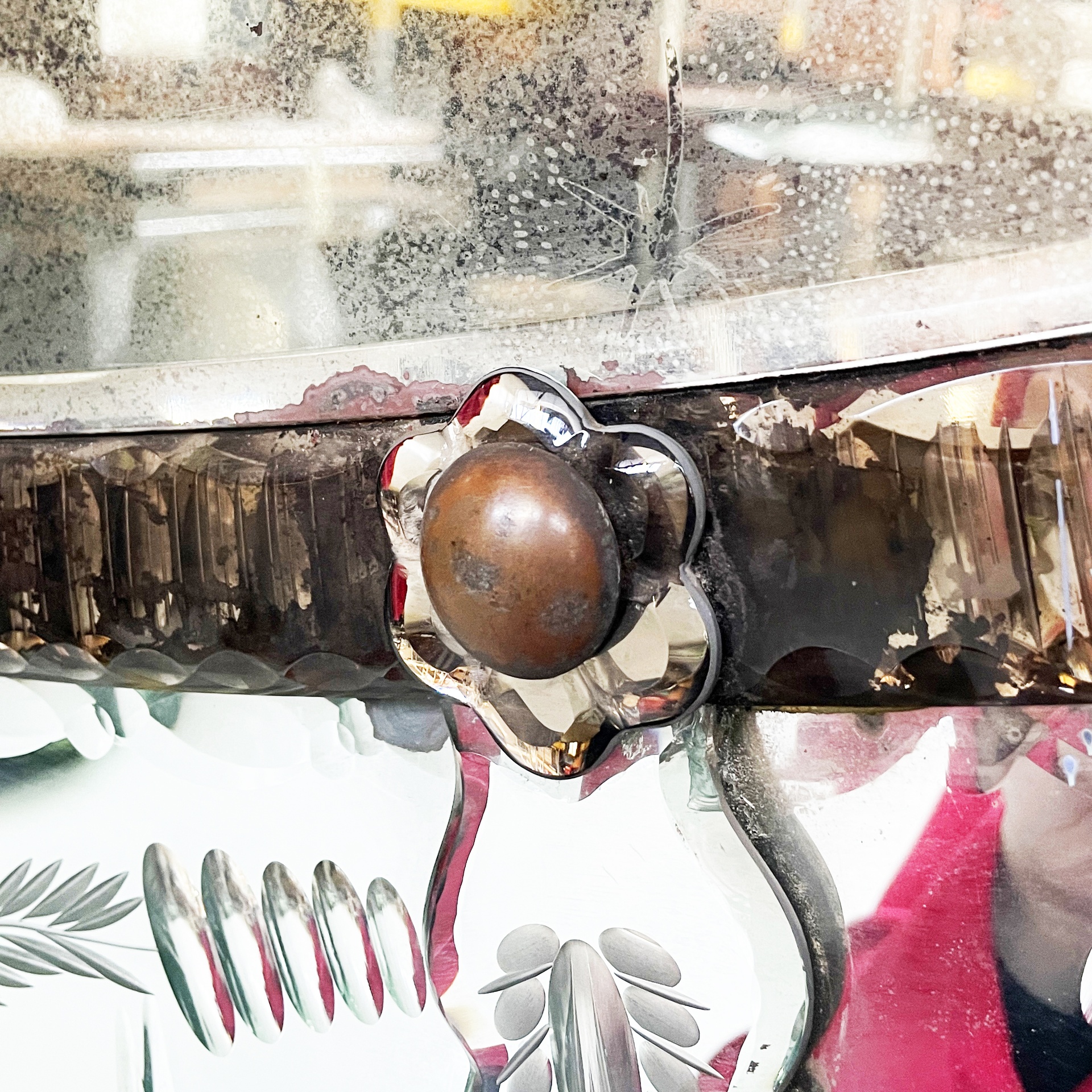 Specchio da parete ovale con acidature a forma di fiori e foglie. Sul profilo ondulato ci sono decori a forma di foglia in specchio e fiori in vetro rosa con interno tondo in metallo. All’interno della specchiera è presente una decorazione in vetro rosato. Nella parte superiore è presente un gancio in ottone. Appartenente al periodo Art Nouveau.