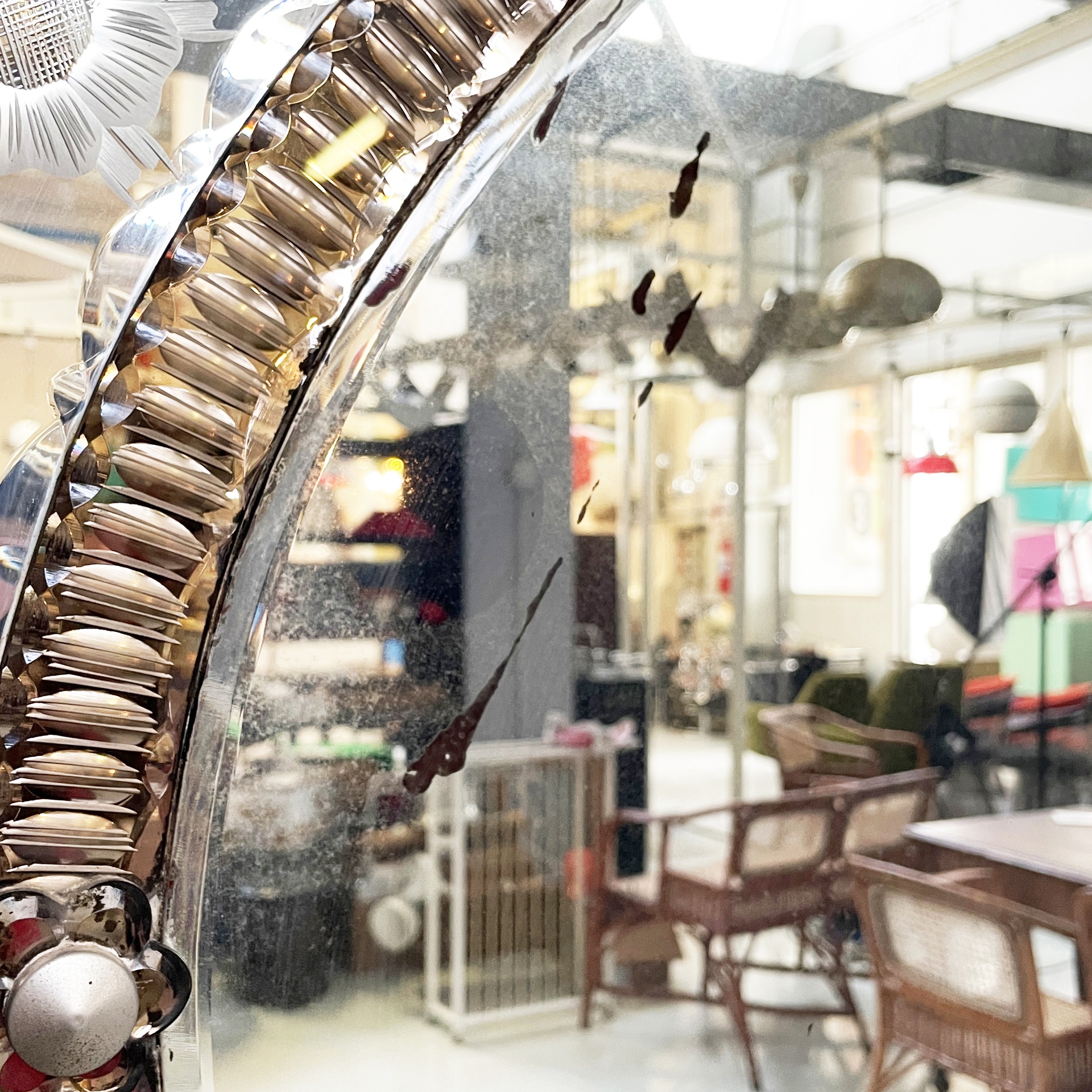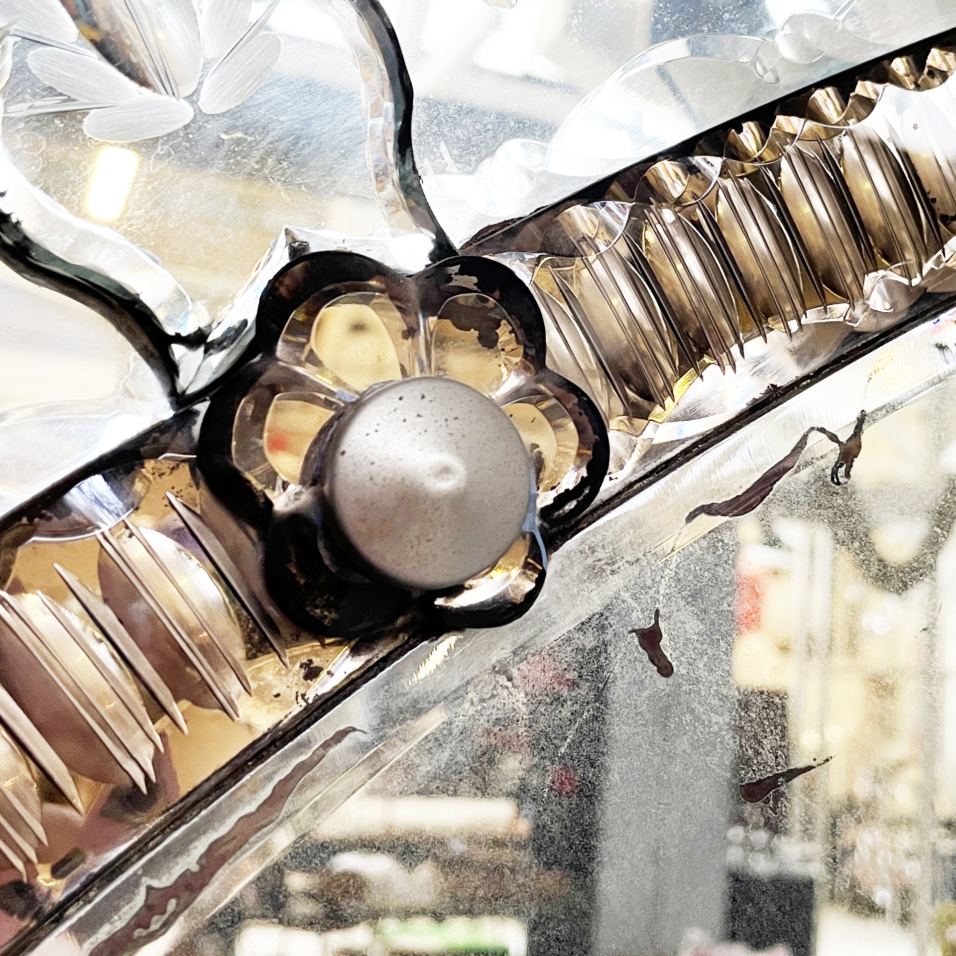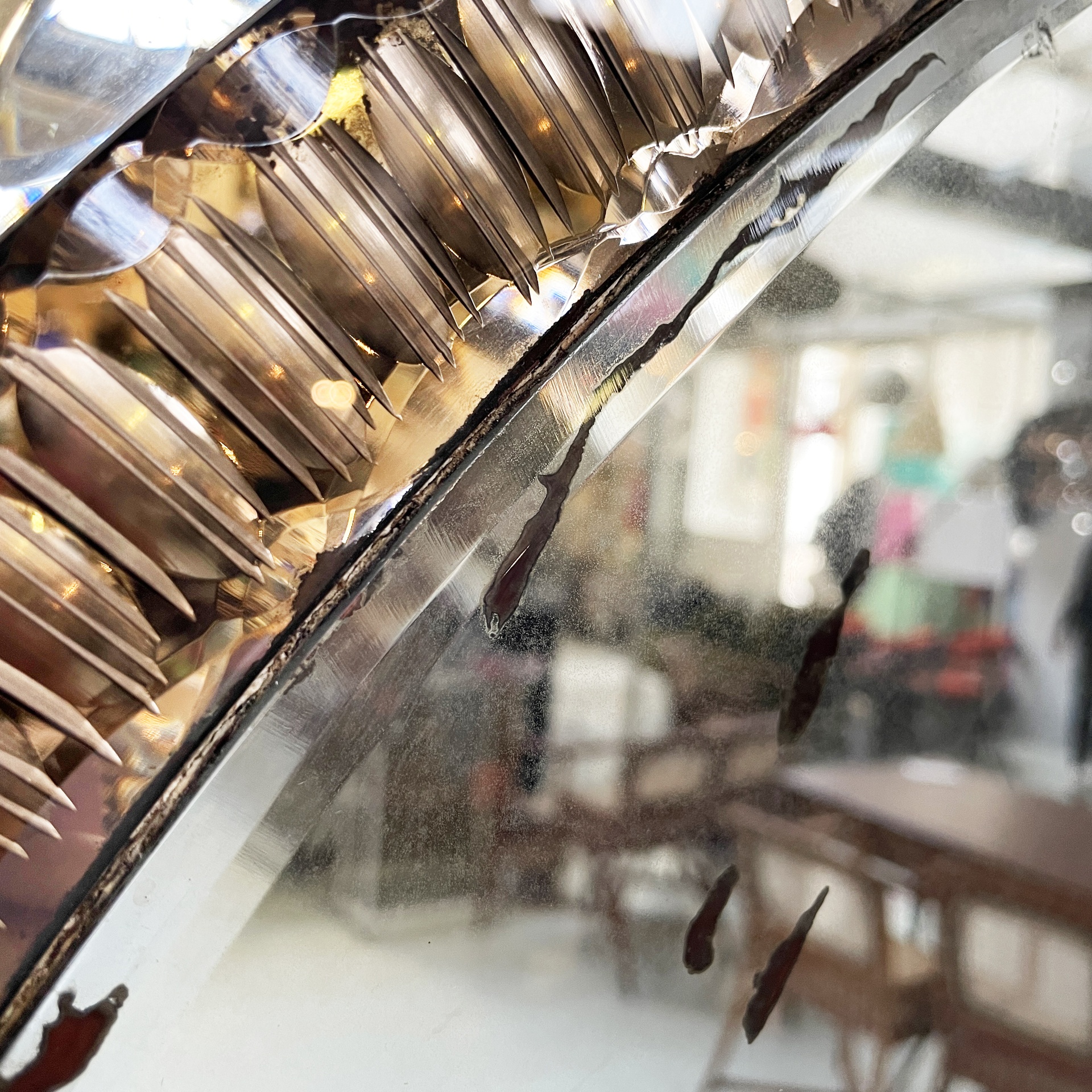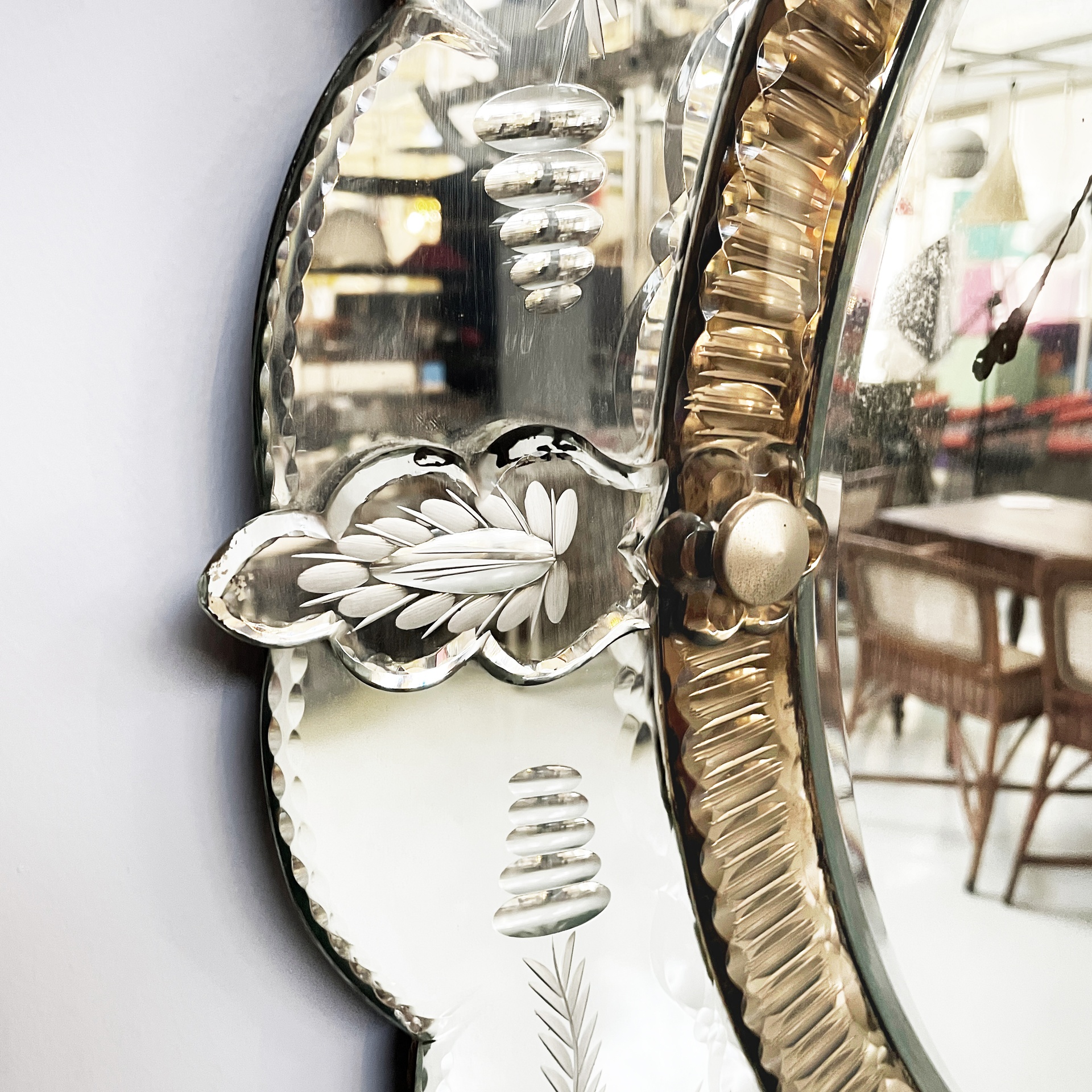Specchio da parete ovale con acidature a forma di fiori e foglie. Sul profilo ondulato ci sono decori a forma di foglia in specchio e fiori in vetro rosa con interno tondo in metallo. All’interno della specchiera è presente una decorazione in vetro rosato. Nella parte superiore è presente un gancio in ottone. Appartenente al periodo Art Nouveau.