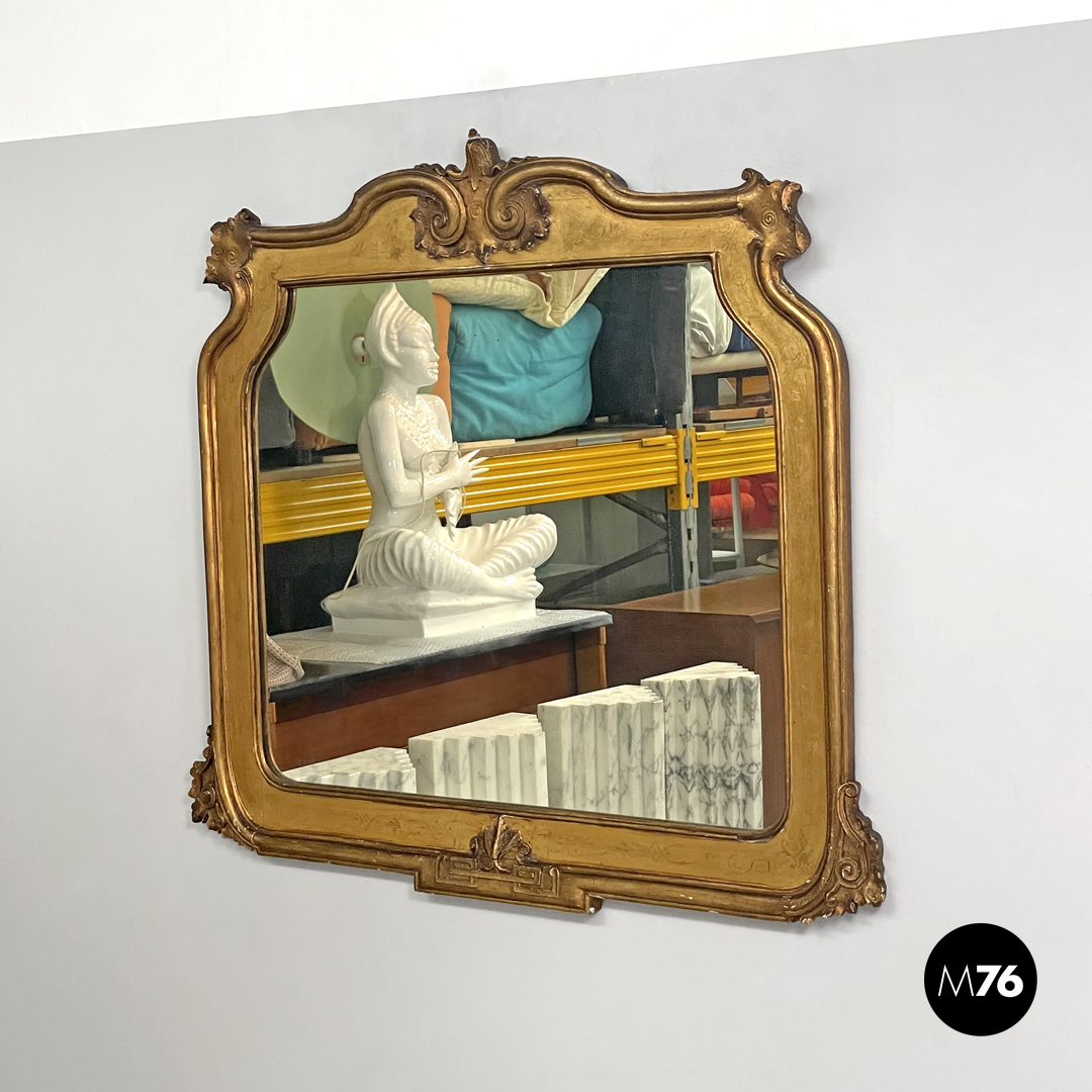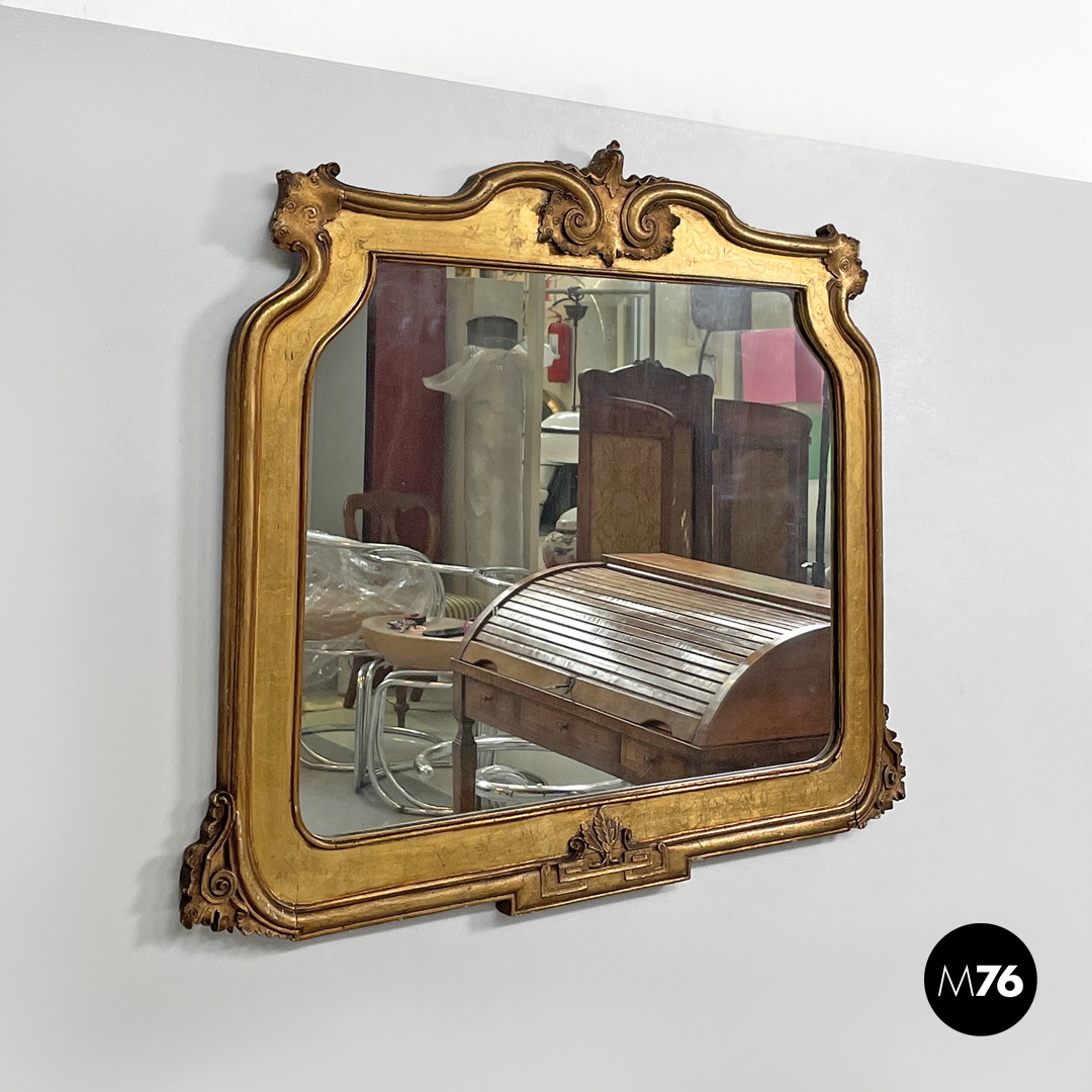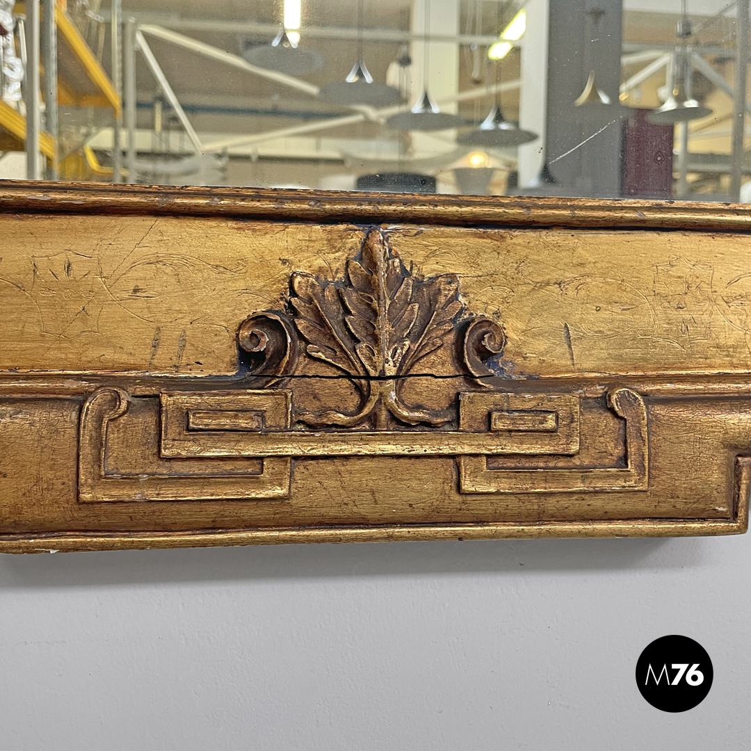 Specchio da parete rettangolare con cornice in legno decorata e dorata con foglia oro. Gli angoli della cornice, la parte centrale superiore e quella inferiore presentano decorazioni intricate, su tutti gli elementi decorativi si ripete in varie forme un motivo a spirale. Sulla parte piatta della cornice si trovano delle incisioni che richiamano forme floreali.