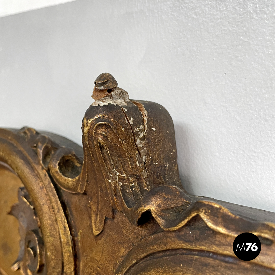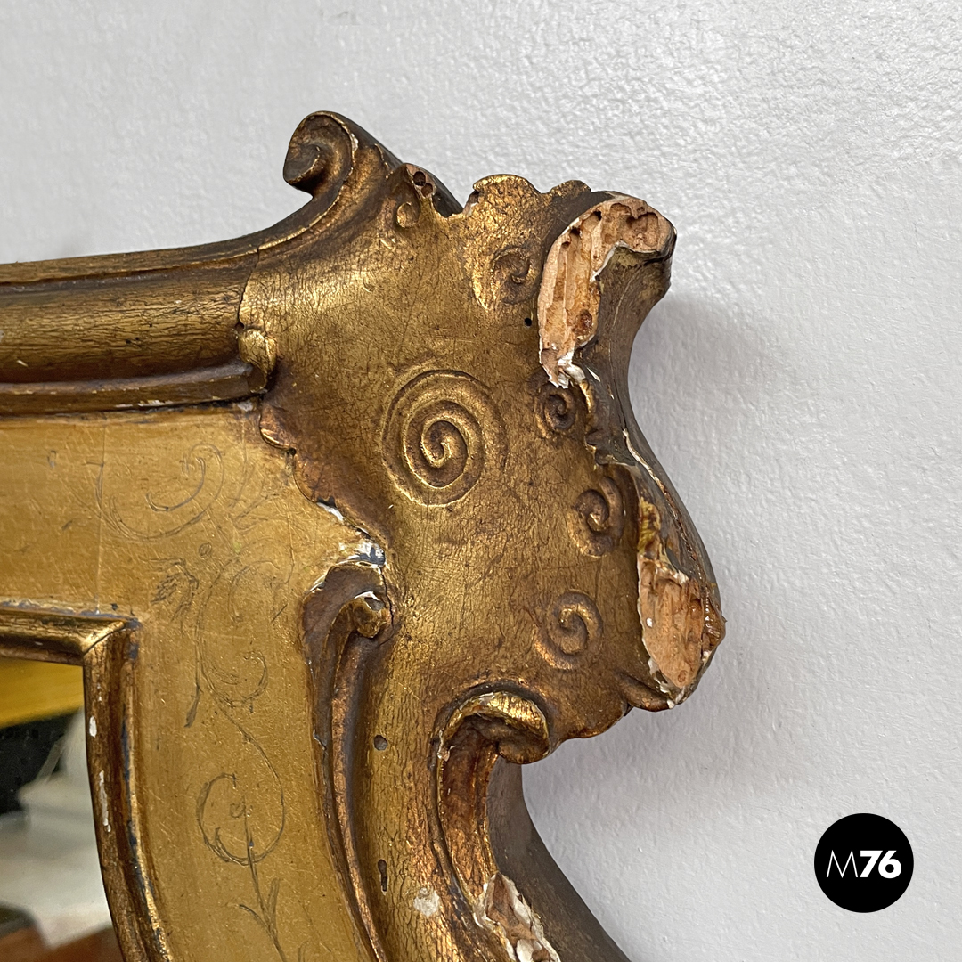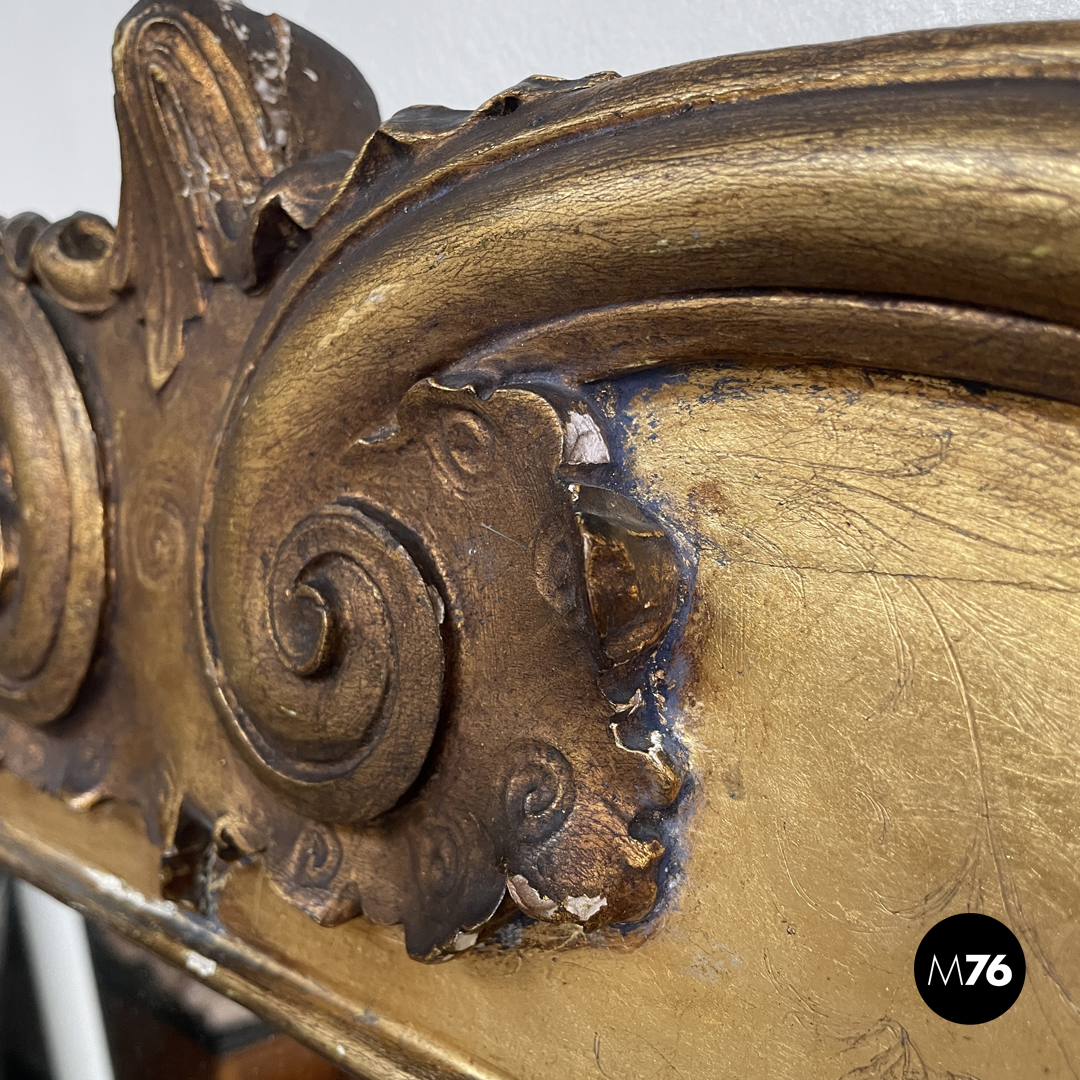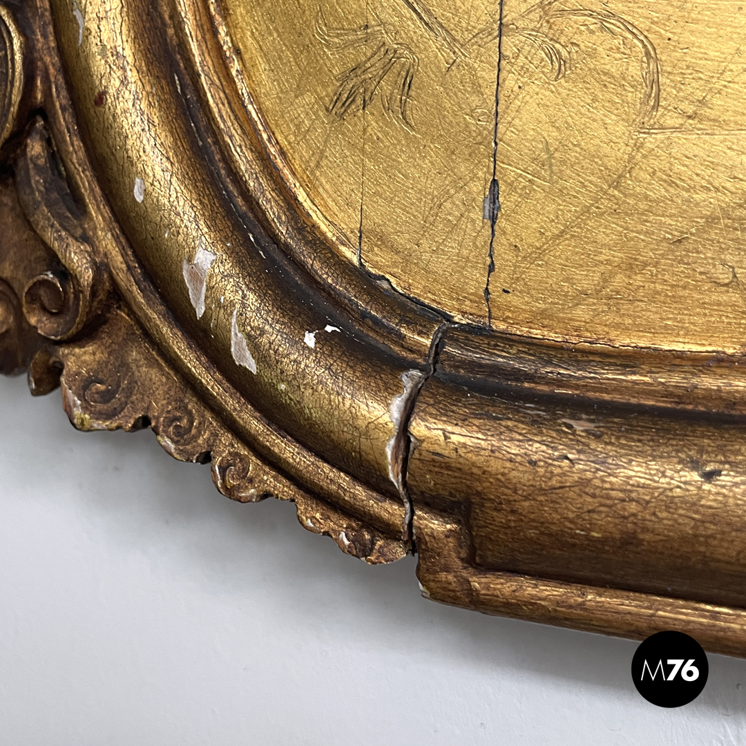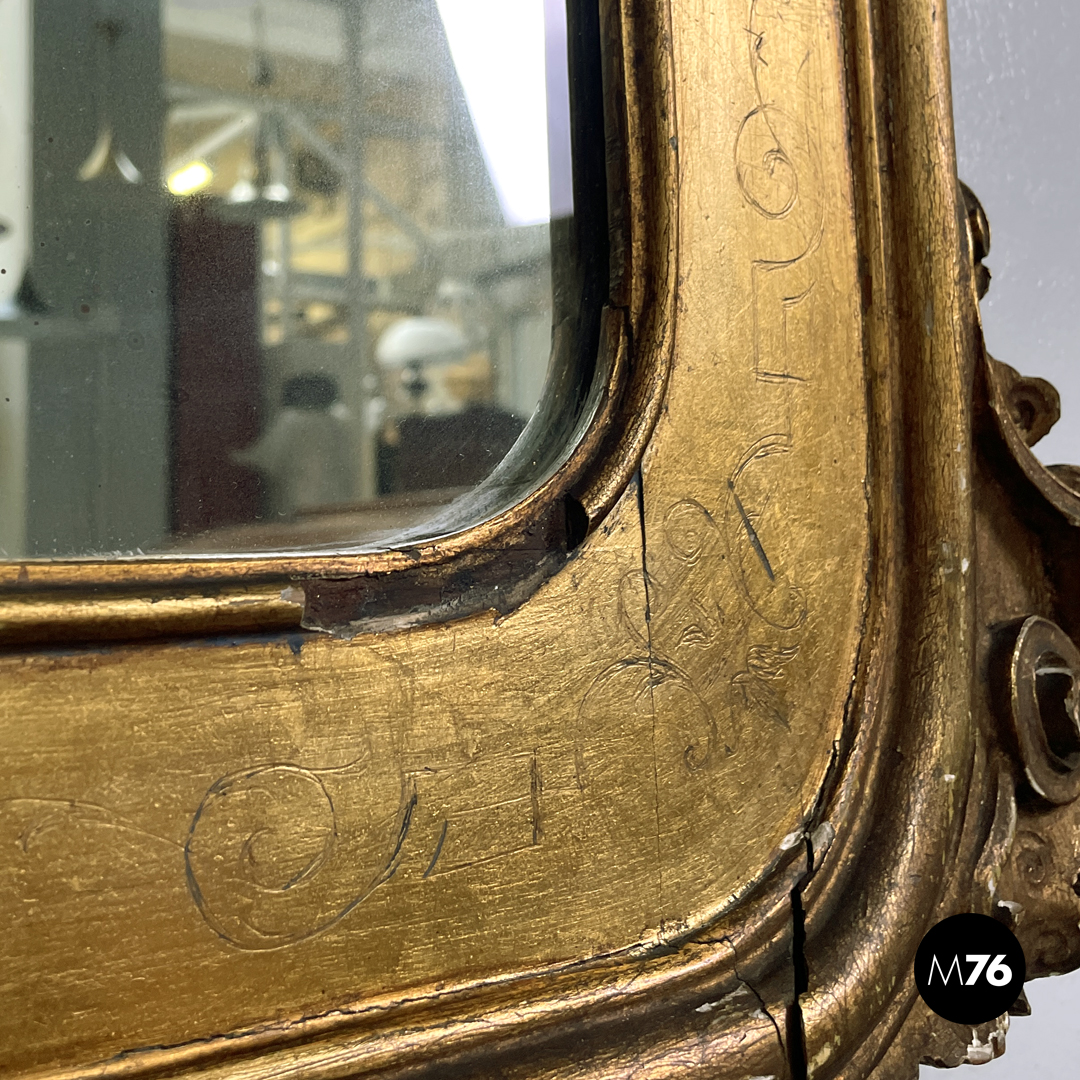 Condizioni discrete, con segni del tempo, mancanze di materiale, crepe e mancanza di finitura dorata. La parte di specchio presenta leggere opacizzazioni.