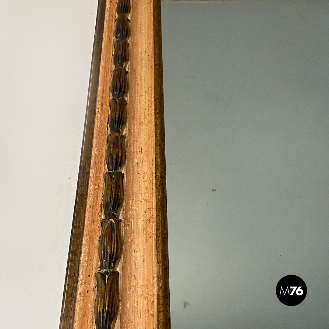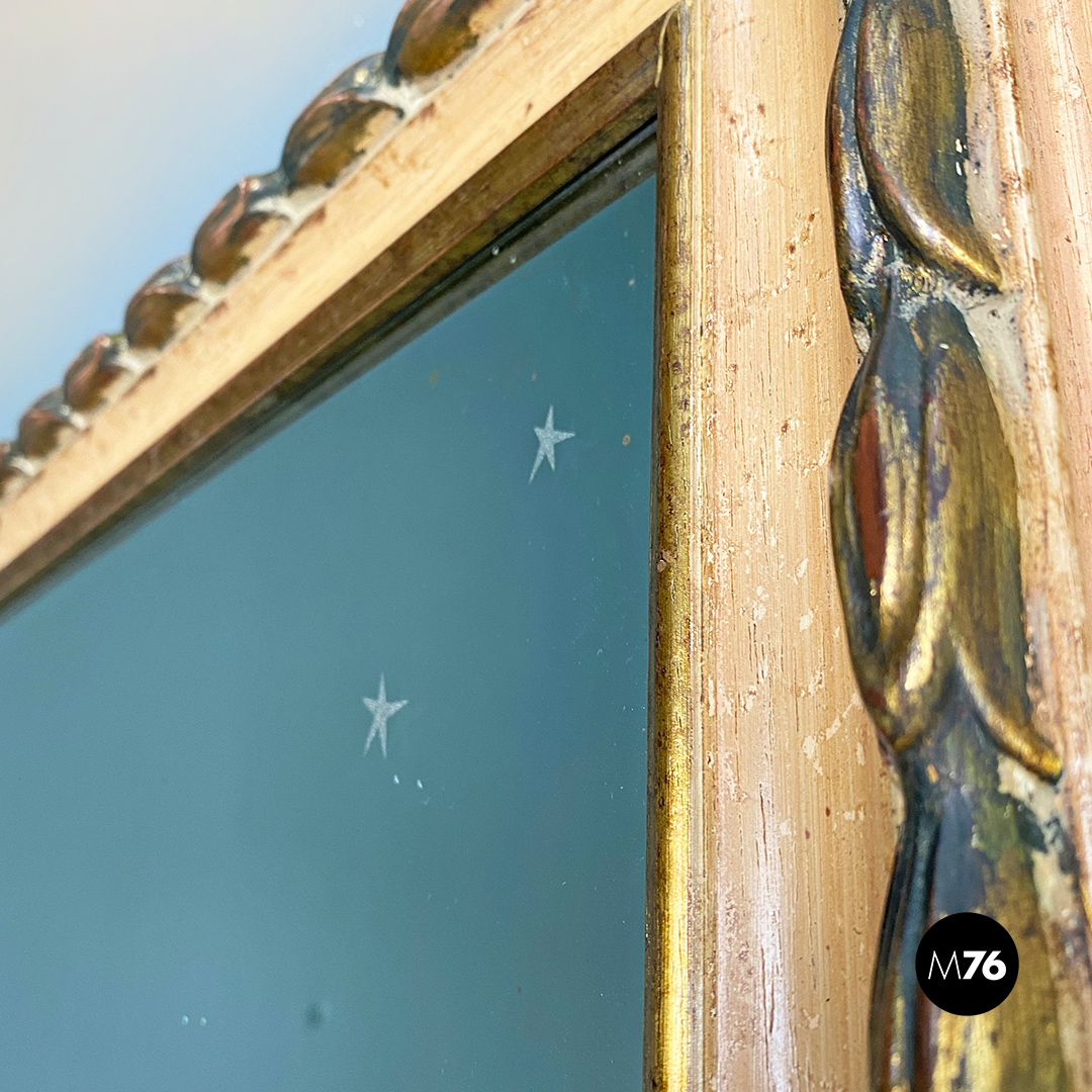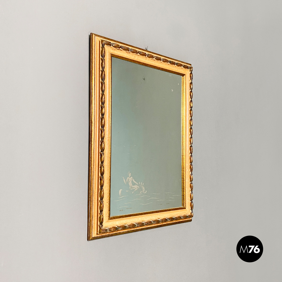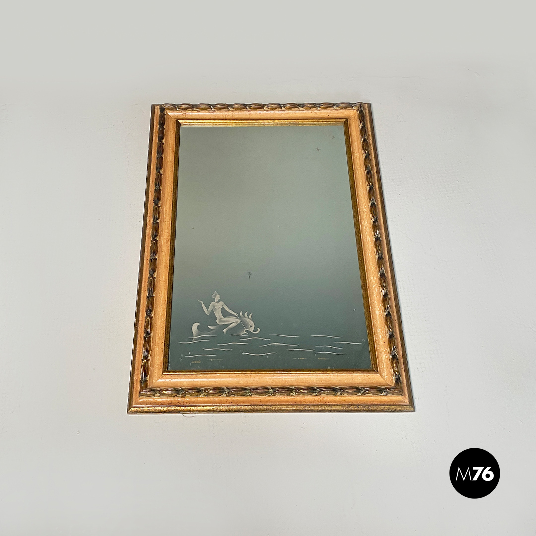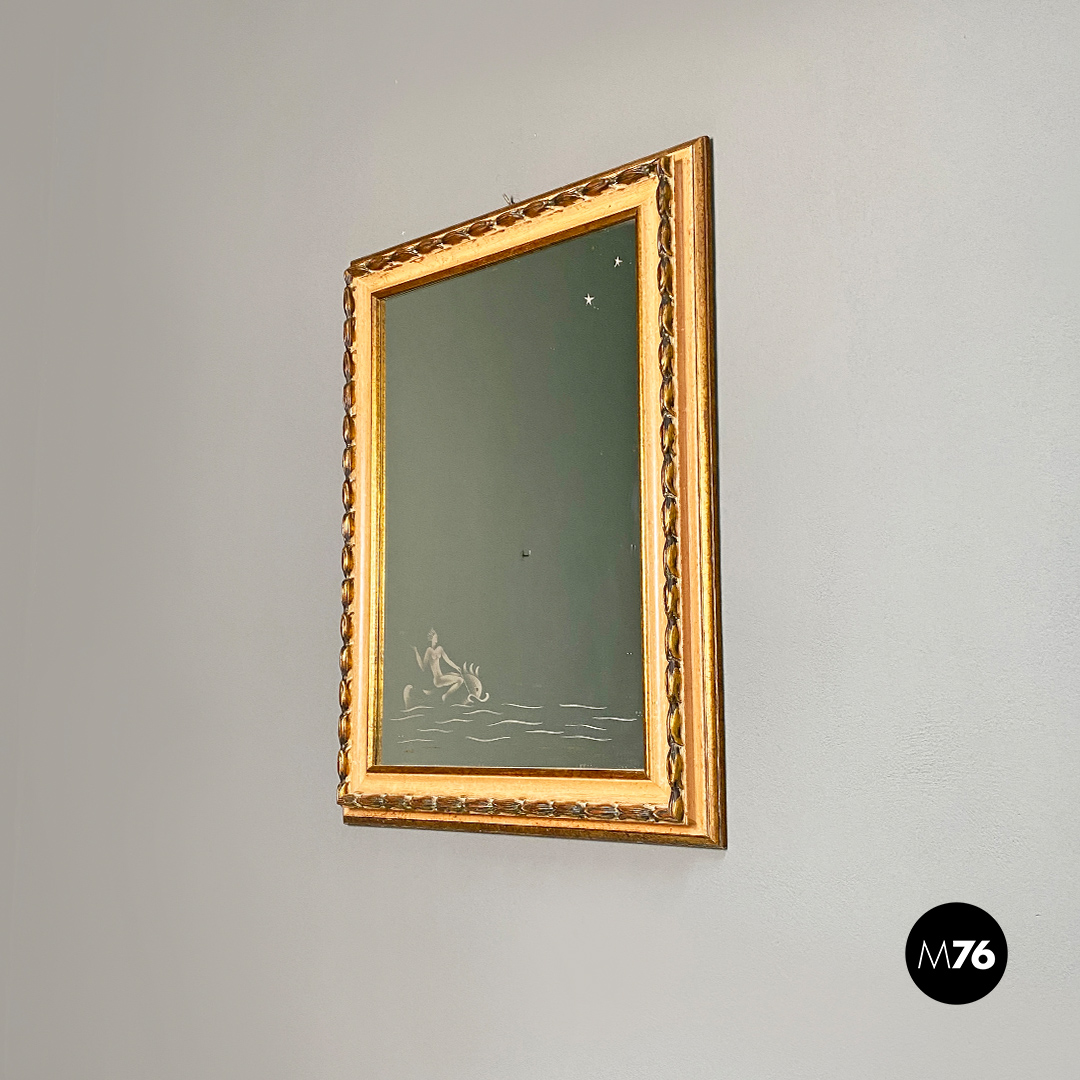 Specchio da parete di forma rettangolare, con disegno sul vetro dalle linee pontiane raffigurante una scena marina stilizzata, con due piccole stelle disegnate nella parte in alto a destra. Cornice in legno intagliato con lavorazione dorata in rilievo.