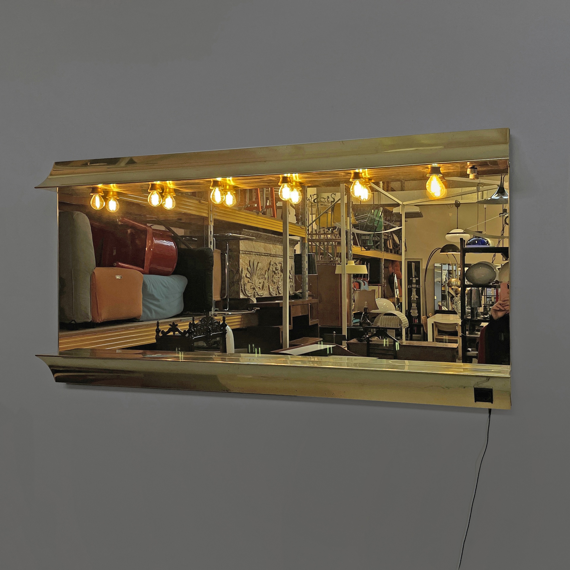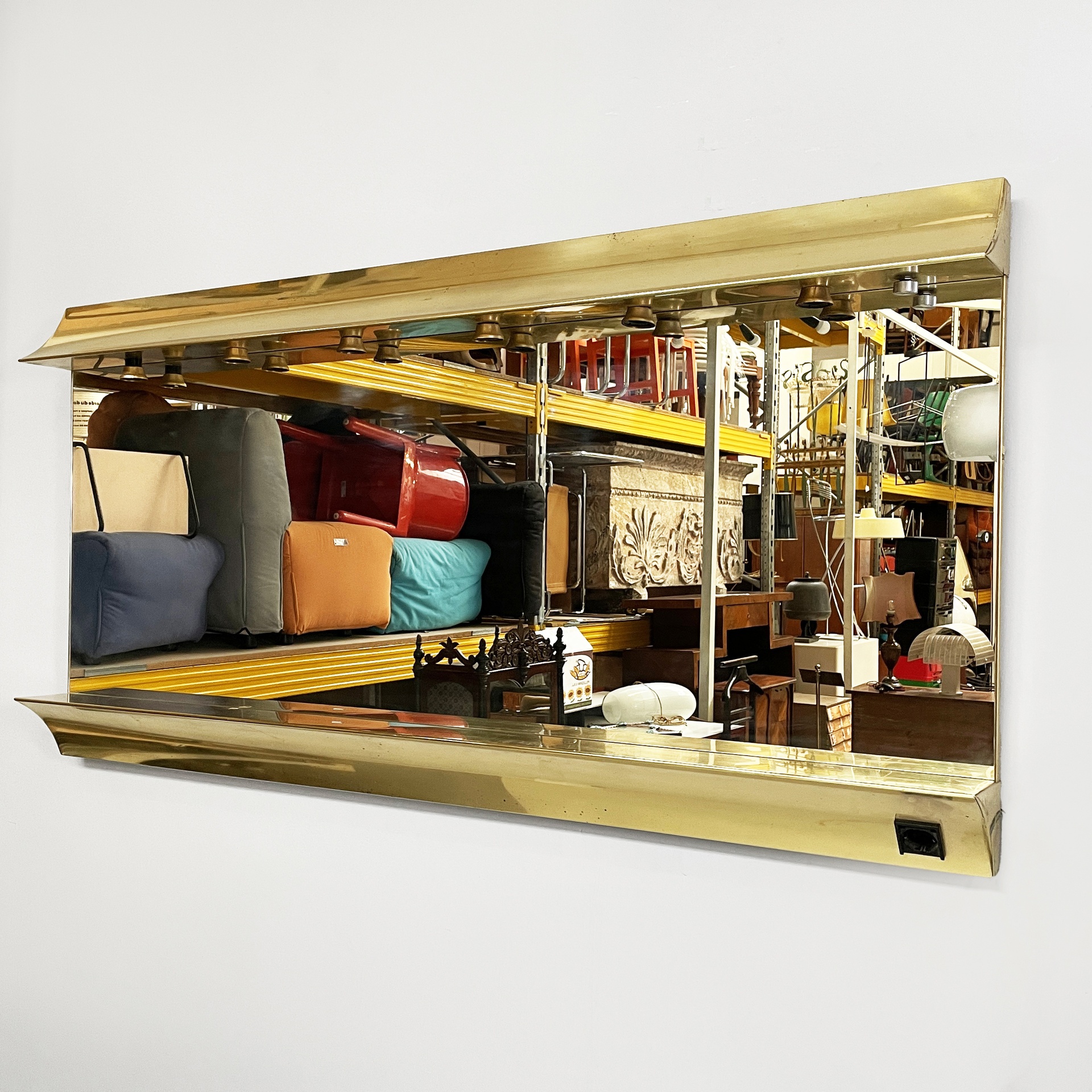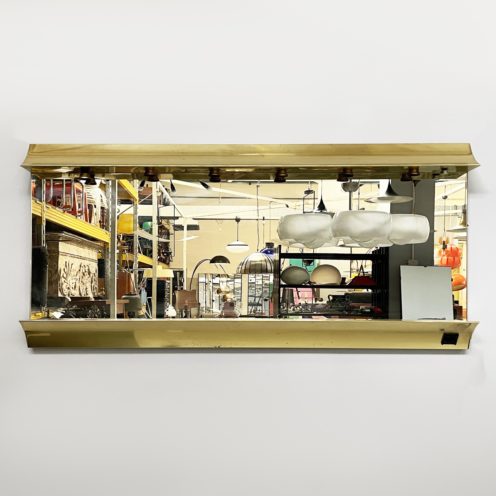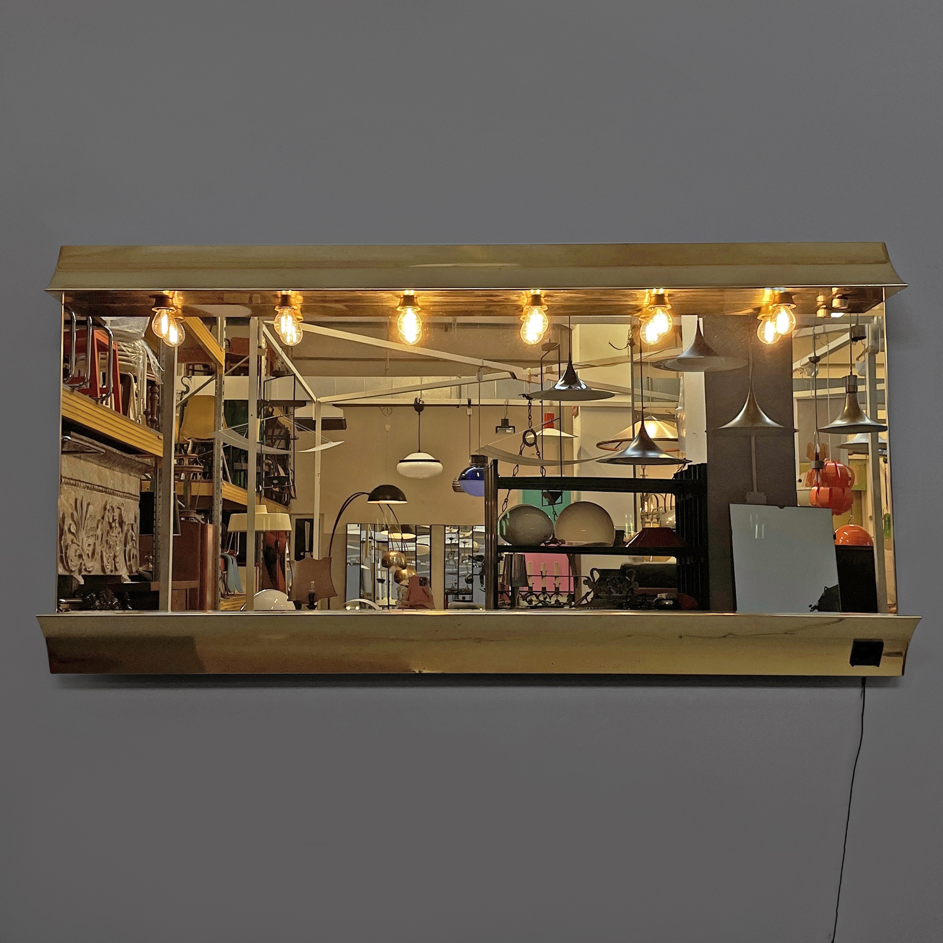 Specchio da parete con cornice a sbalzo in ottone. Sul profilo superiore sono sei lampade e l’interruttore tondo in metallo. Nella parte inferiore è presenta una presa di corrente.