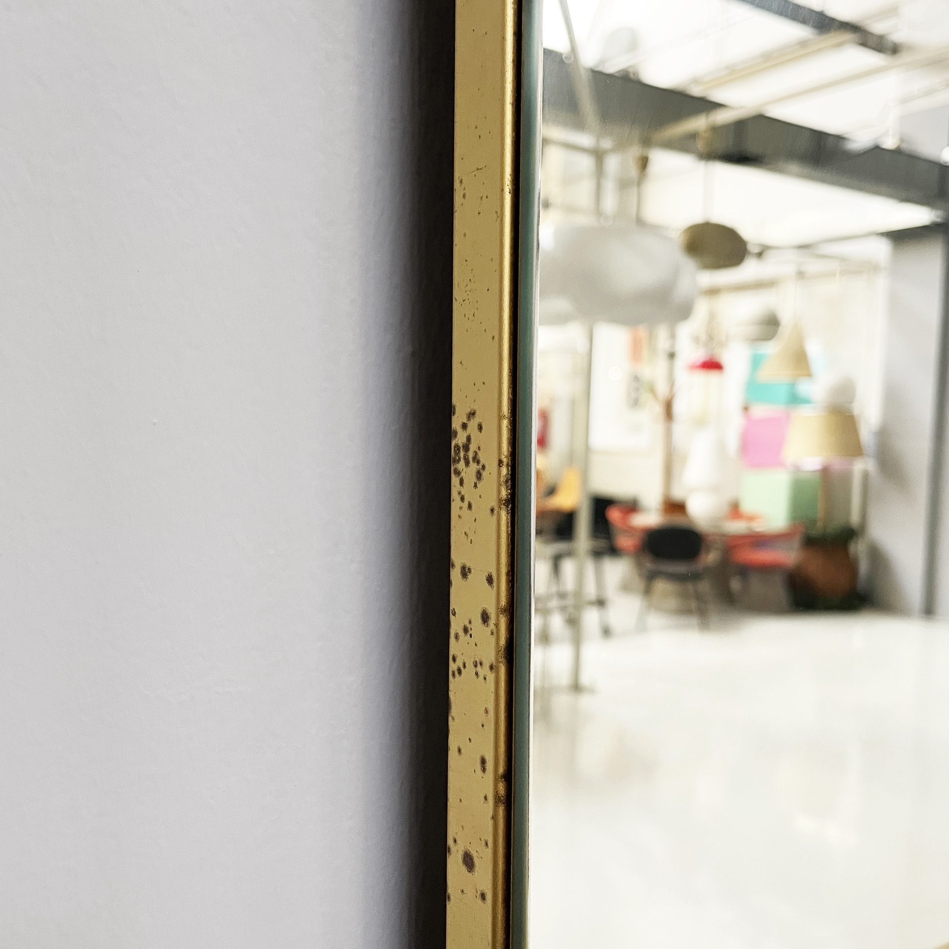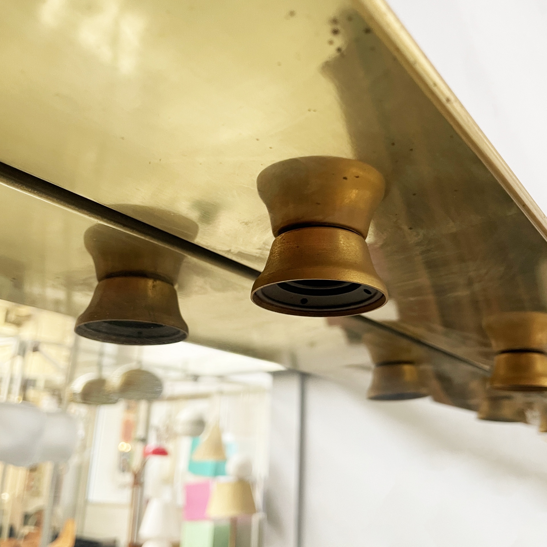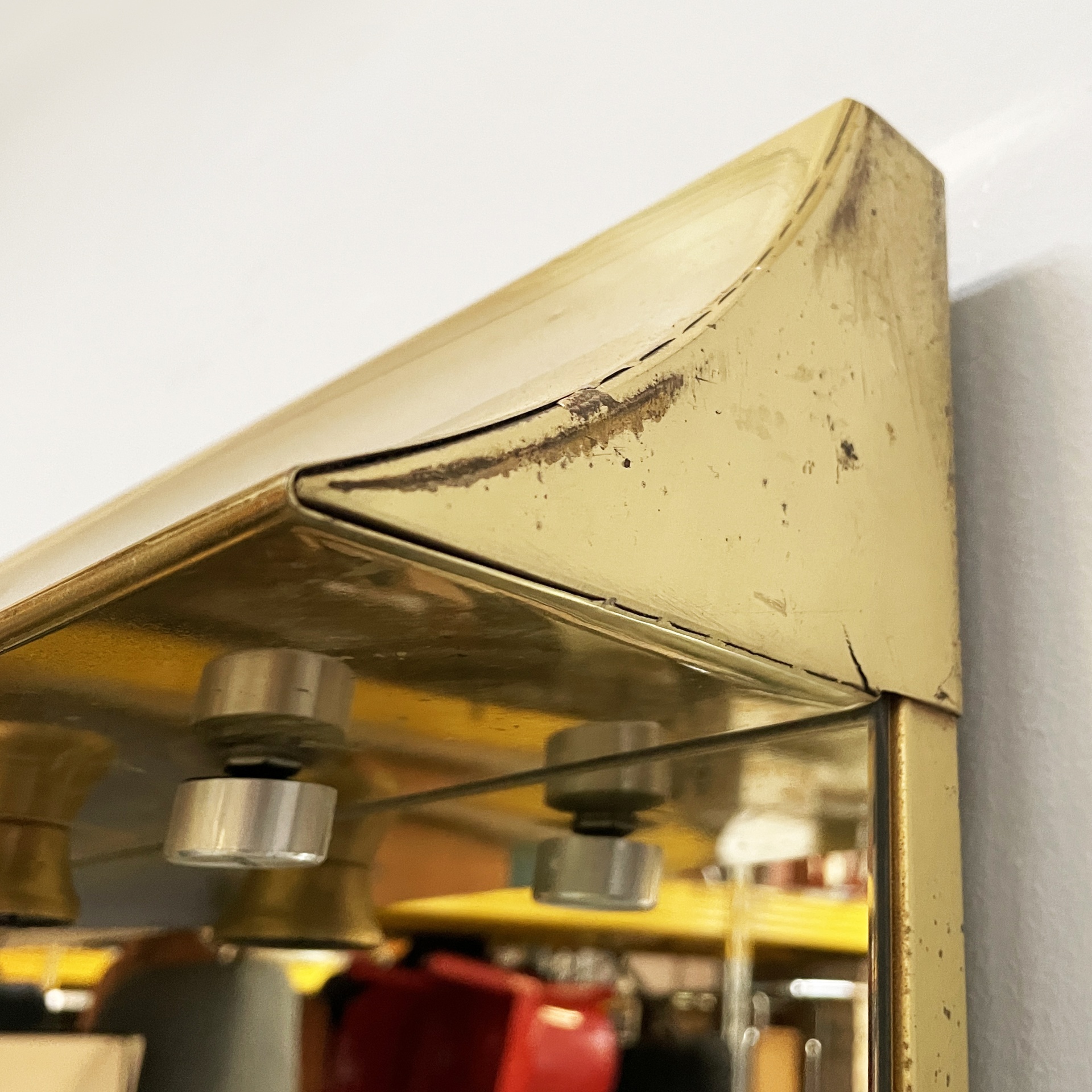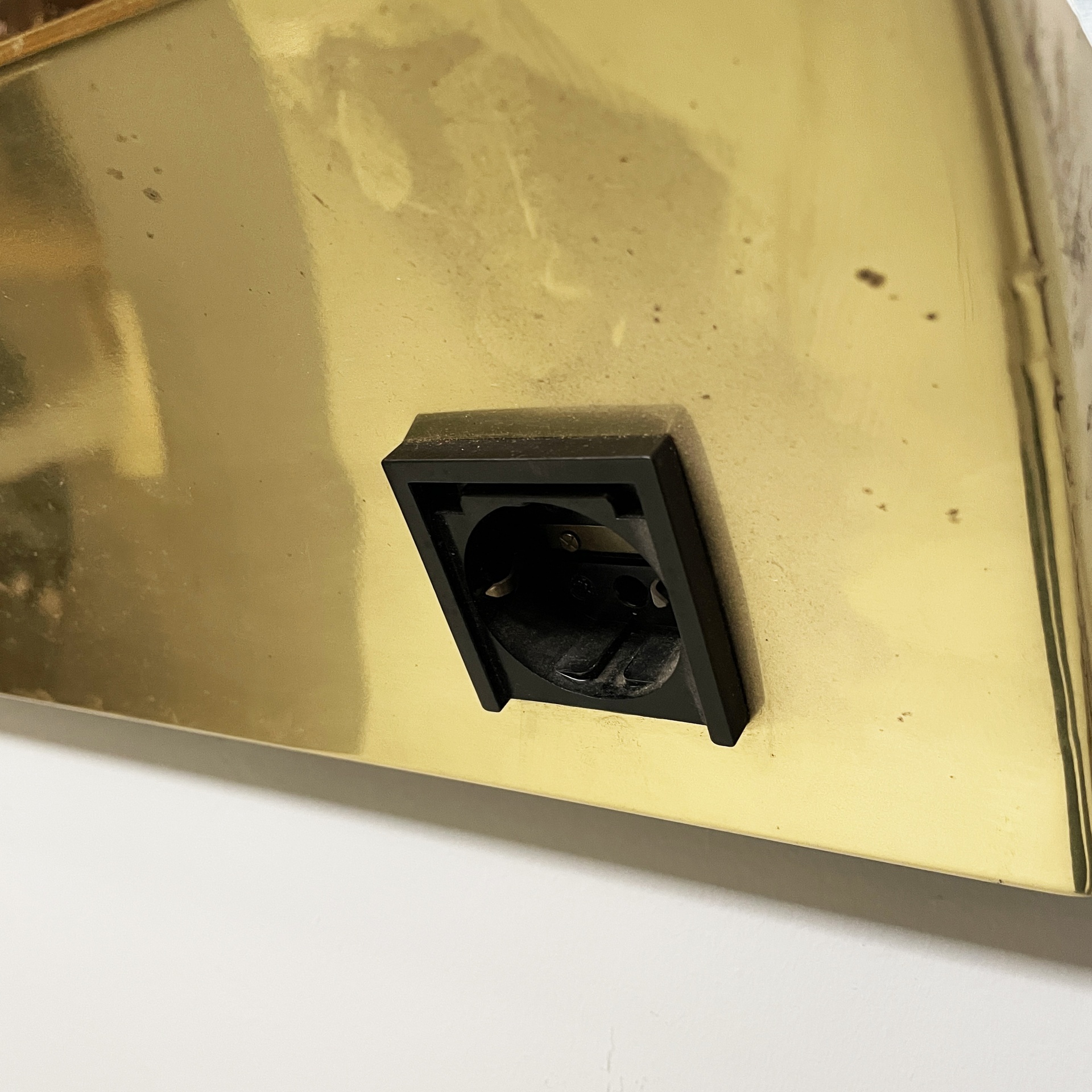 Specchio da parete con cornice a sbalzo in ottone. Sul profilo superiore sono sei lampade e l’interruttore tondo in metallo. Nella parte inferiore è presenta una presa di corrente.