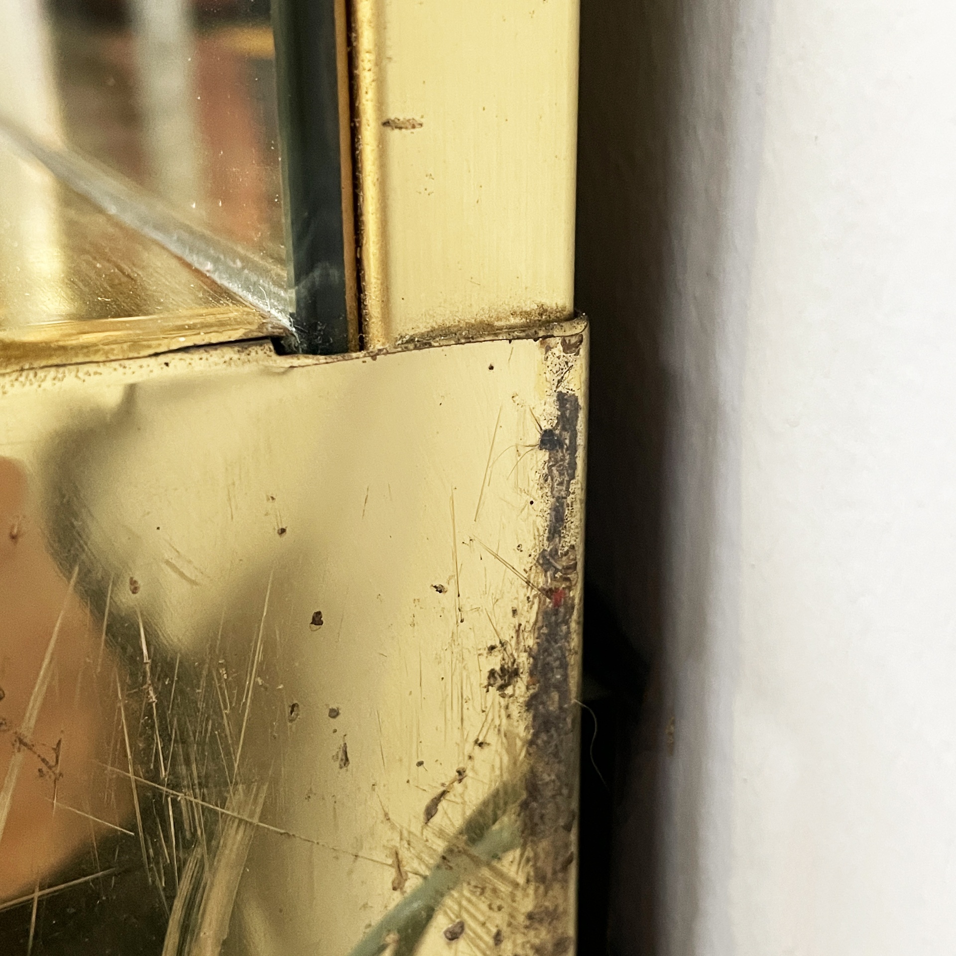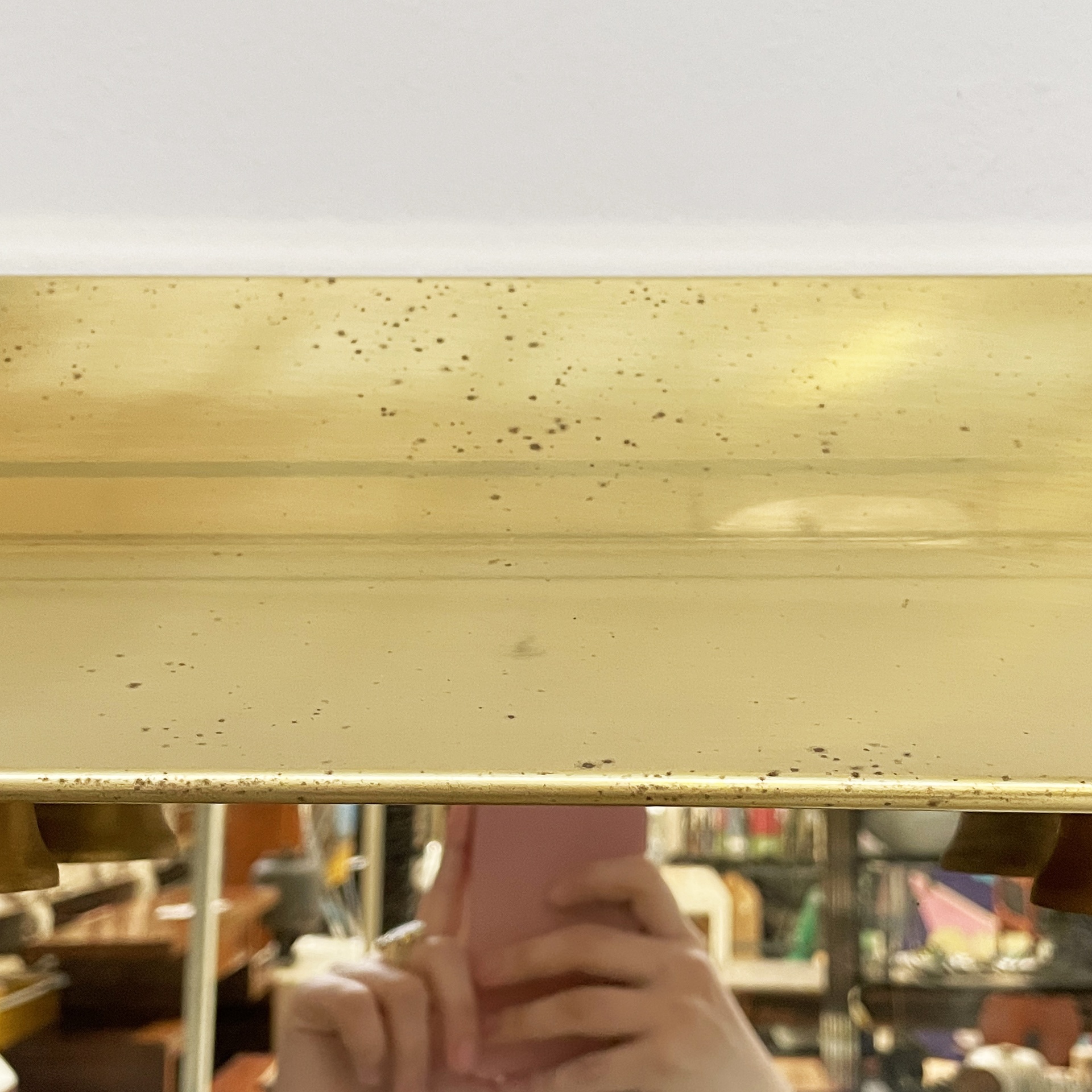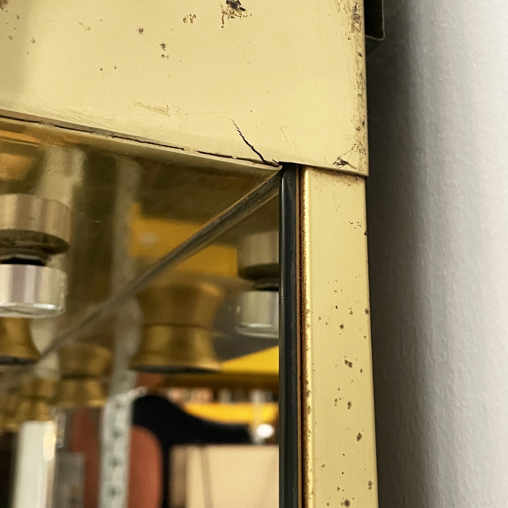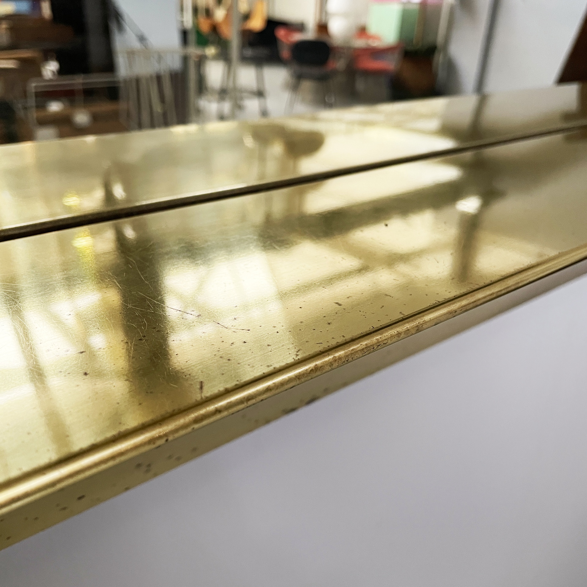 Specchio da parete con cornice a sbalzo in ottone. Sul profilo superiore sono sei lampade e l’interruttore tondo in metallo. Nella parte inferiore è presenta una presa di corrente.