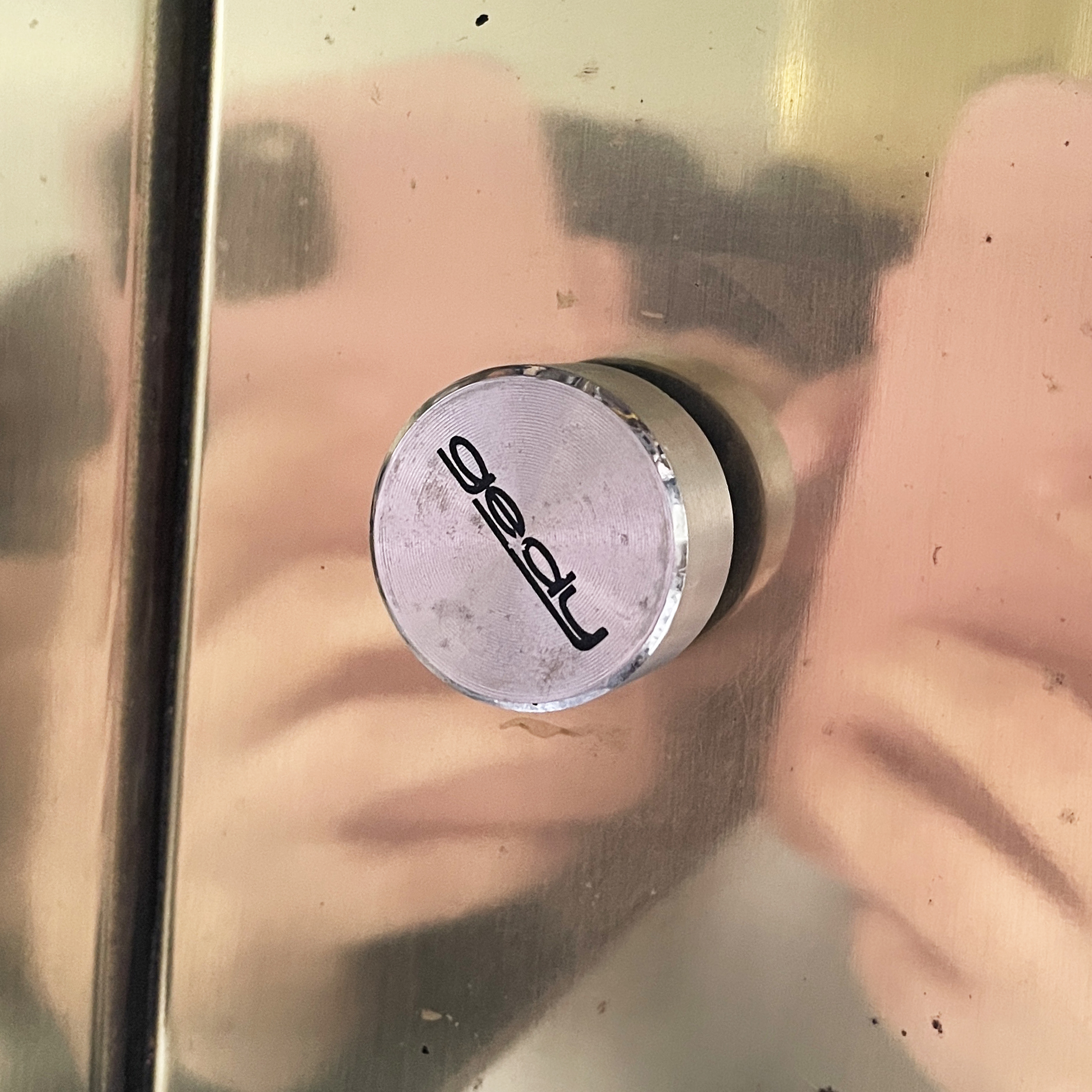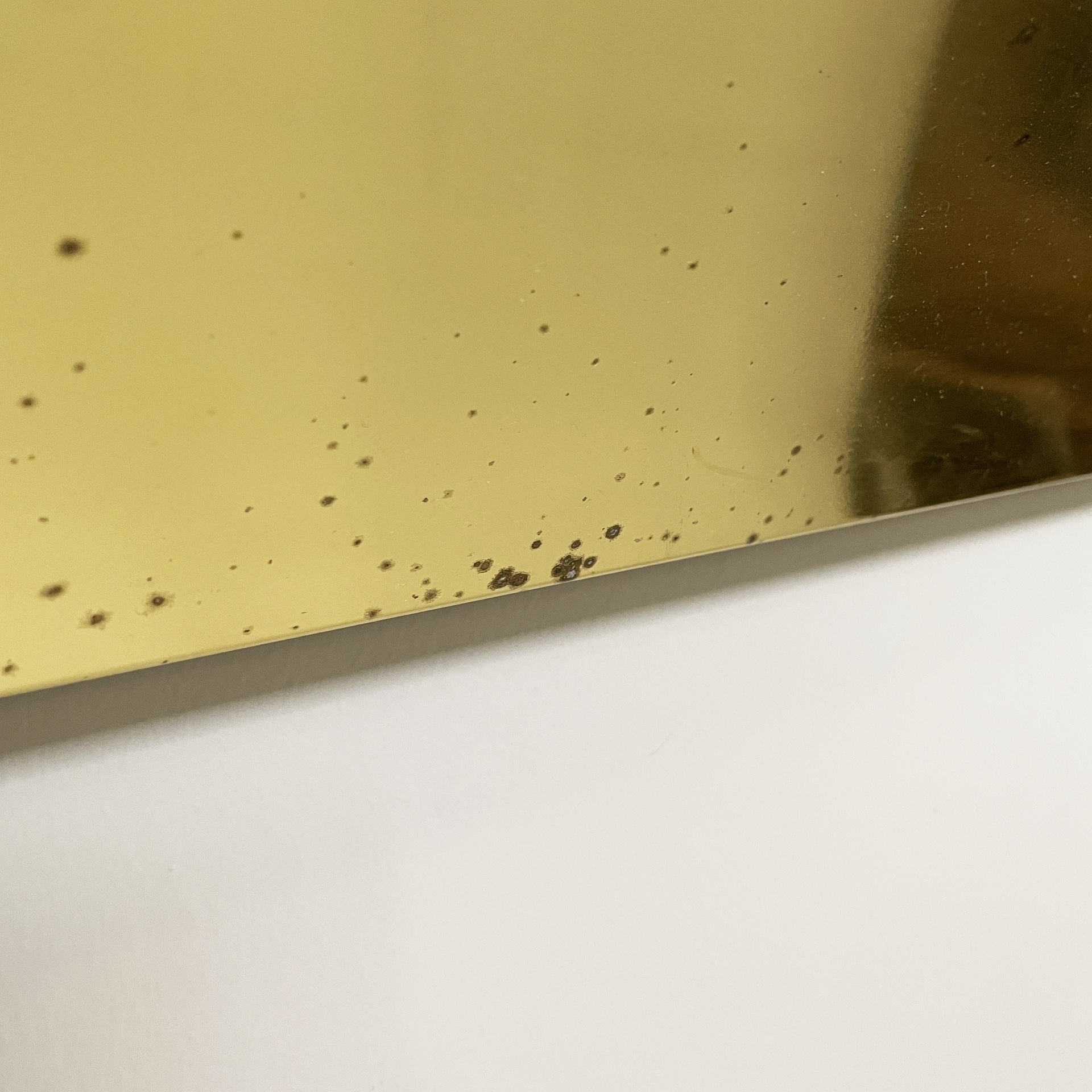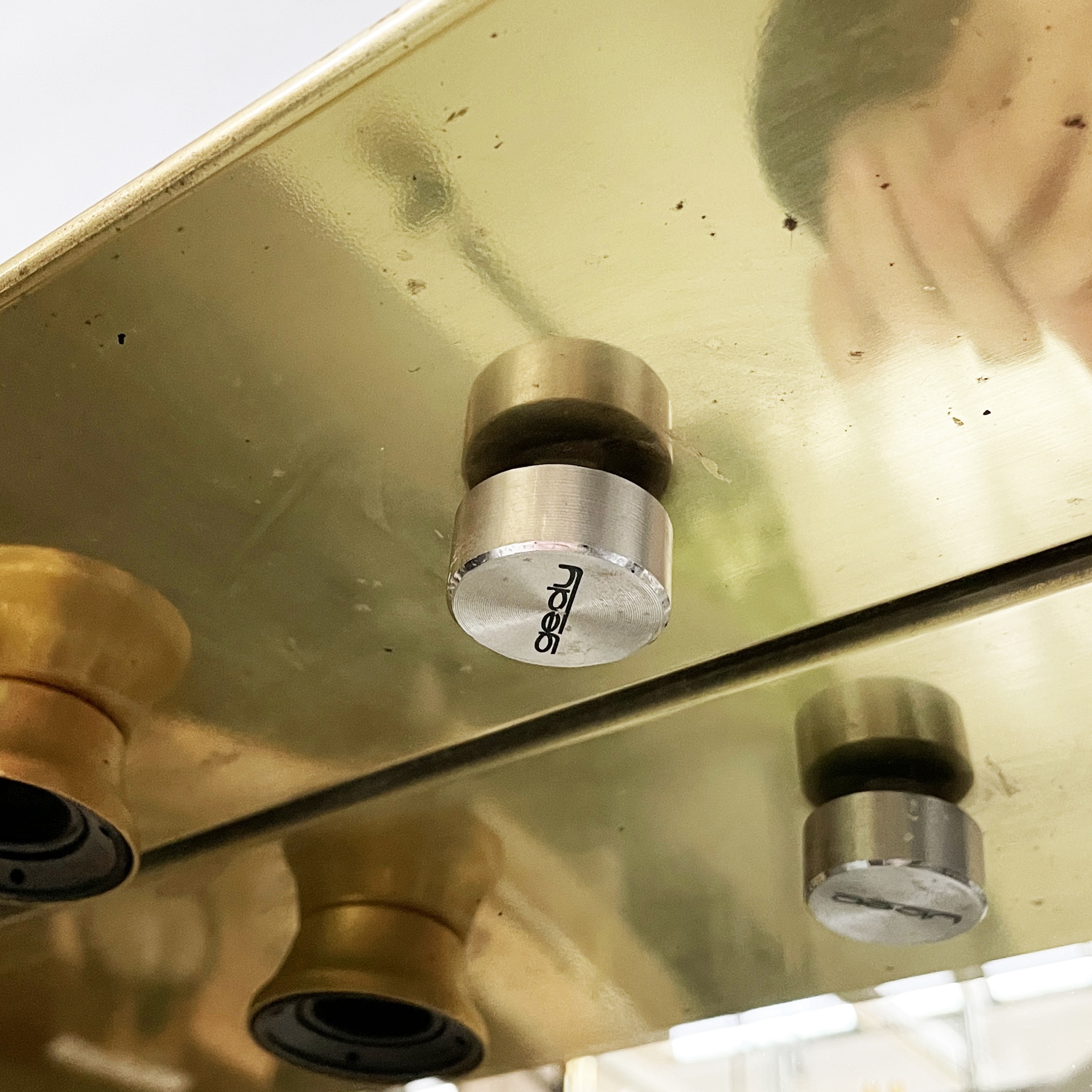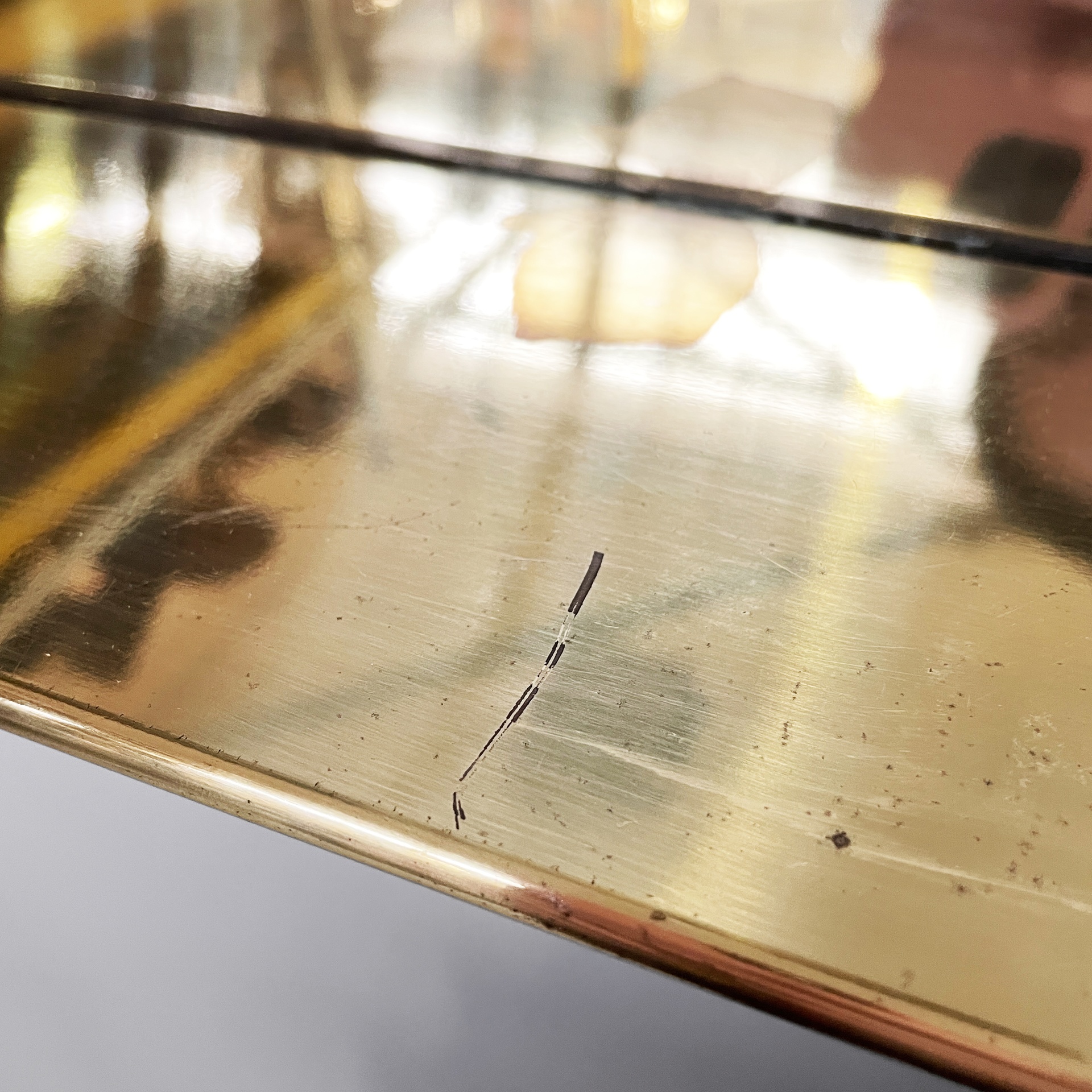 Specchio da parete con cornice a sbalzo in ottone. Sul profilo superiore sono sei lampade e l’interruttore tondo in metallo. Nella parte inferiore è presenta una presa di corrente.