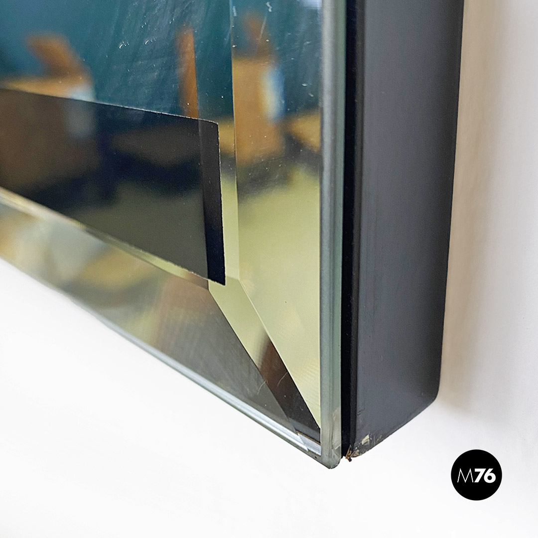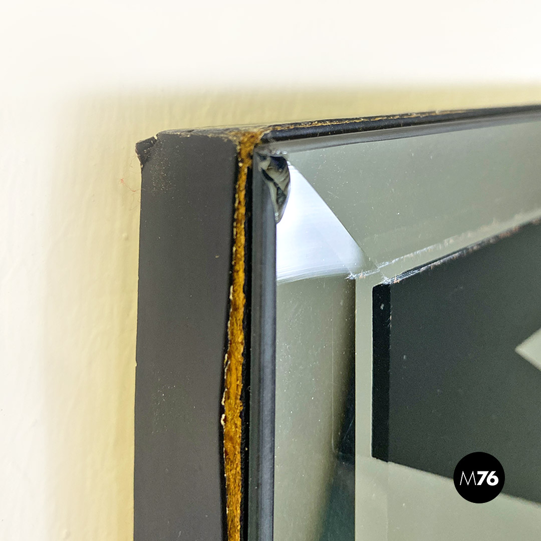 Specchio da parete di forma rettangolare, con vetro specchiato e motivo geometrico in nero, su fondo in legno e bordo molato.