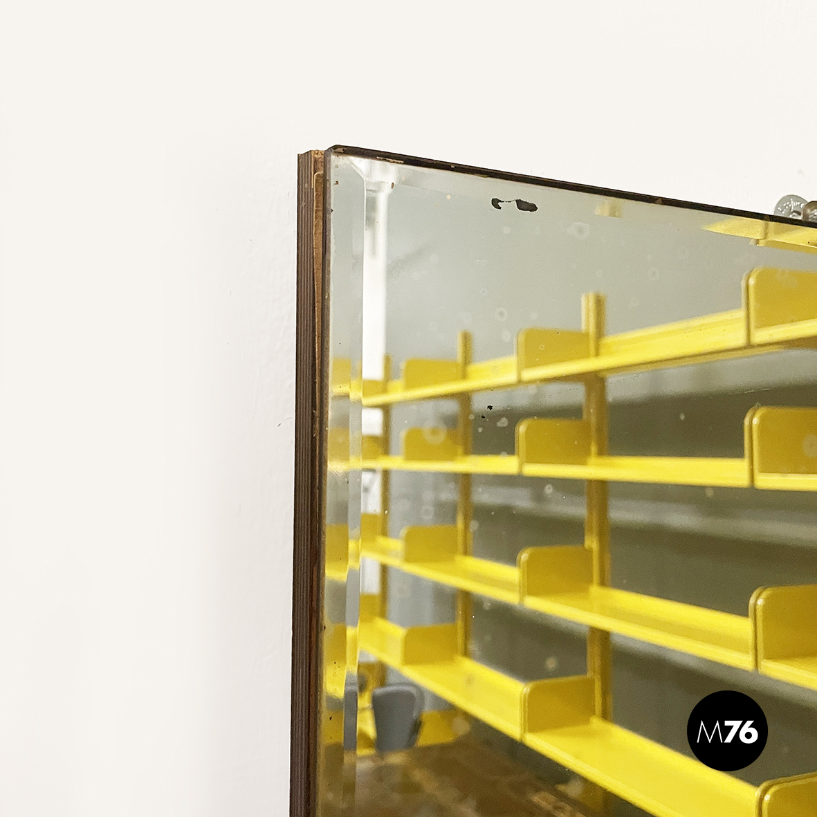Specchio da parete a forma rettangolare. La struttura dello lo specchio è in legno con cinque ganci in ottone brunito, i quali permettono allo specchio di rimanere fissato alla struttura. Nella parte superiore è presente un occhiello in metallo per poterlo appendere a parete.