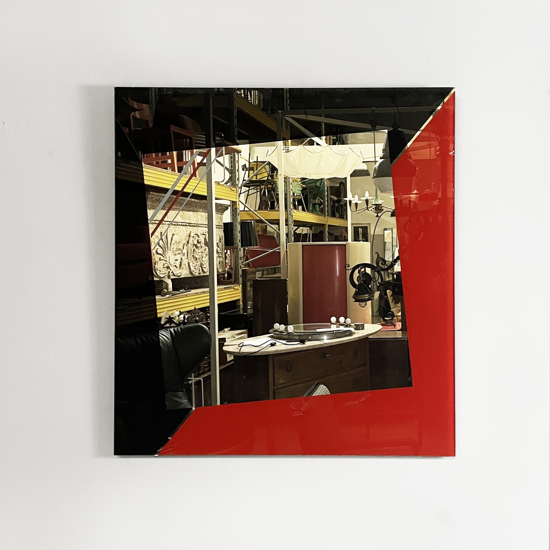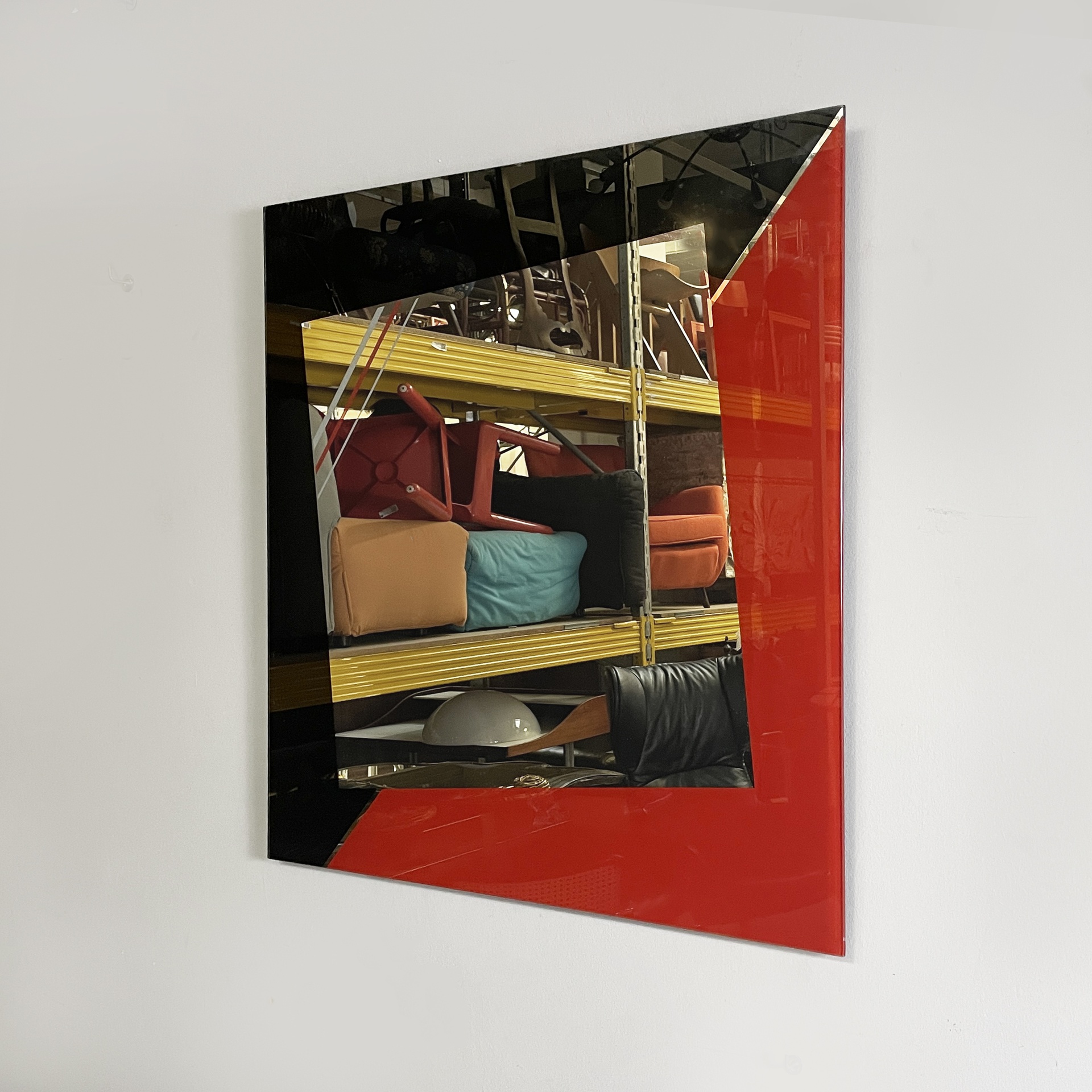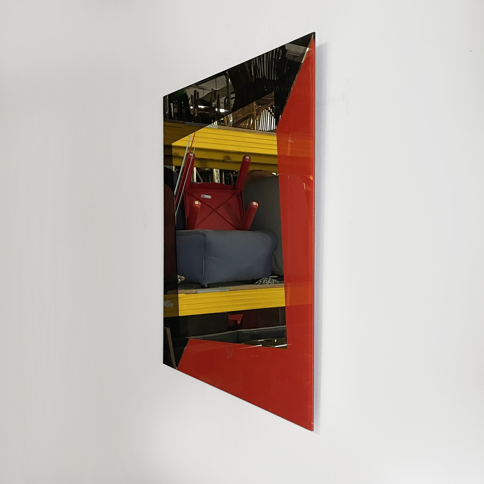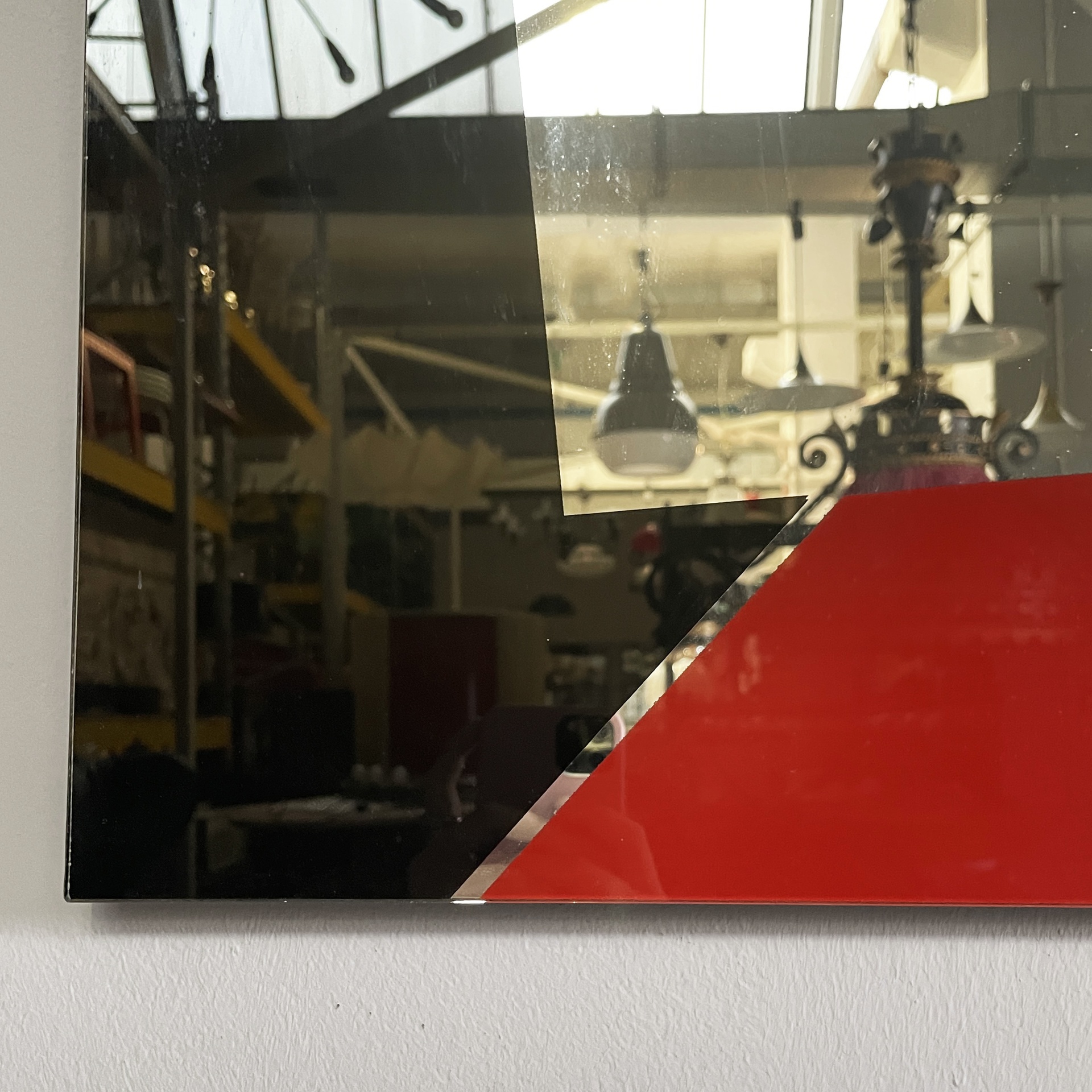 Specchio da parete rettangolare con disegno grafico in rosso e nero sulla cornice. In un angolo sono presenti delle strisce decorative in rosso e grigio chiaro.